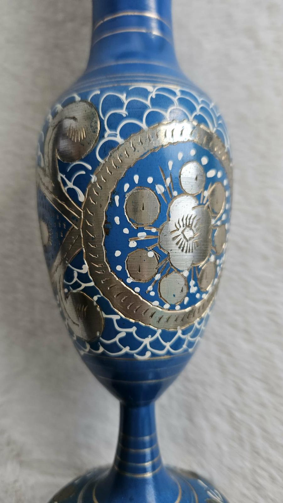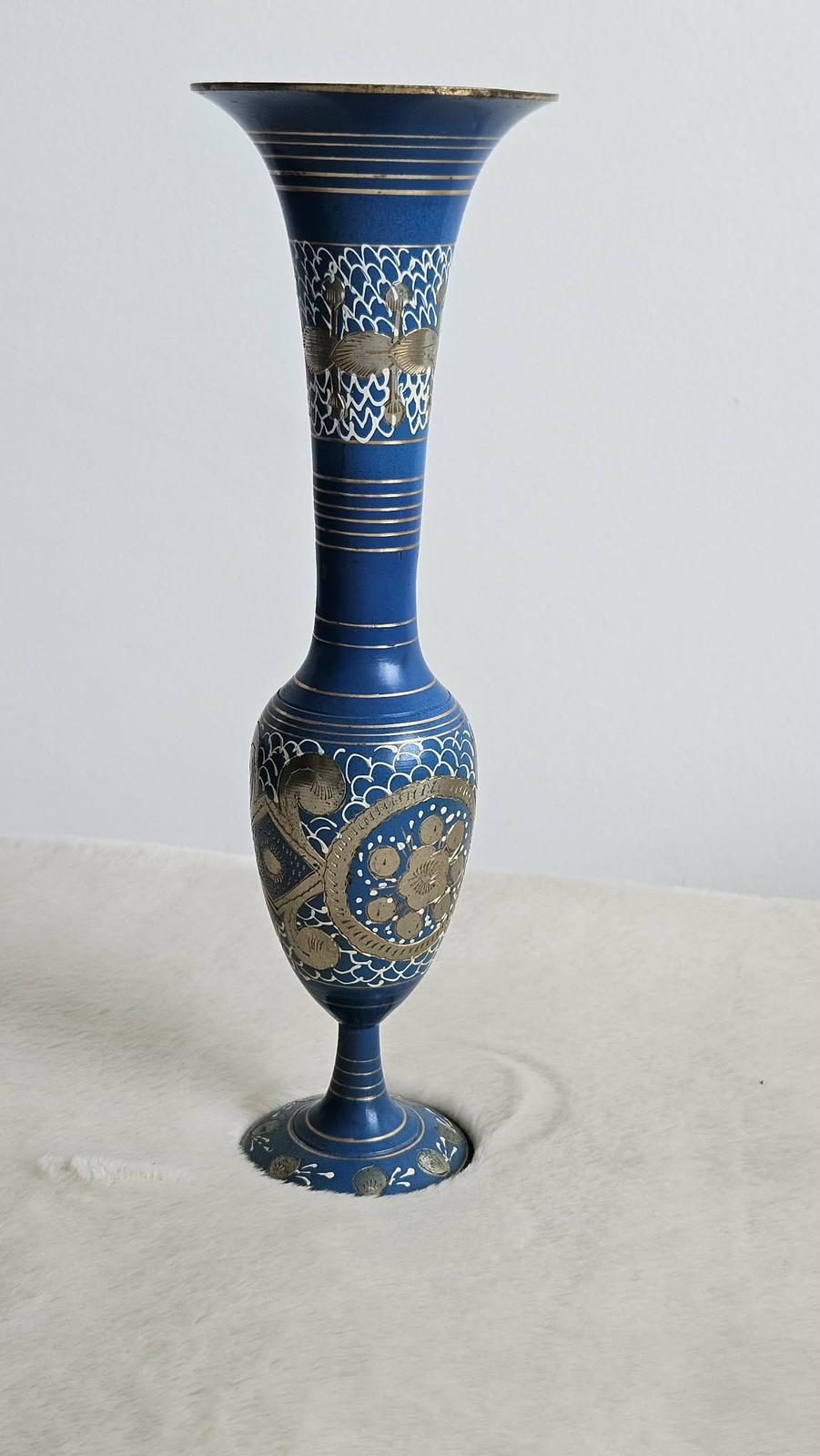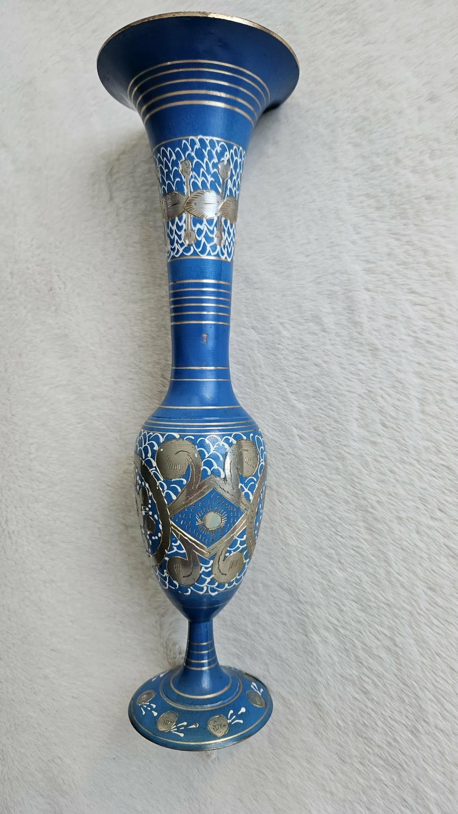 Krásna, ručne zdobená kovová váza v kráľovskej modrej farbe. Váza je dekorovaná jemnými striebornými a zlatými kovovými prvkami s detailným gravírovaním a bielymi ornamentmi, ktoré jej dodávajú jedinečný orientálny vzhľad. Ide o kúsok dovezený z Ázie (myslím, že Indie) v 80-tych rokoch 20. storočia