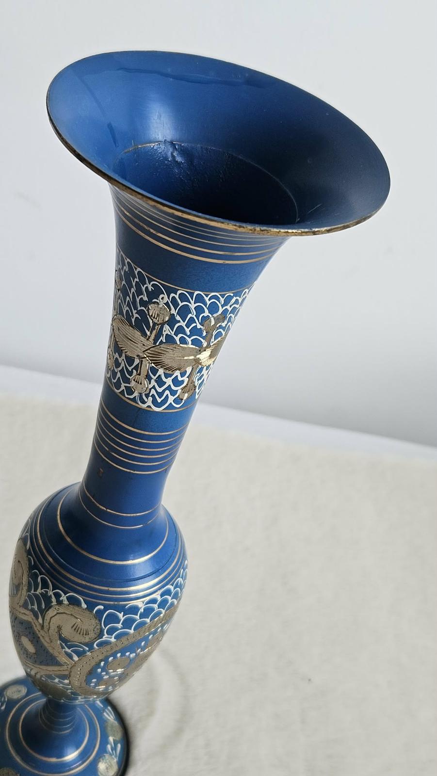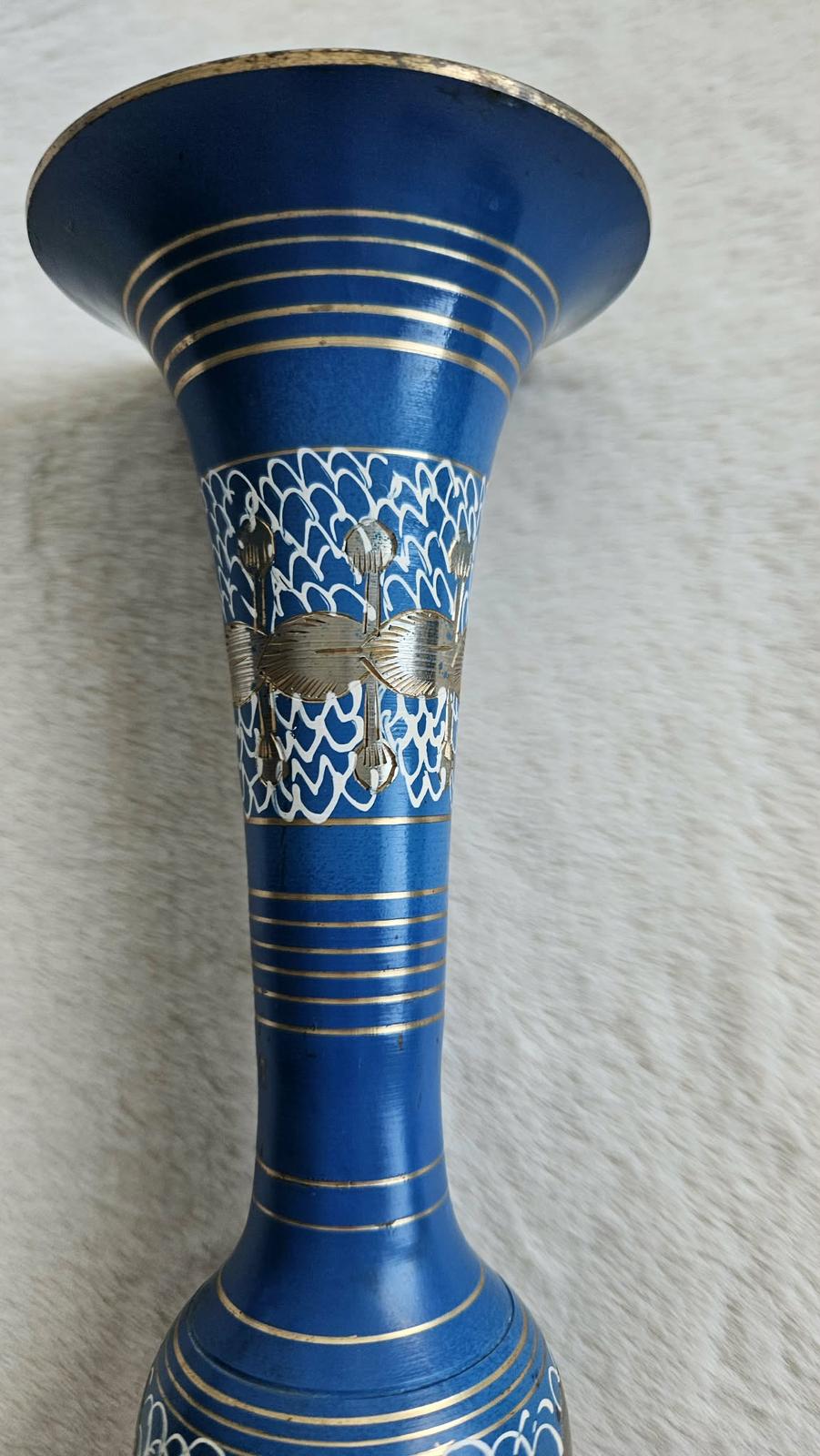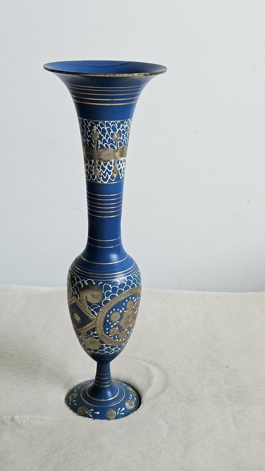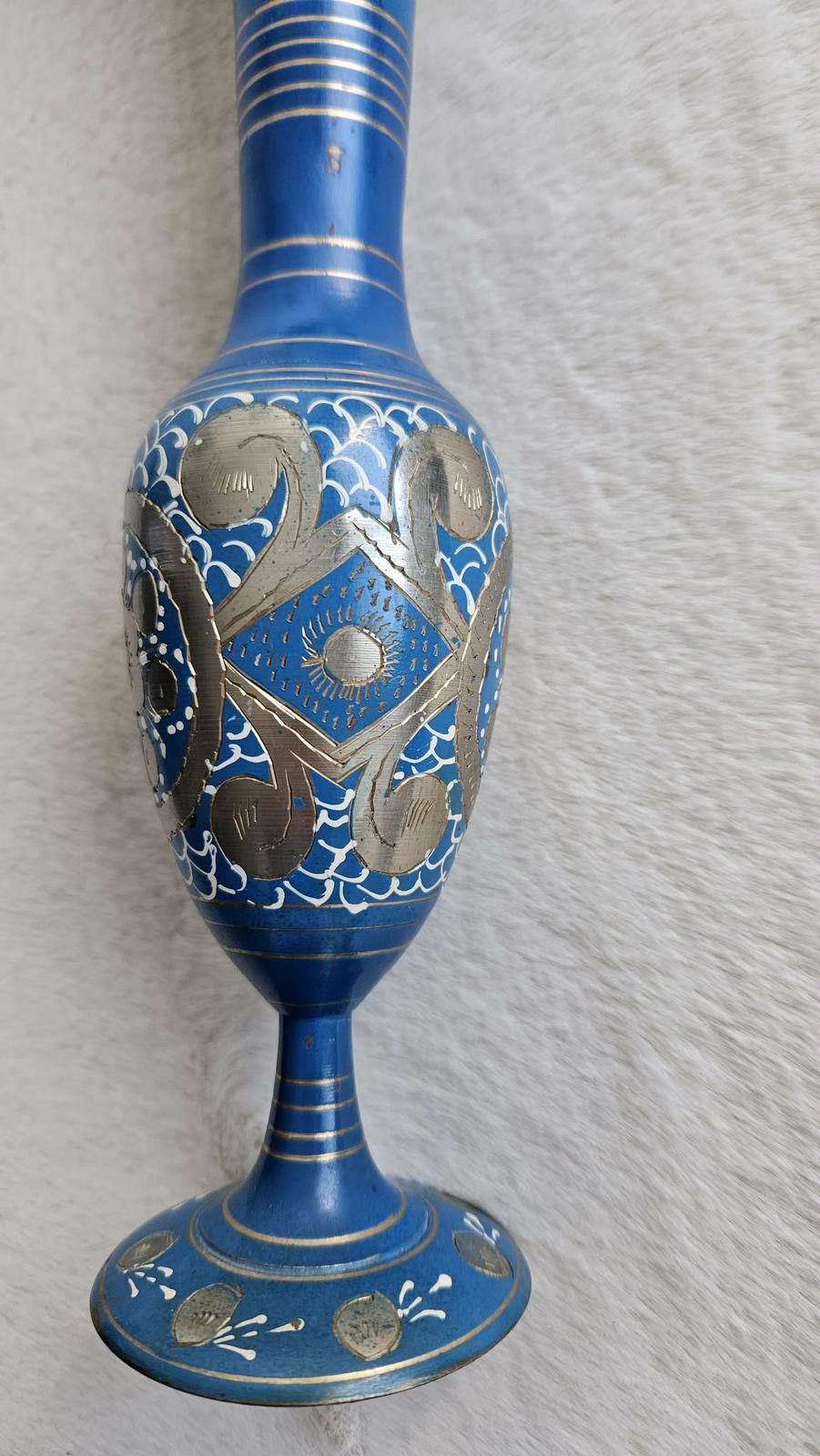 Krásna, ručne zdobená kovová váza v kráľovskej modrej farbe. Váza je dekorovaná jemnými striebornými a zlatými kovovými prvkami s detailným gravírovaním a bielymi ornamentmi, ktoré jej dodávajú jedinečný orientálny vzhľad. Ide o kúsok dovezený z Ázie (myslím, že Indie) v 80-tych rokoch 20. storočia