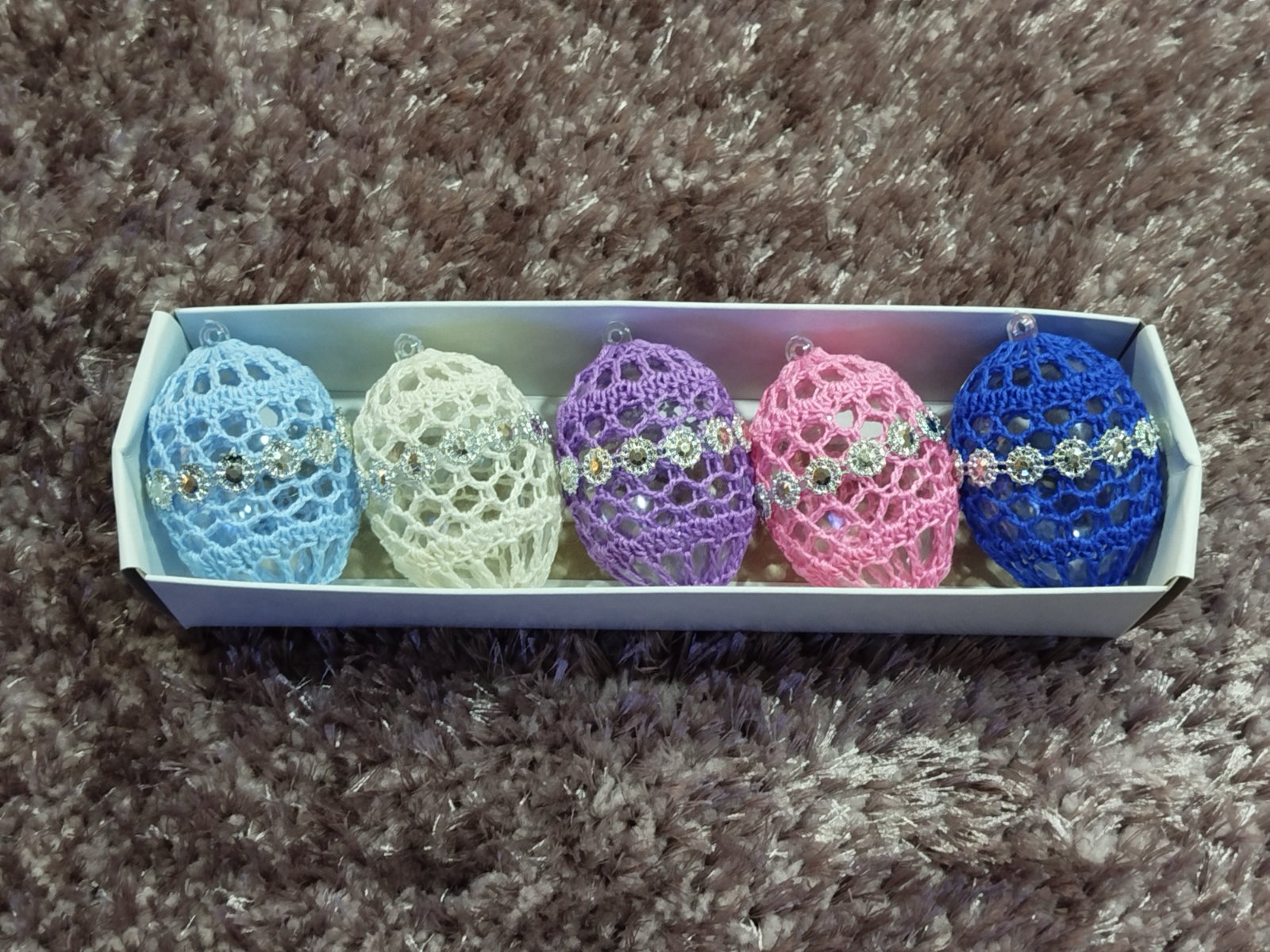 Háčkované na plastovom vajíčku. Uháčkované zo 100 % bavlnenej priadze. Cena je uvedená za 5 kusov.