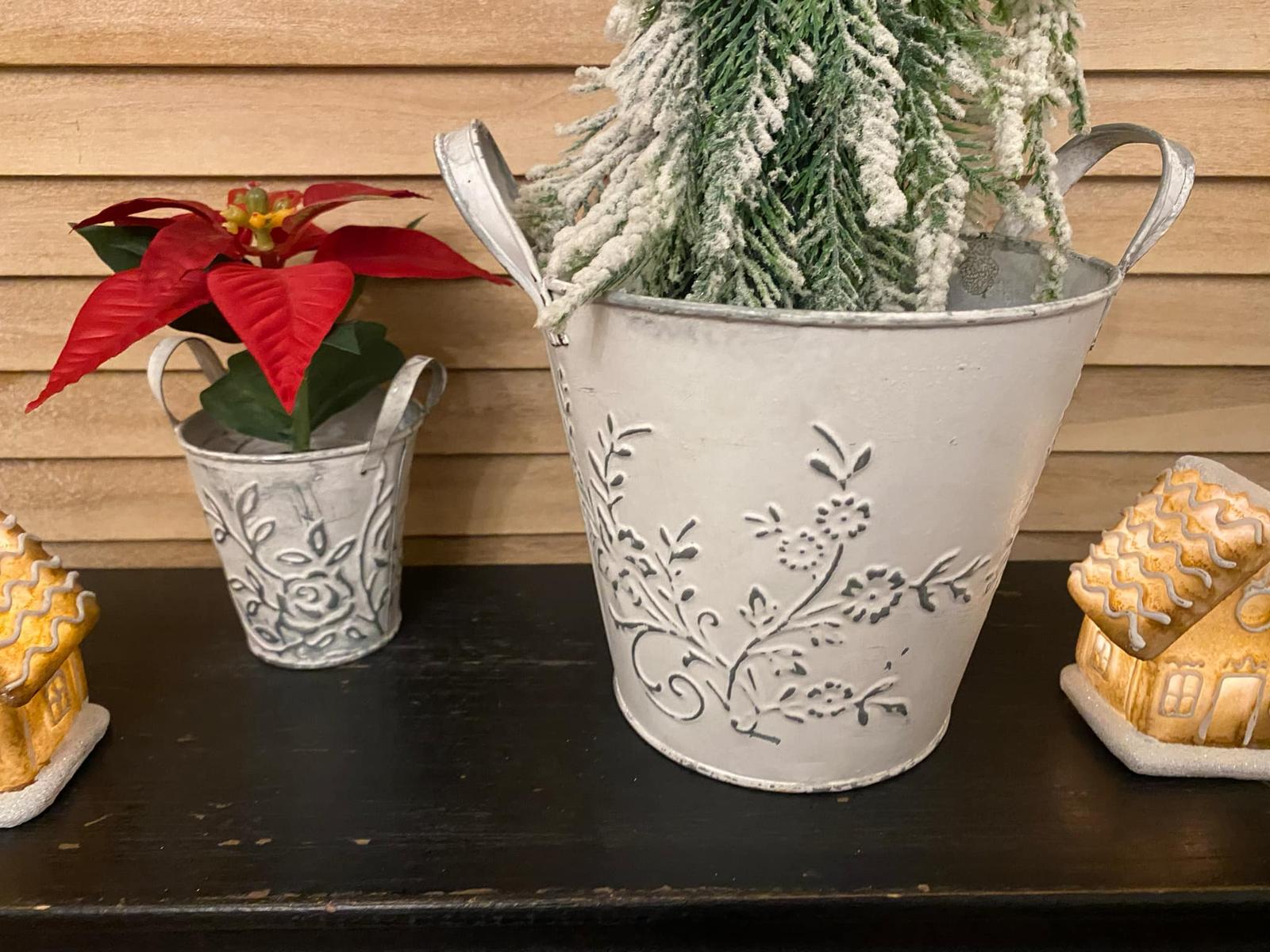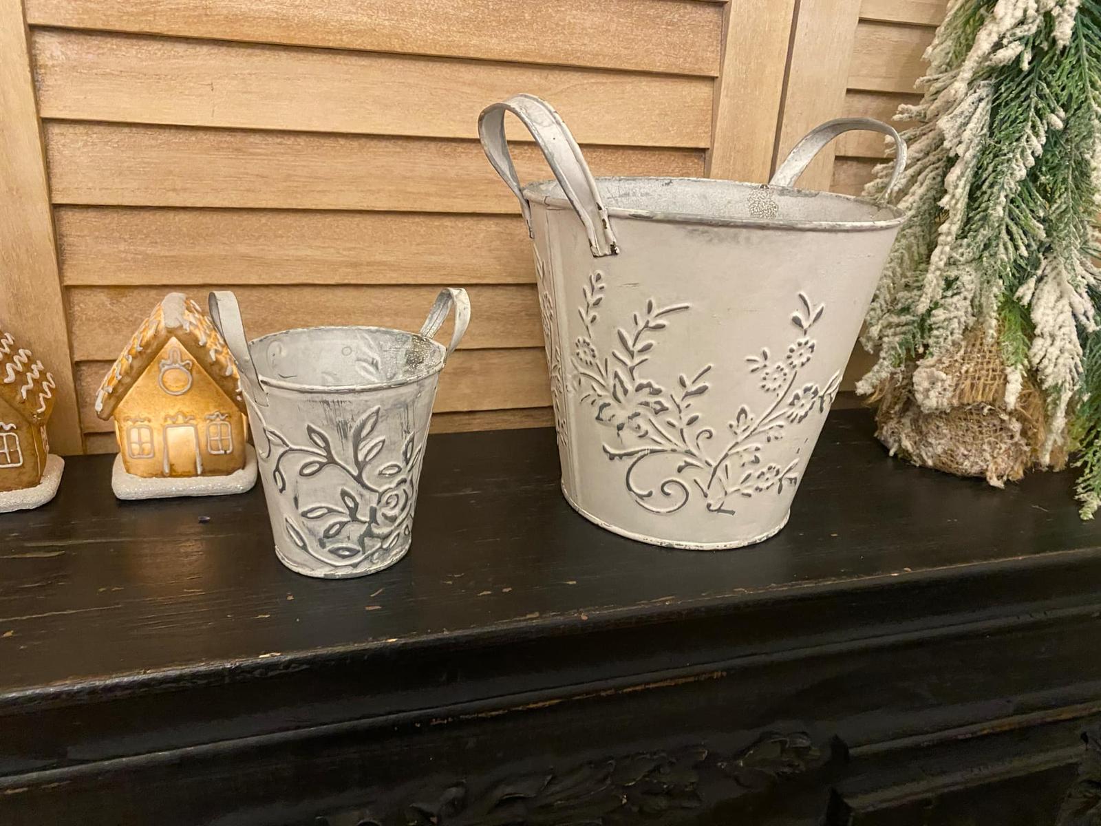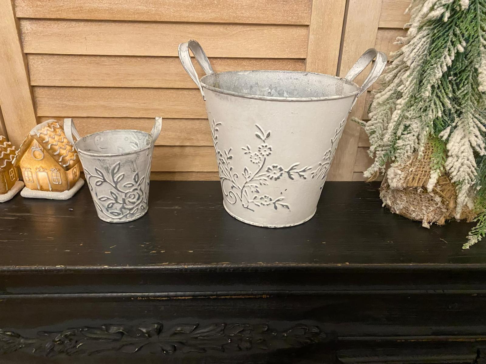Predám plechové obaly na kvety s uškami 2 ks ( sada ). Ucho na kvetináči umožňuje zavesiť kvetináč. Väčší kvetináč bol už použitý