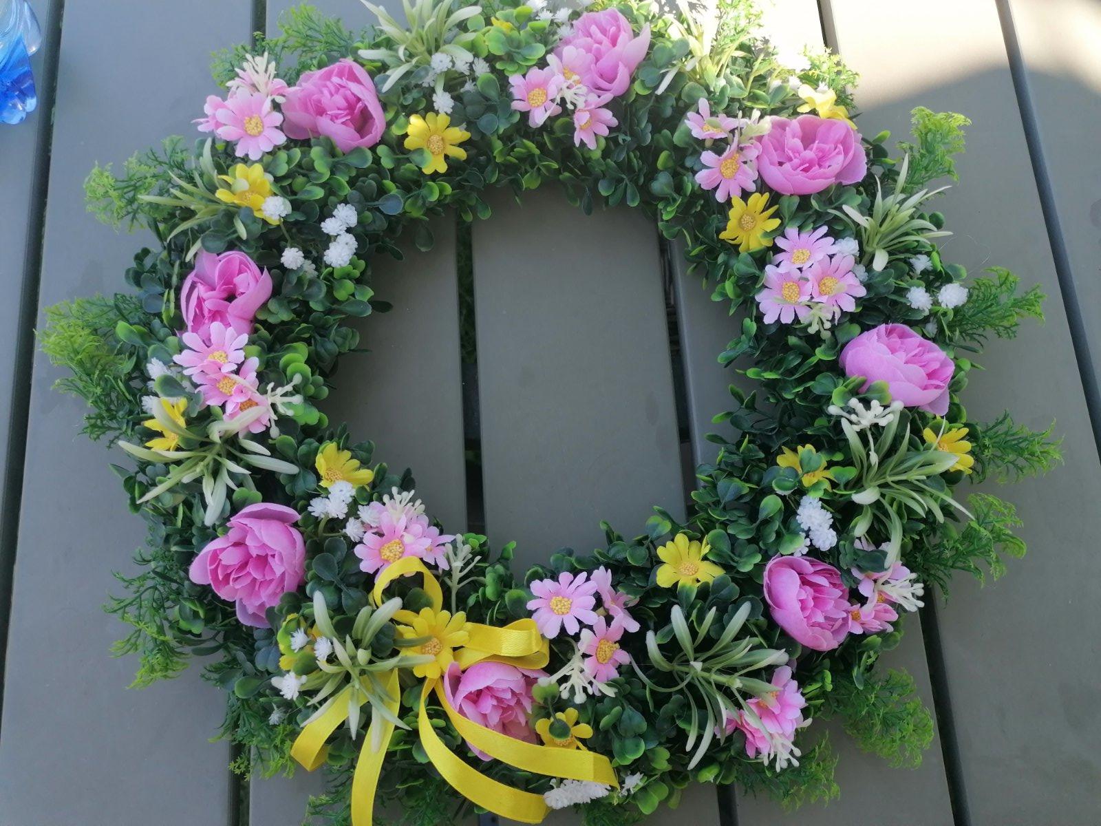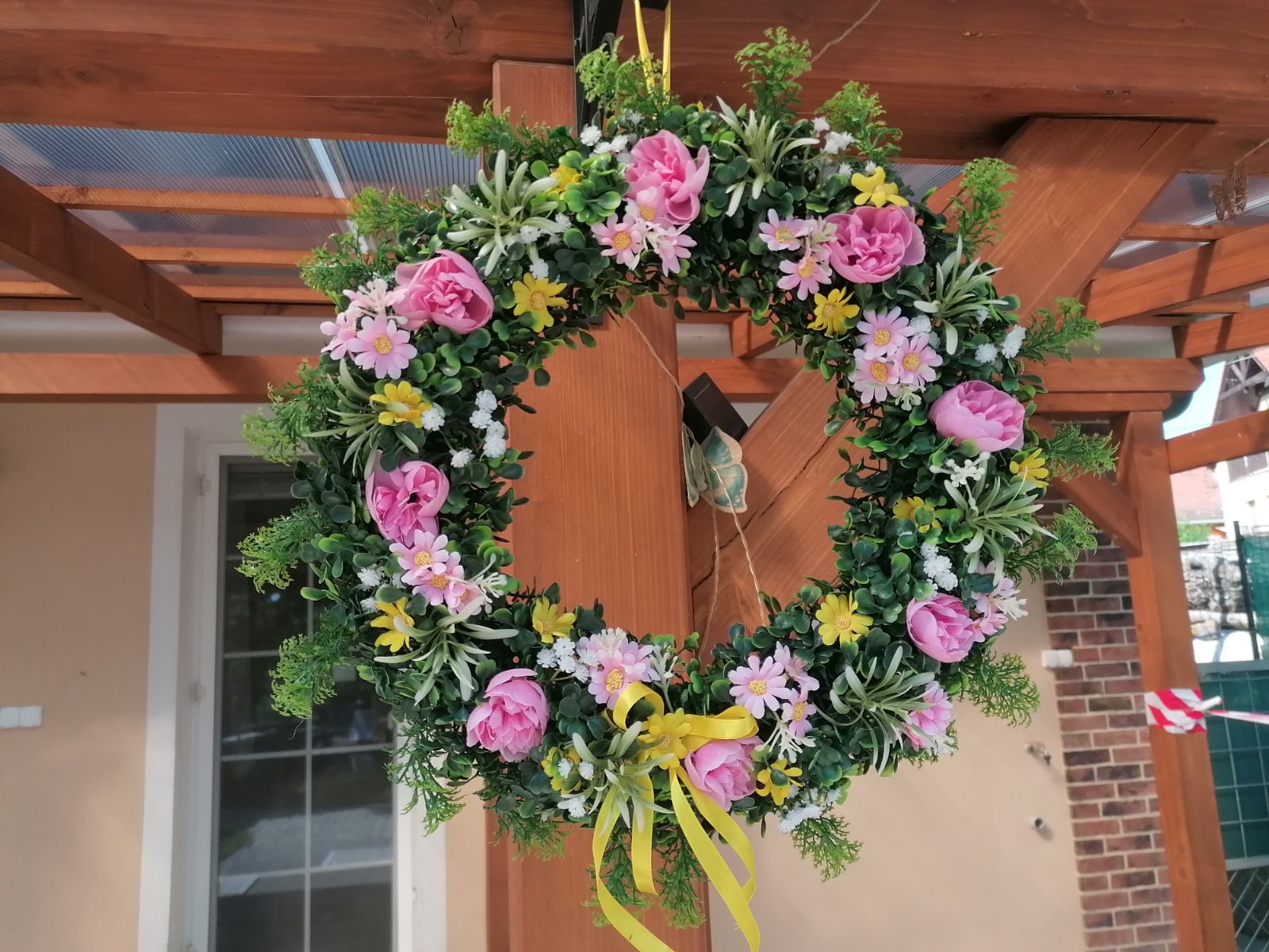 Predám krasny visiaci jarný veniec. Priemer je 40 cm Materiál je trvácny.