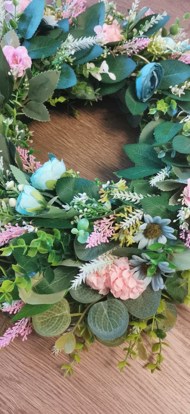 viazaný veniec na dvere, s umelými kvetmi, v ružovej a modrej farbe, priemer priblizne 46cm
