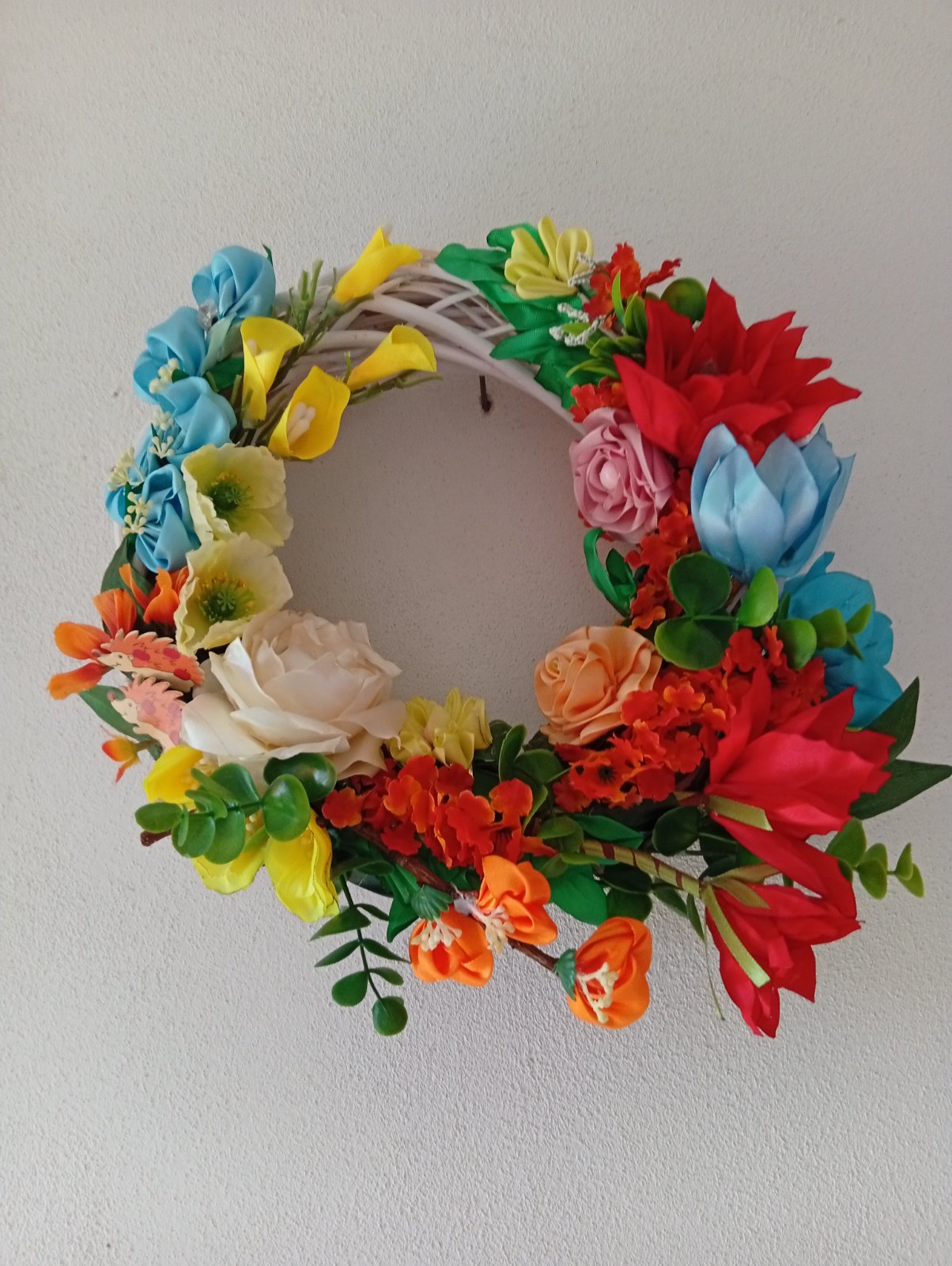 Ručné vyrobené zo satenovej stuhy ružičky a lístky. Priemer 27 CM. Cena plus poštovné.