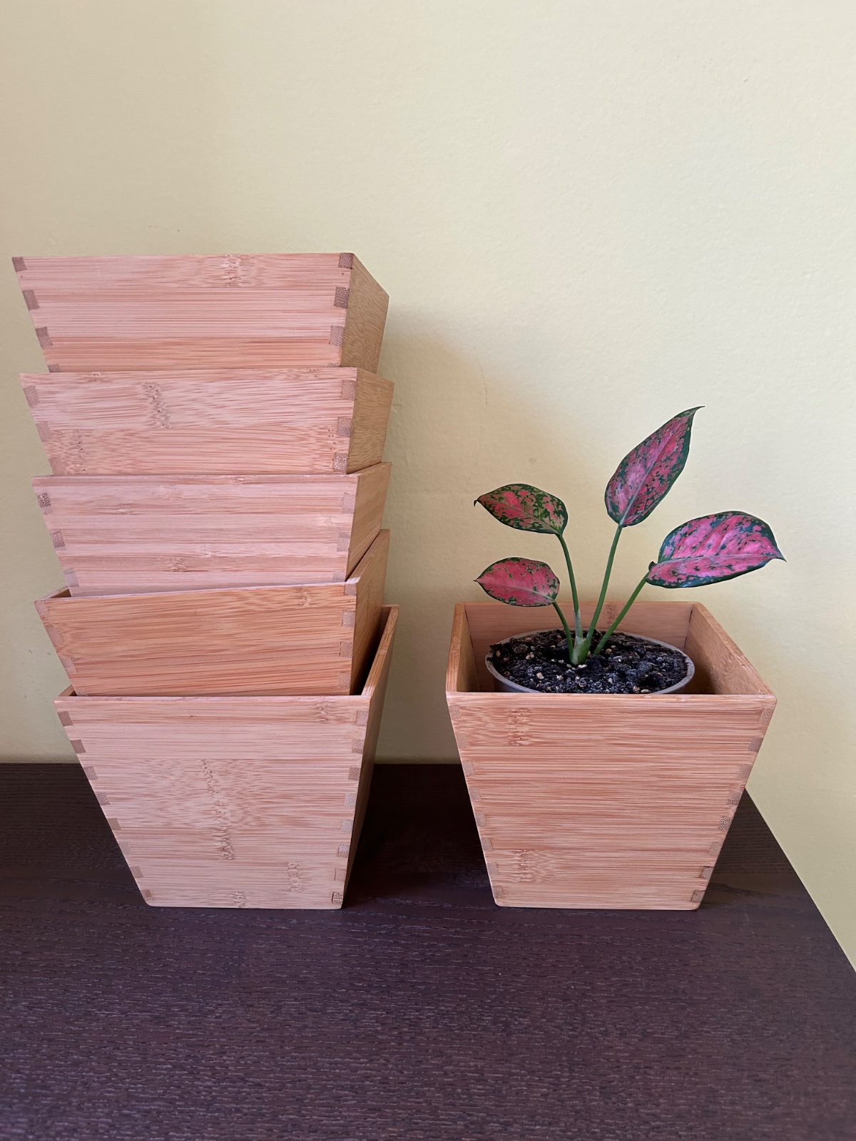 Predám 6 ks bambusových kvetináčov zn.VILDAPEL z IKEA, ktoré majú vo vnútri čiernu plastovú misku, ktorá zachytí vodu pri polievaní rastliny. Rozmery: dĺžka 16 cm, šírka 16 cm, výška 13 cm. Max.priemer kvetináča 12 cm.