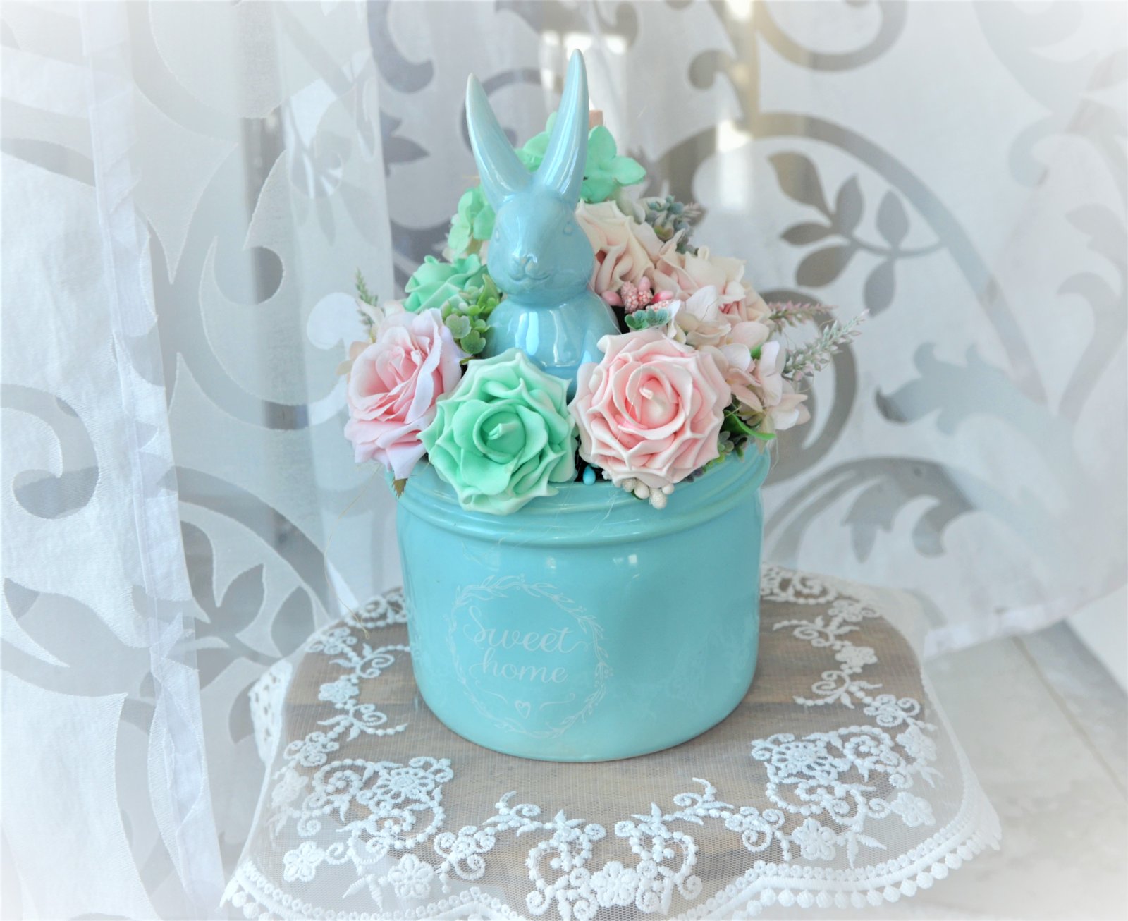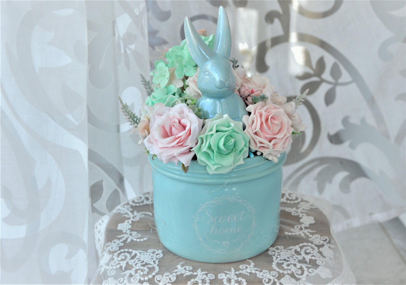 nevymieňam!!!aranžmánik v keramickej nádobe,súčasťou keramický zajačik,v ponuke aj v ružovej farbe,cena je za kus-výška 27cm,priemer 17cm,..v ponuke aj iné veľkonočné dekorácie..kuk aj na iné moje inzeráty
