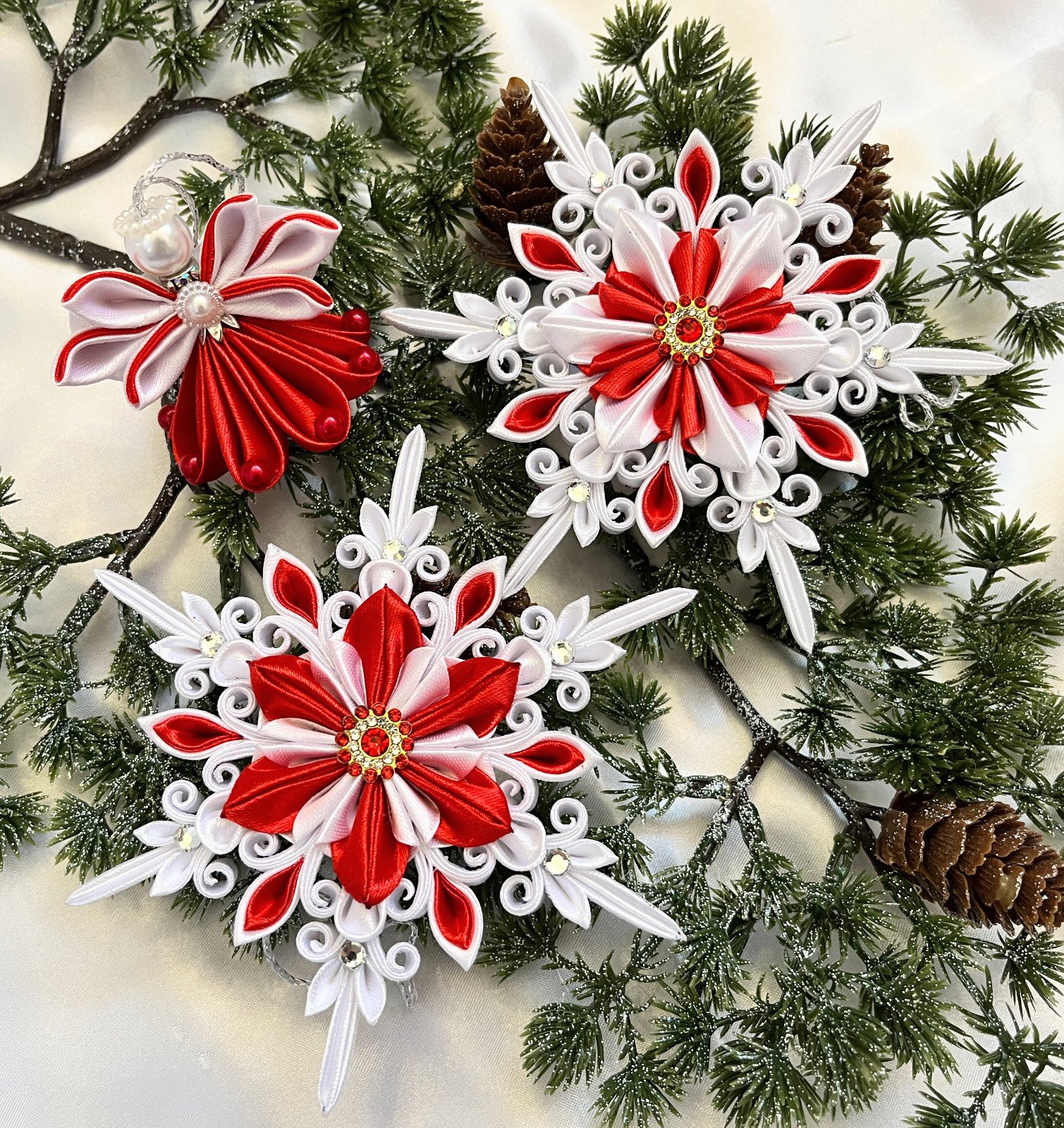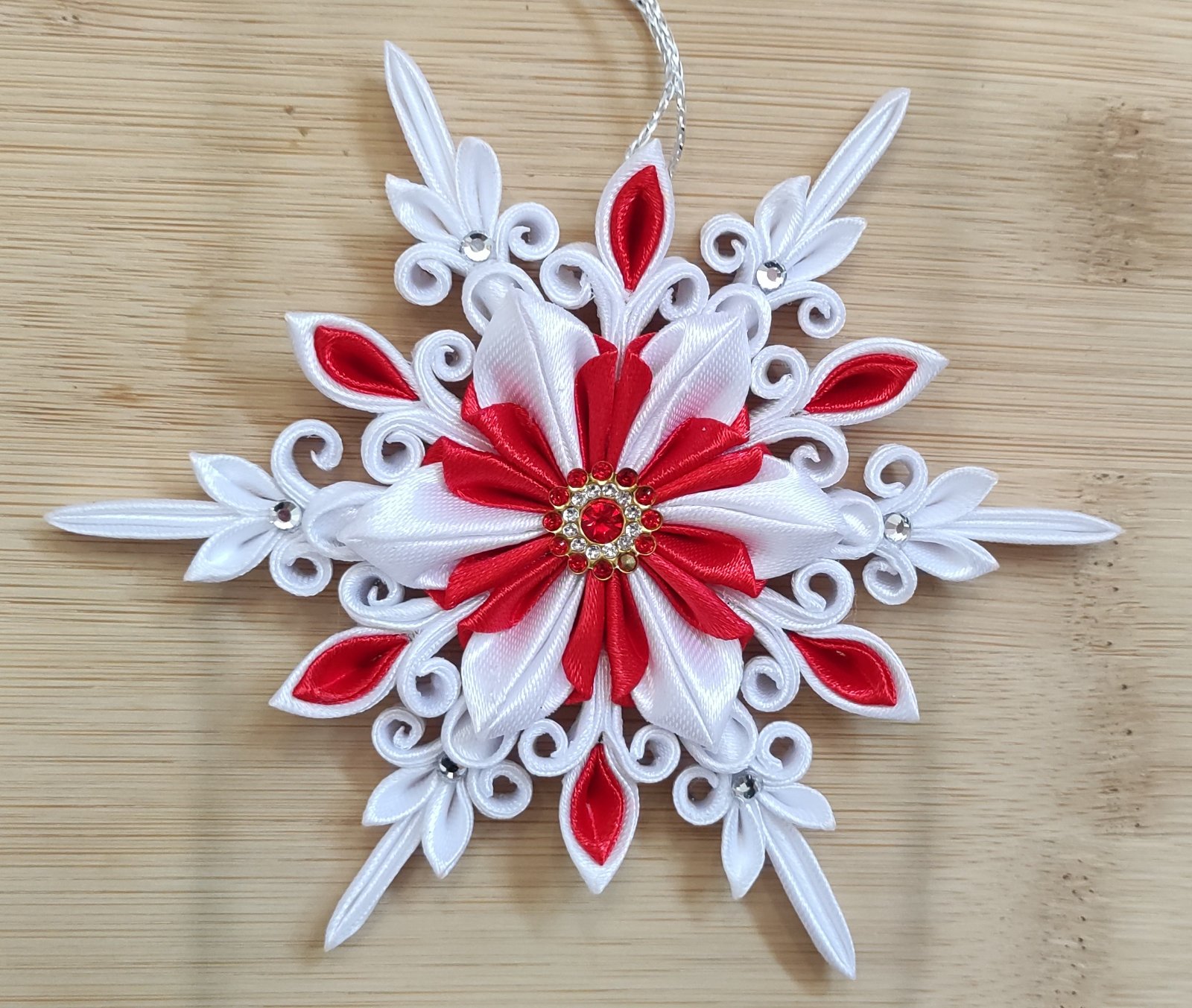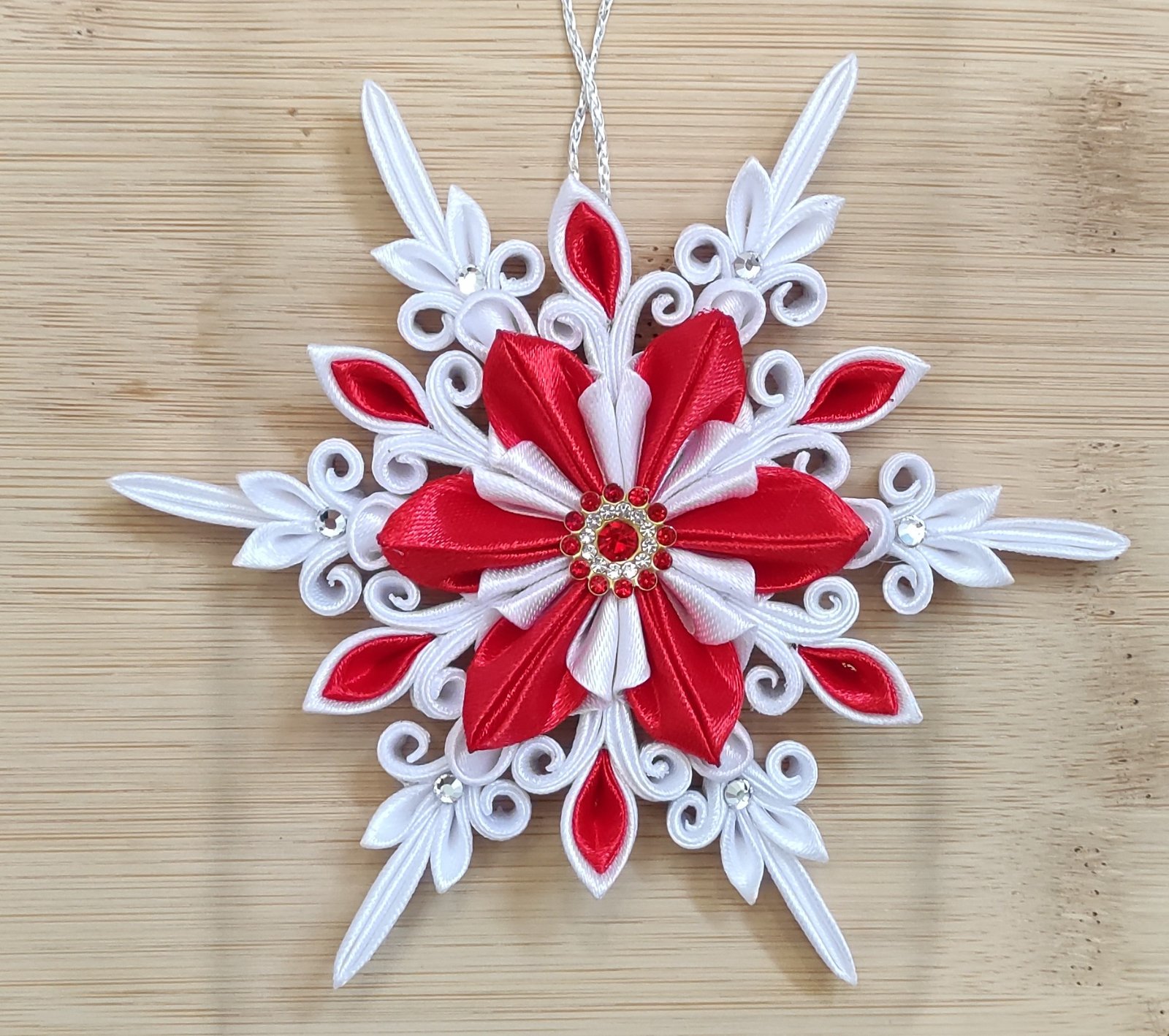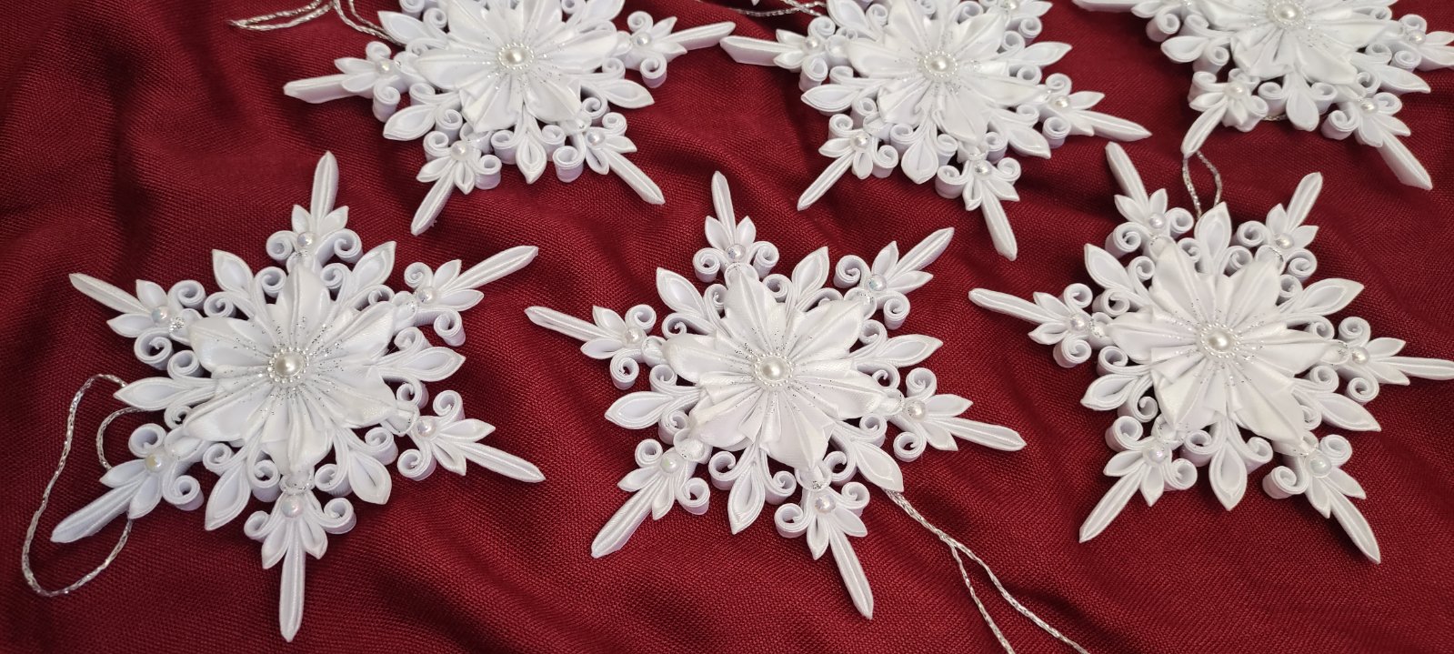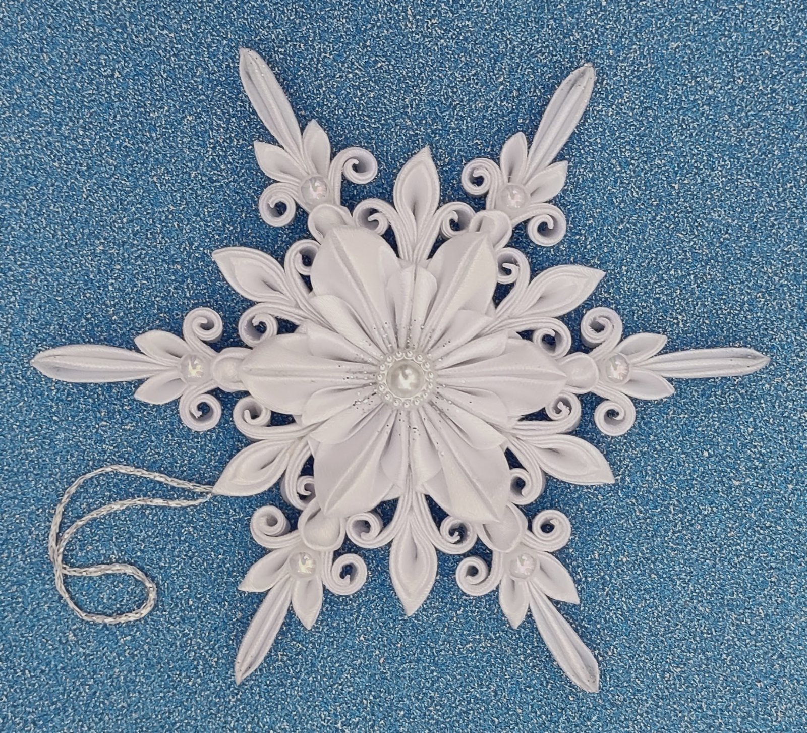 Vytvorte si kúzelnú vianočnú atmosféru s elegantnou saténovou vločkou, ktorá je jemne zdobená trblietavými perličkami.