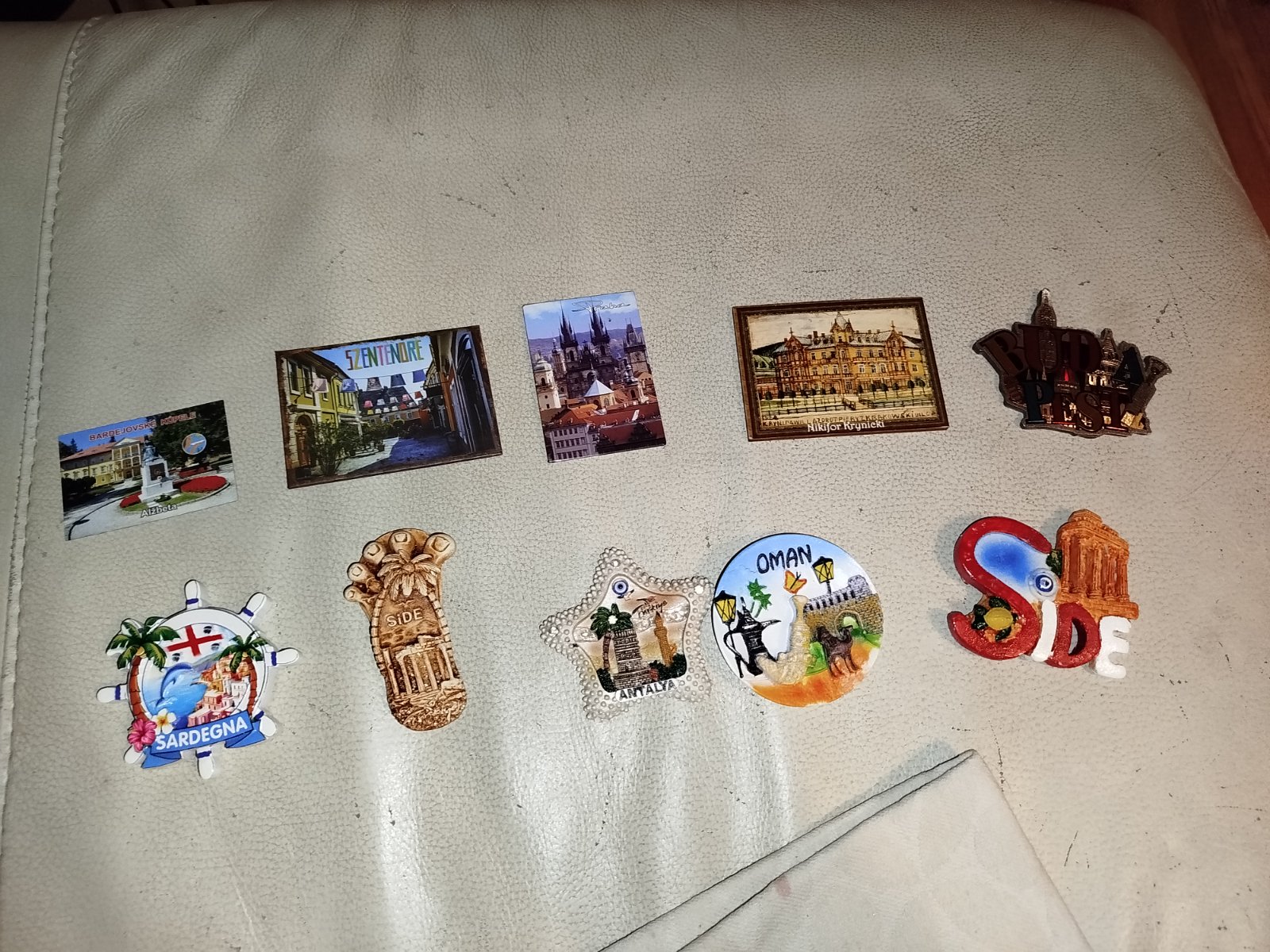 Predám magnetky z rôznych štátov miest,2x Side,2eur kus1x Antalya 2eur,1x Omán 2eur,1xBudapest,1eur,1x Sardegna2eur,1x Praha 1eur,1x Bardejovské kúpele1eur, 1xNikifor Krynicki Poľsko 2eur,1x Szentendre 1eur