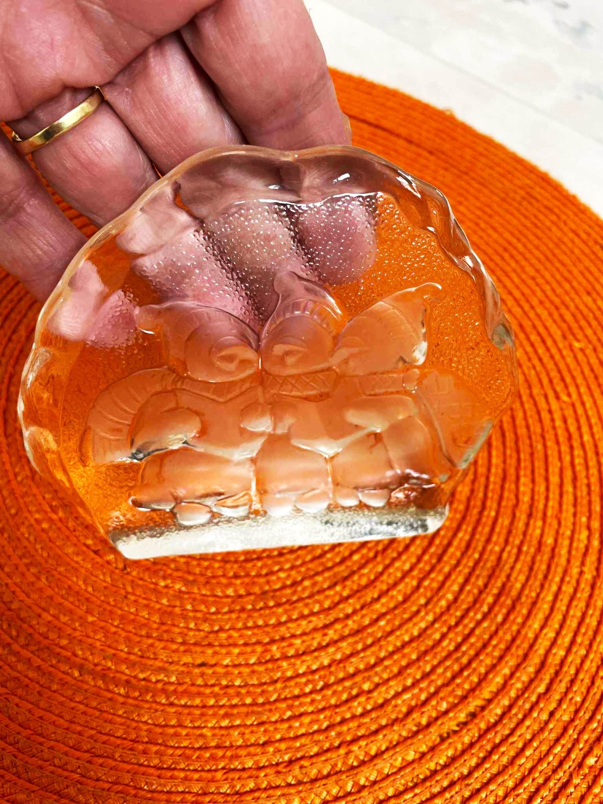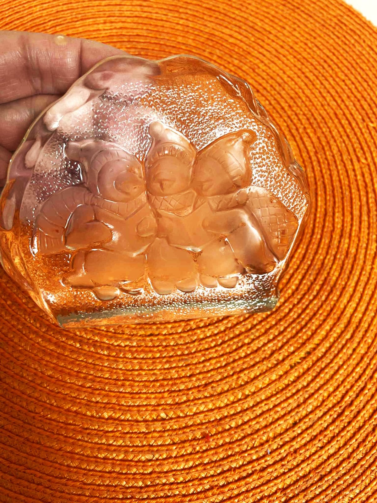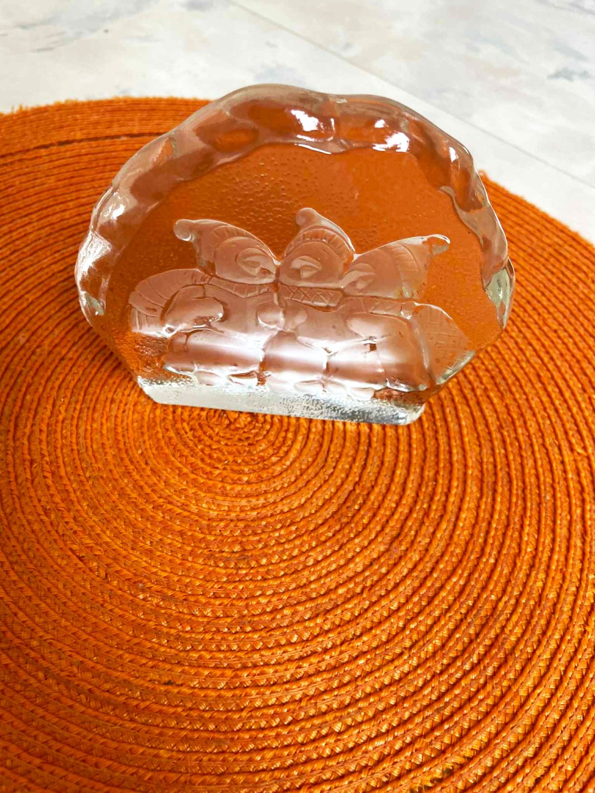 priehľadná, z masívneho nerozbitného skla,využitie ako samostatná ozdoba s Vianočným motívom alebo ťažítko na písací stôl....resp. dekorácia do detskej - viacnásobné využitie,š12 x v10 x h 2 cm