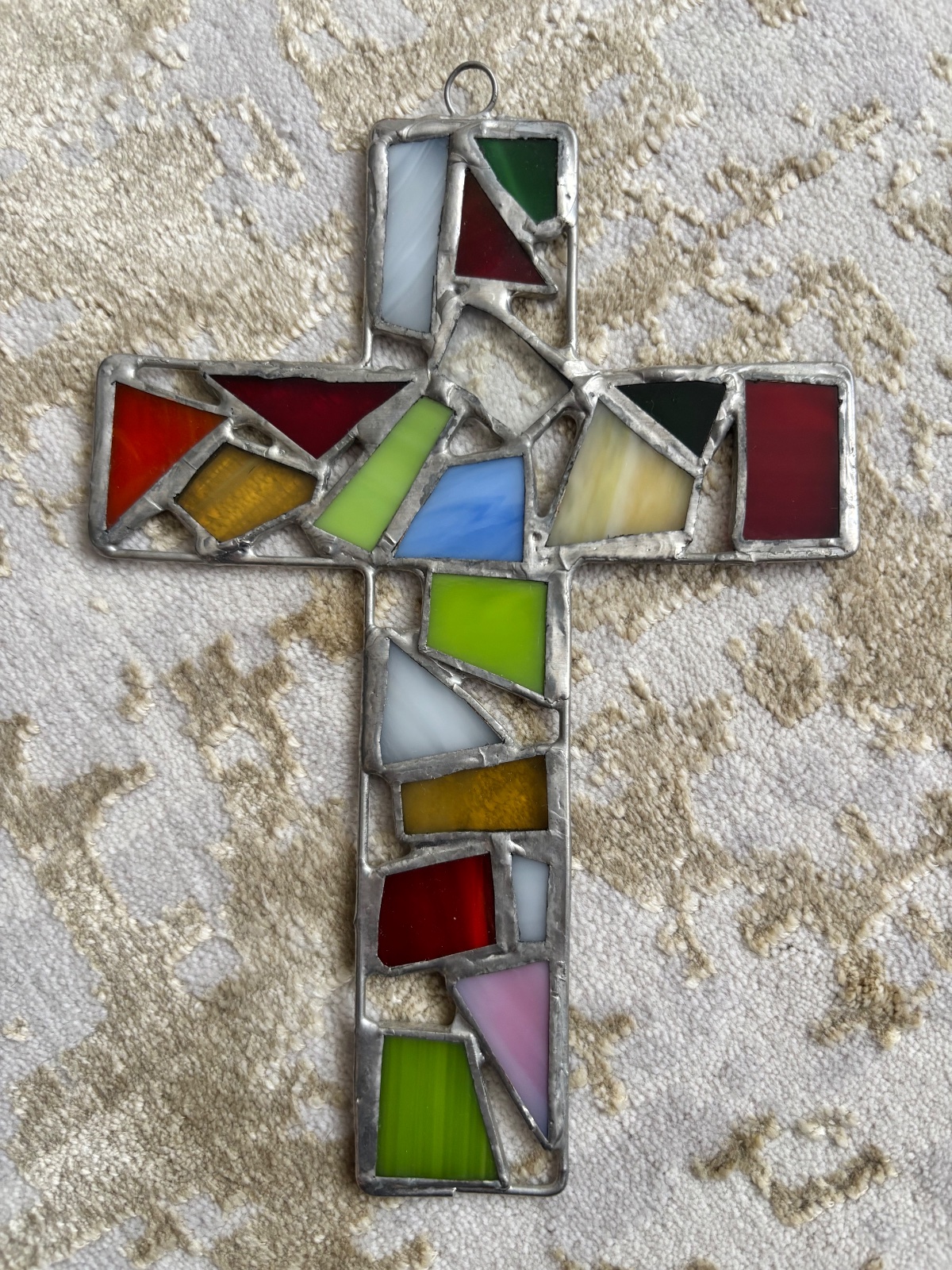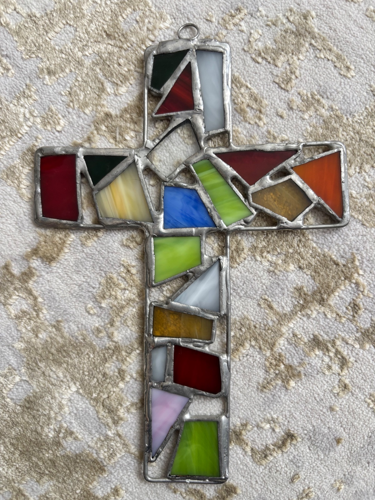 Kríž z kúskov farebného skla a cínu, vyrobene Tiffany technikou - vitráž. Obojstranný. Ako nový.