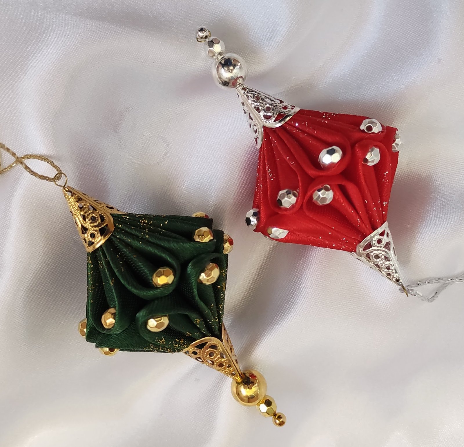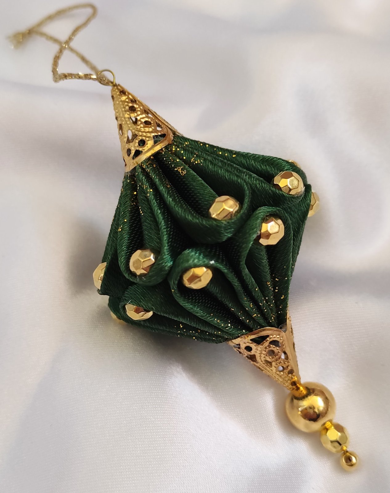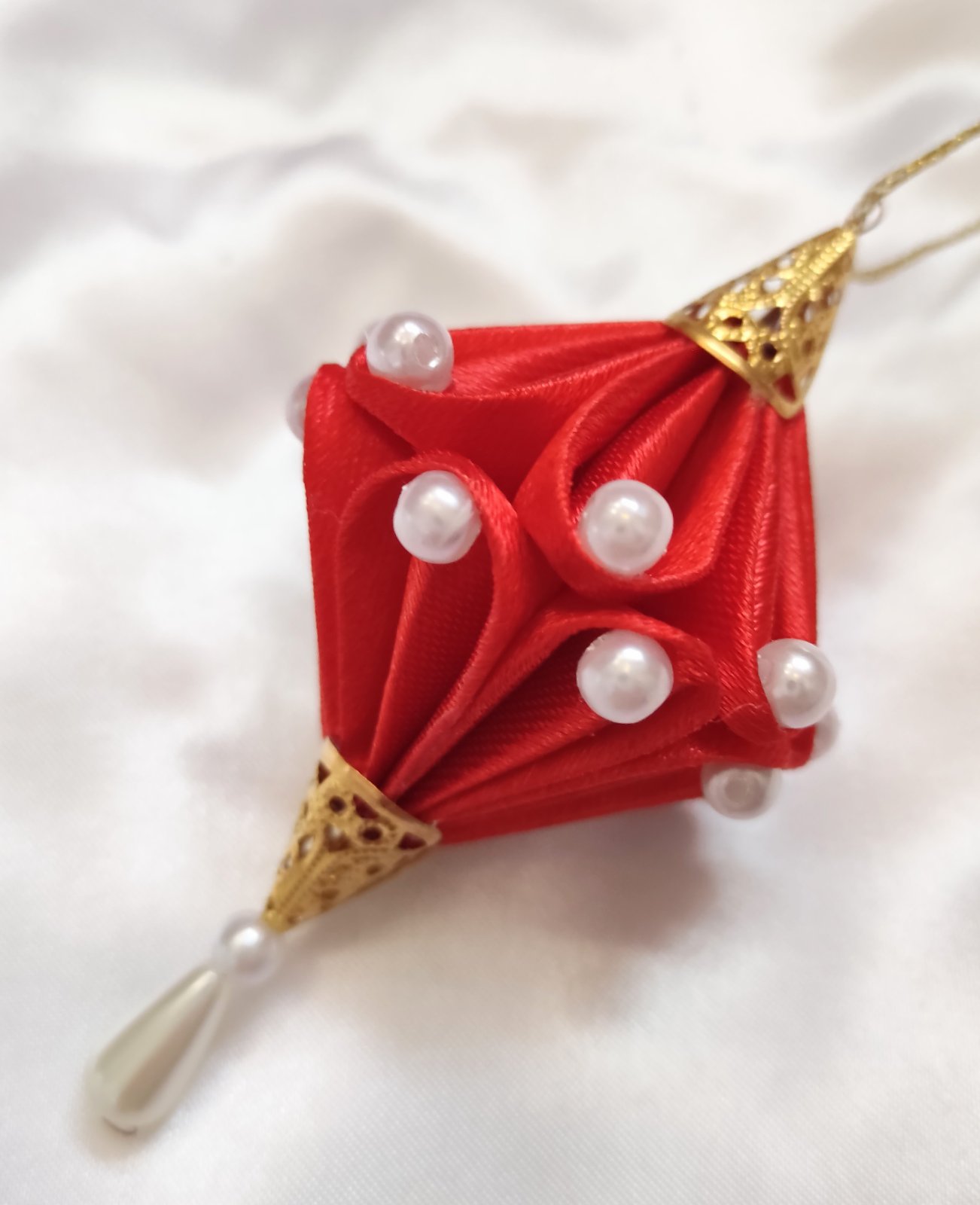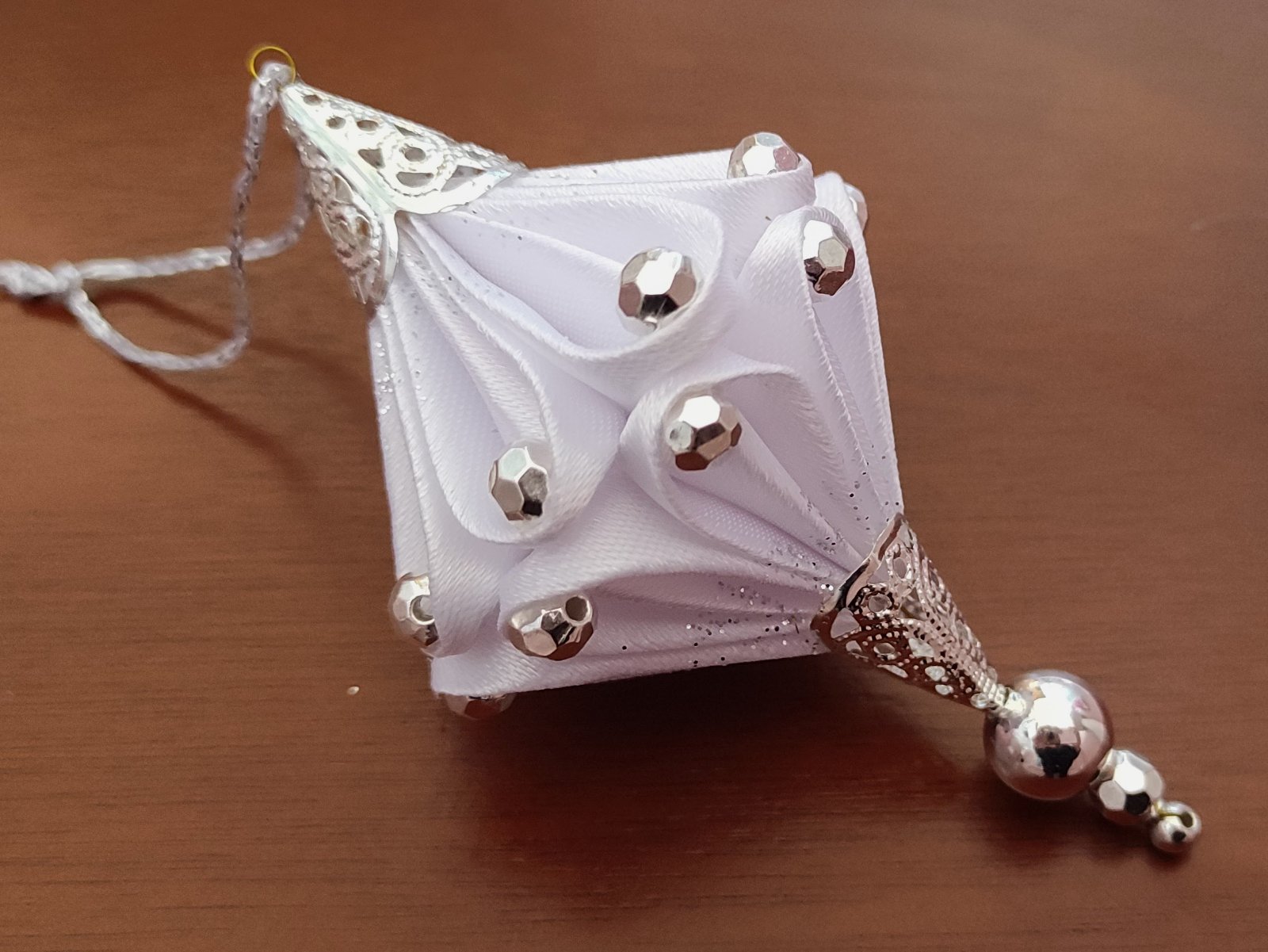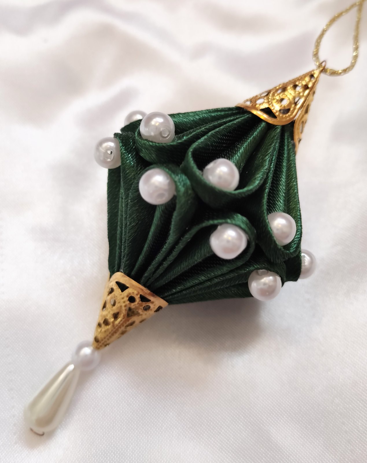 Vianočná ozdoba v tvare cencúľa, zhotovená zo saténovej stuhy ozdobená perličkami, guľôčkami v zlatej alebo striebornej farbe, pôsobí ako elegantný doplnok každej vianočnej výzdoby.