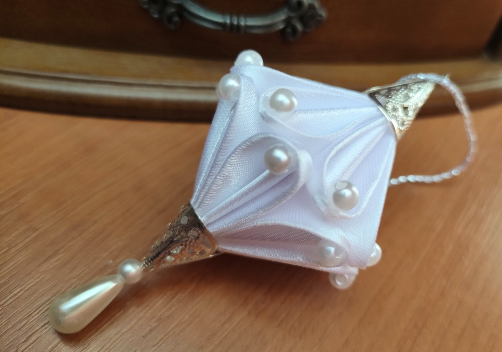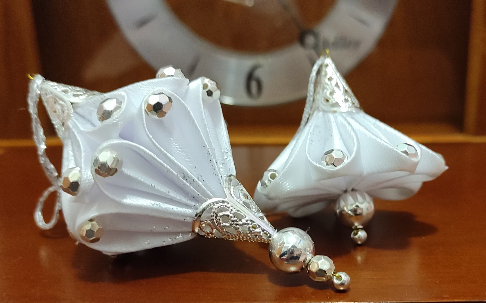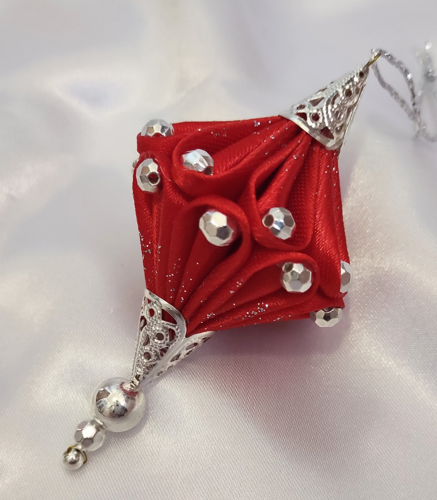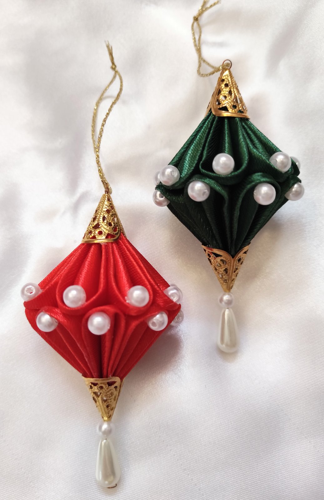 Vianočná ozdoba v tvare cencúľa, zhotovená zo saténovej stuhy ozdobená perličkami, guľôčkami v zlatej alebo striebornej farbe, pôsobí ako elegantný doplnok každej vianočnej výzdoby.