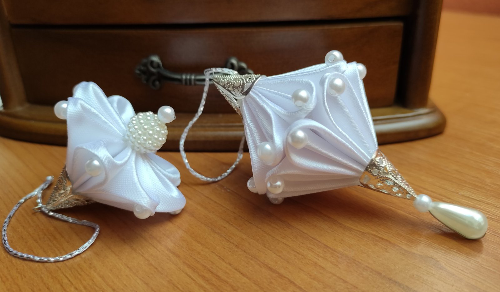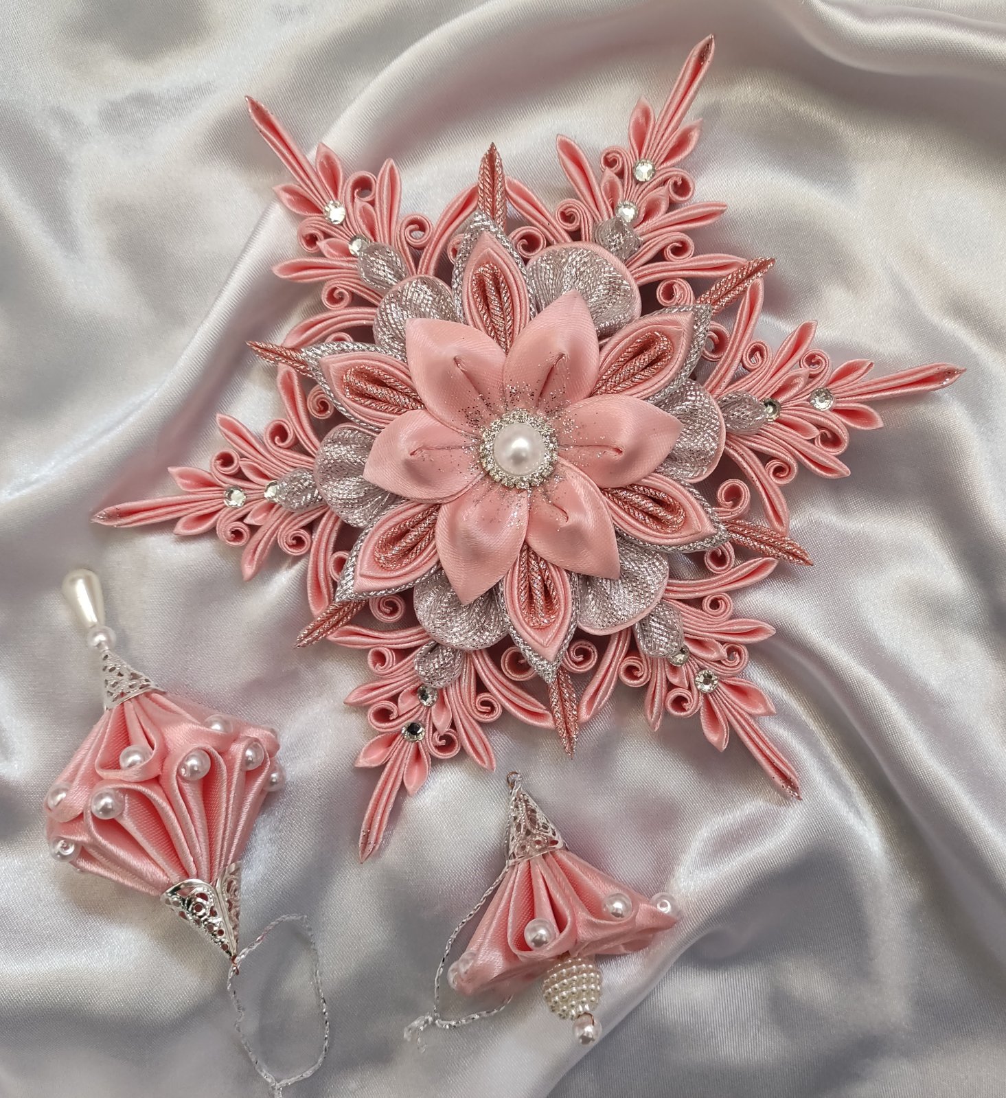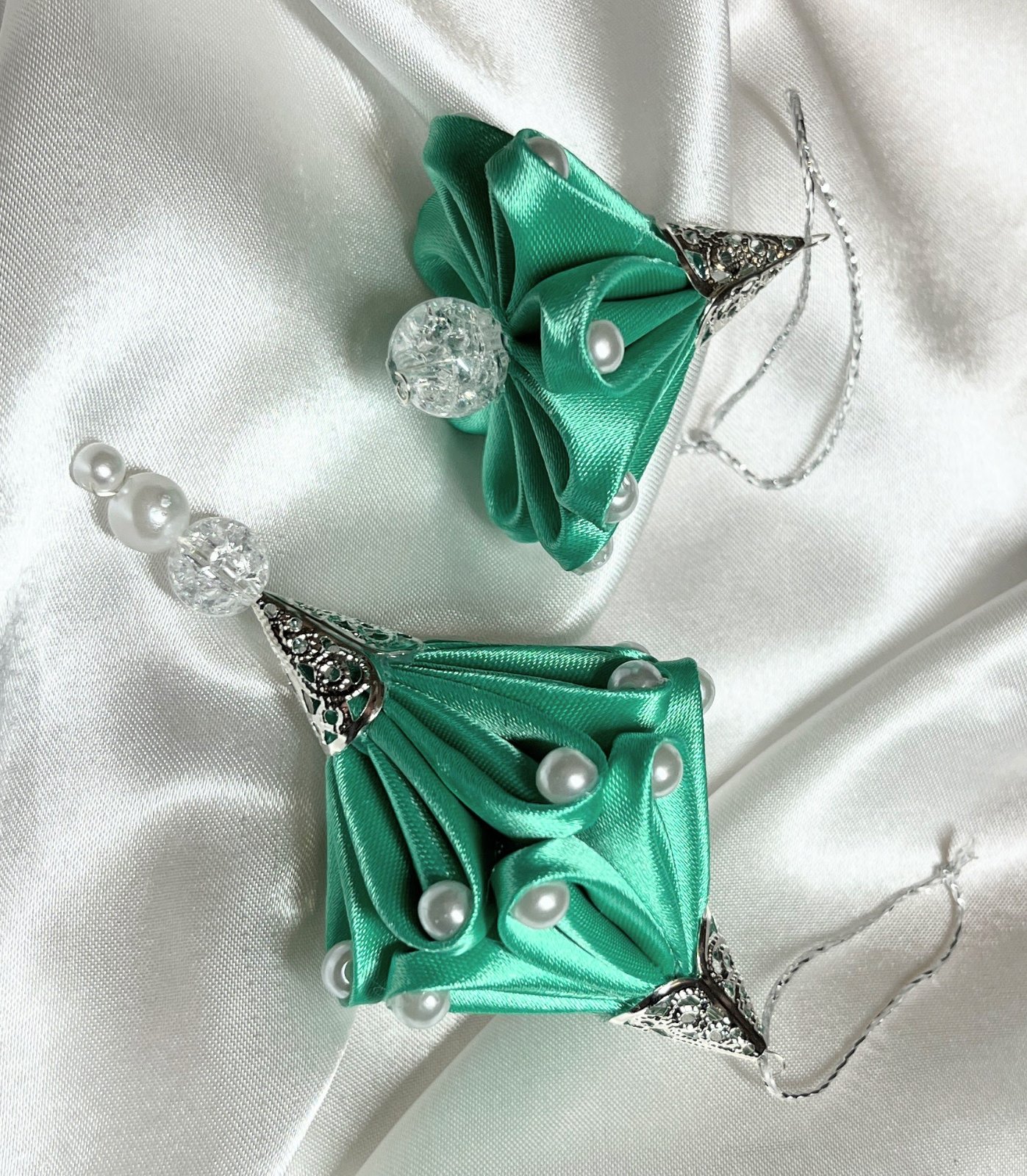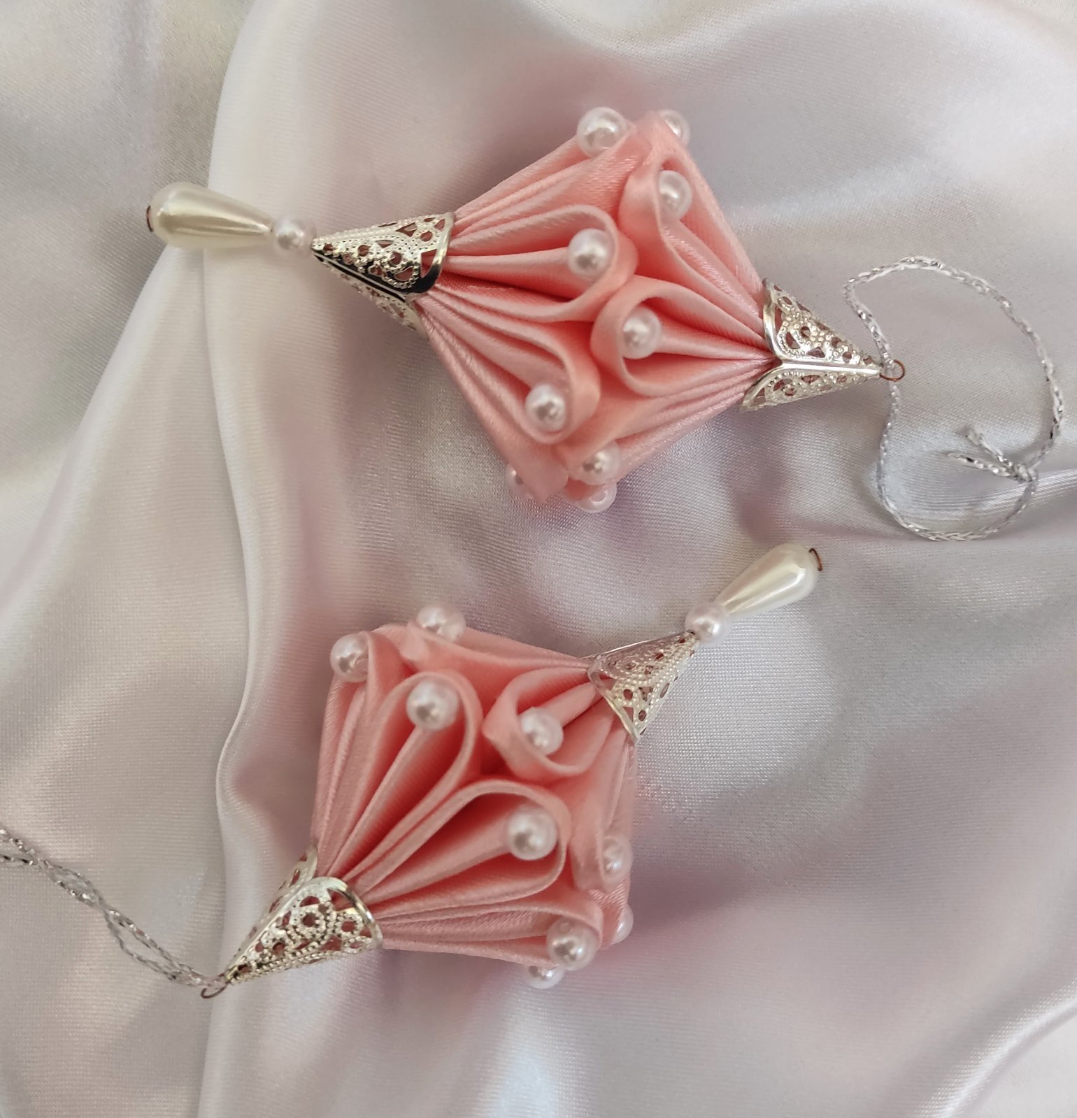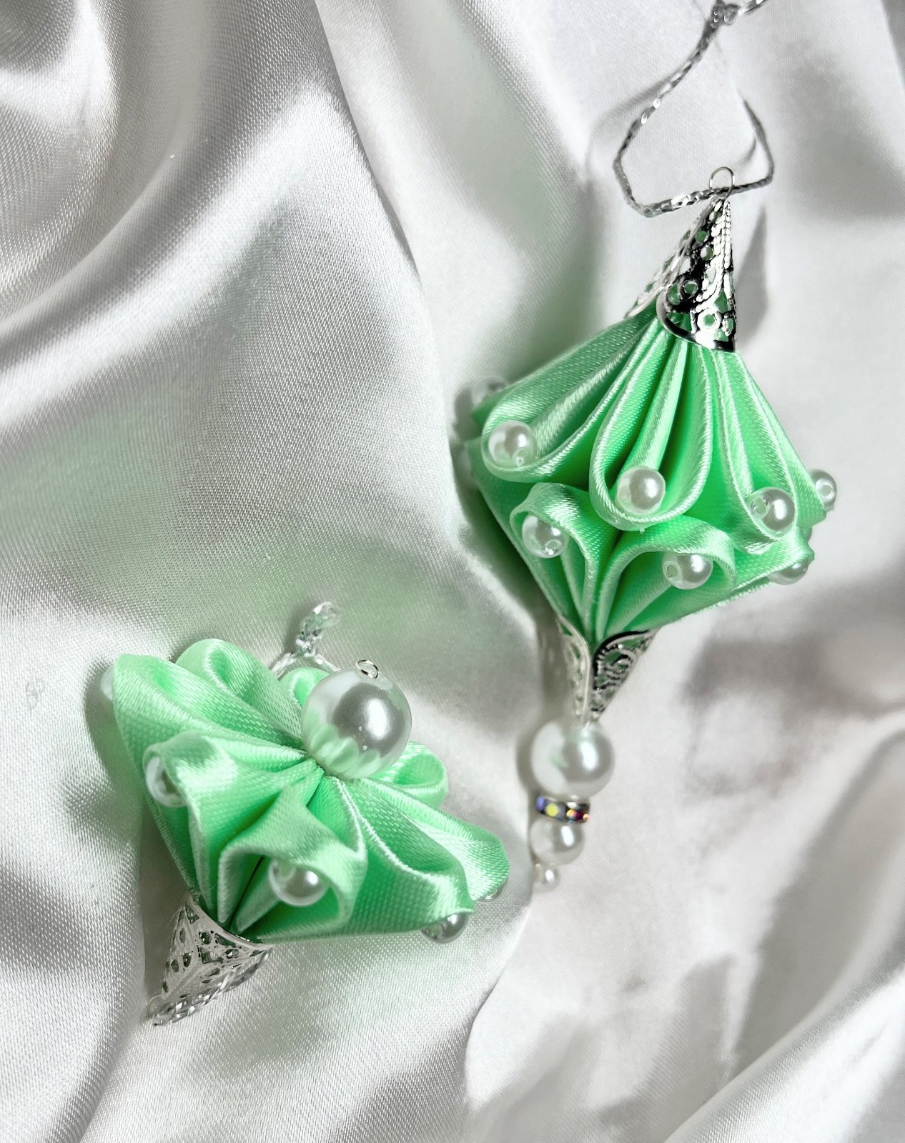 Vianočná ozdoba v tvare cencúľa, zhotovená zo saténovej stuhy ozdobená perličkami, guľôčkami v zlatej alebo striebornej farbe, pôsobí ako elegantný doplnok každej vianočnej výzdoby.