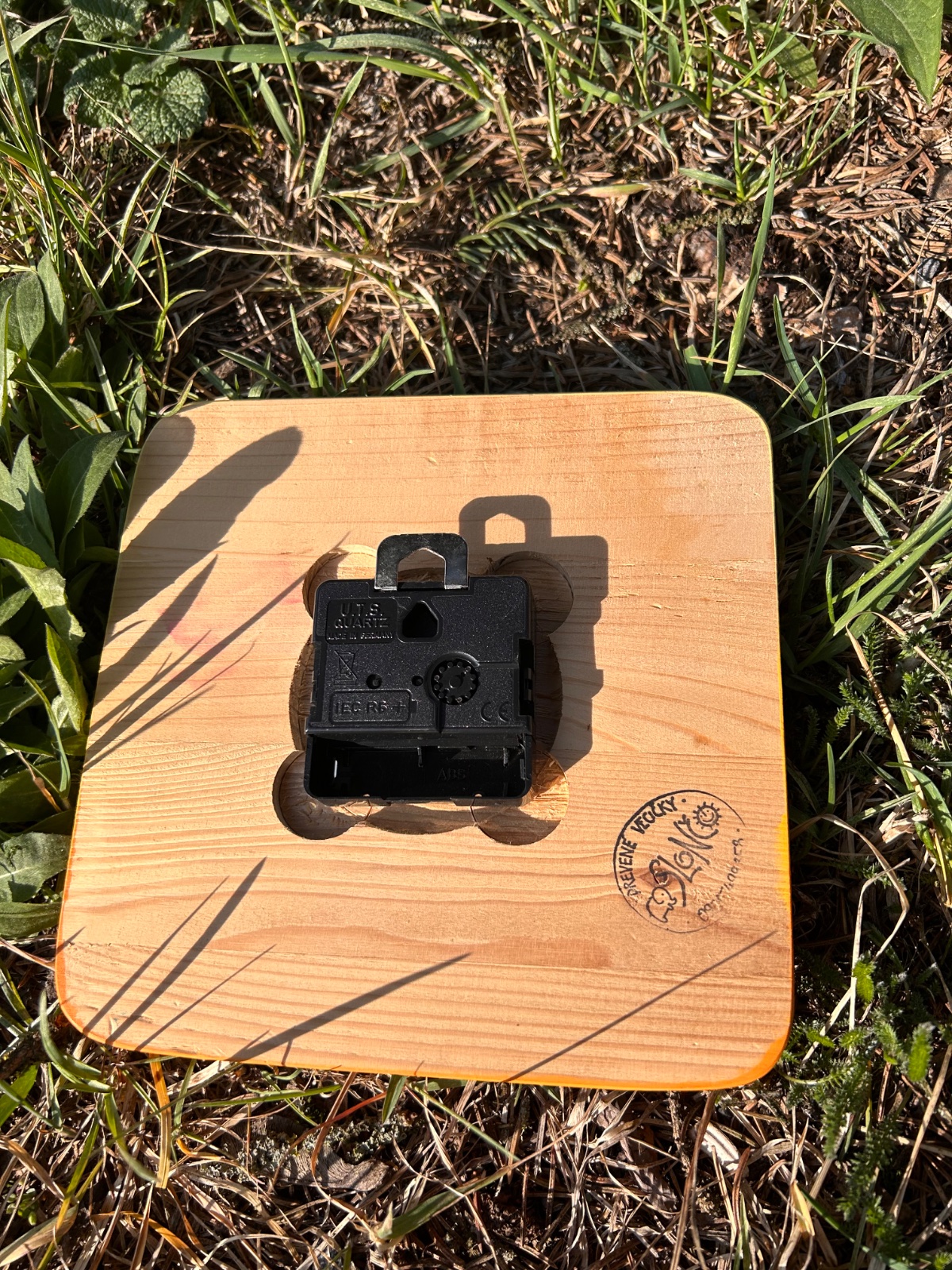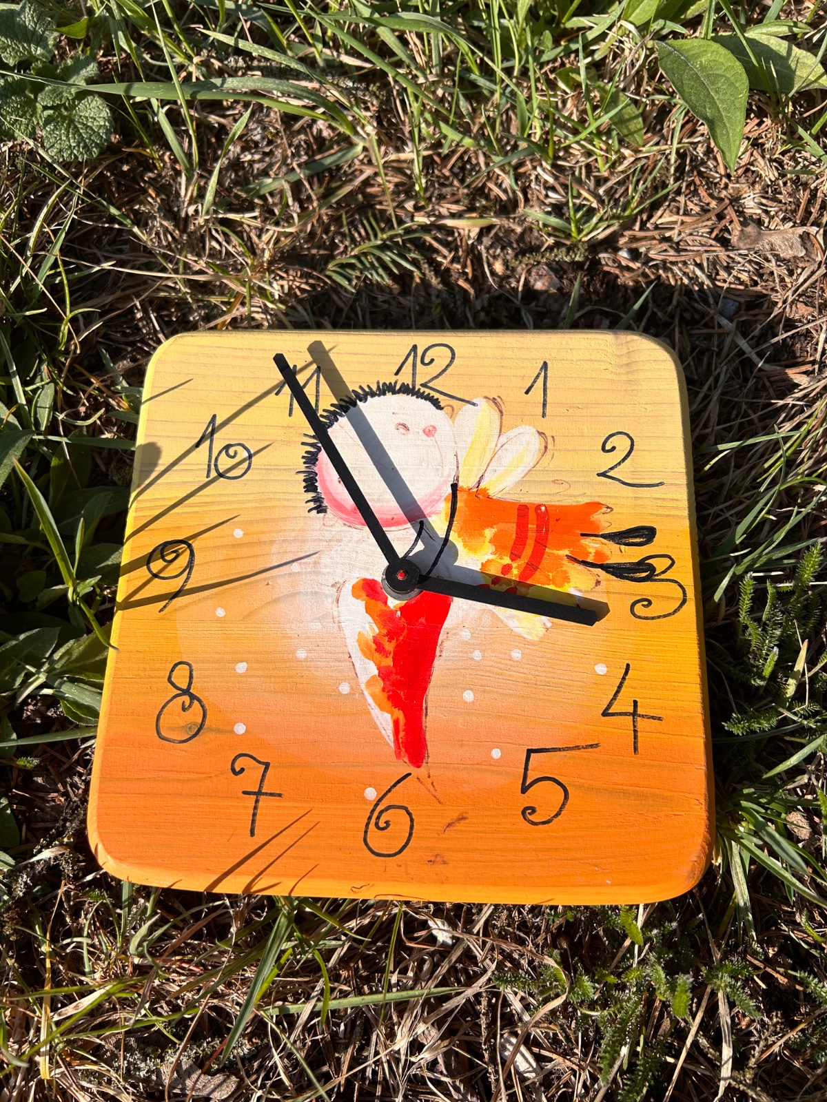Ručne maľované drevené nástenné hodiny s motívom anjela (anjelík s krídlami, v oranžovo-červenej farbe na žltom podklade). Kvalitný nemecký quartz mechanizmus U.T.S. (Made in Germany, IEC R6+)Rozmery 18x18x3cm.