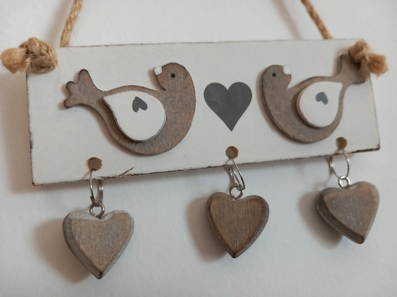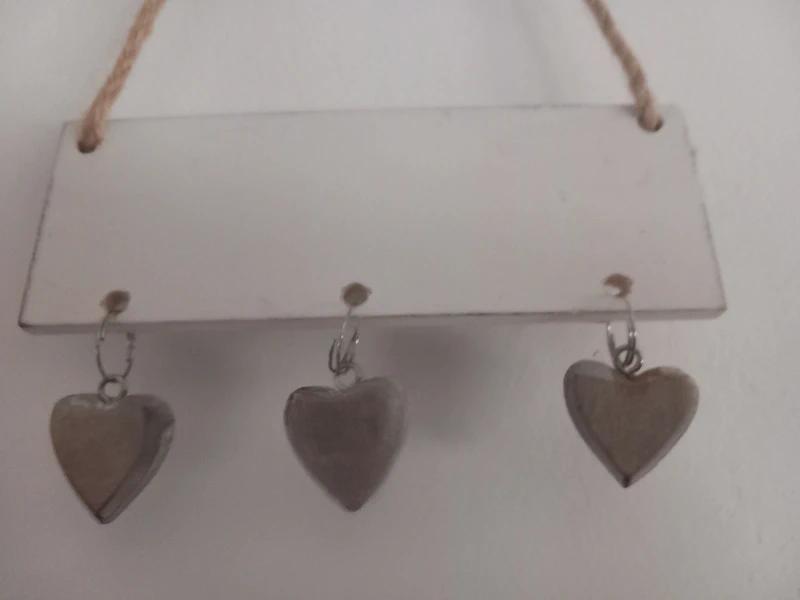 Drevená závesná dekoračná tabuľka v mierne šúchanom vintage vzhľade (zakúpená pred rokmi v Lavande), v rozmere šírka 13,5 cm a výška 5 cm, rozmer srdiečka 2,5 cm a celková výška zavesenej dekorácie cca 23 cm.