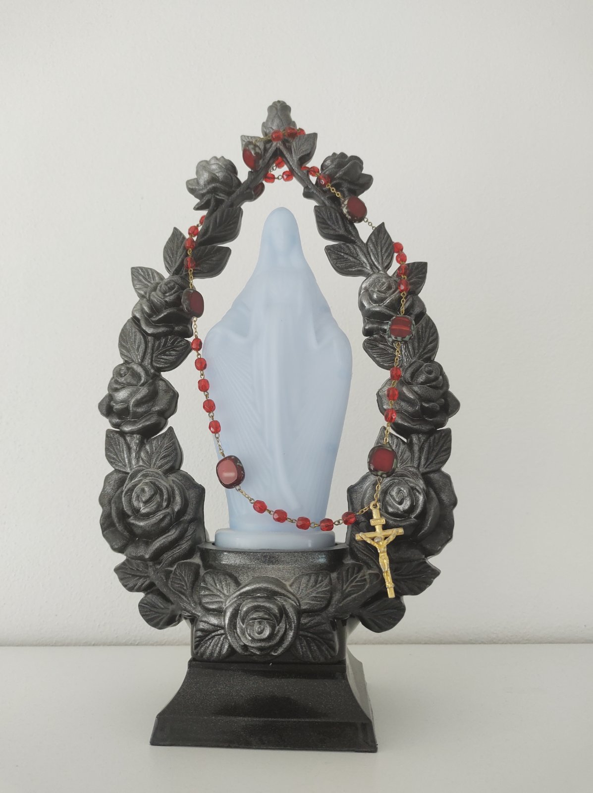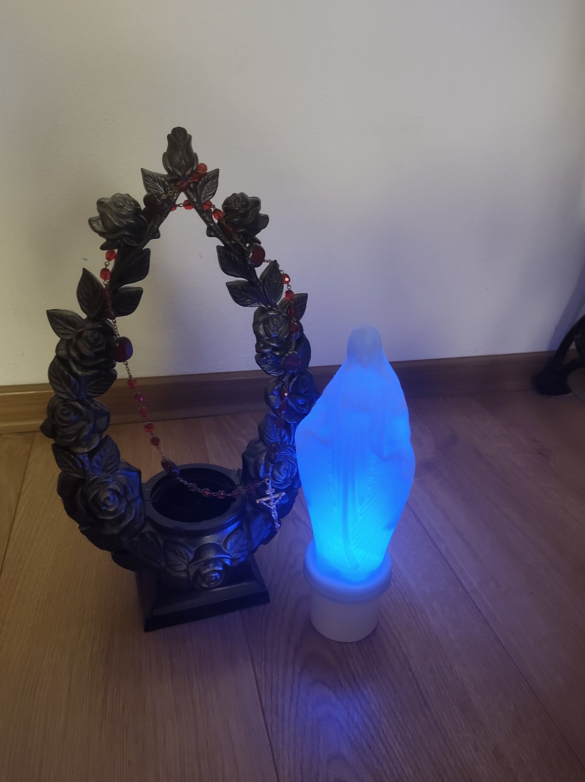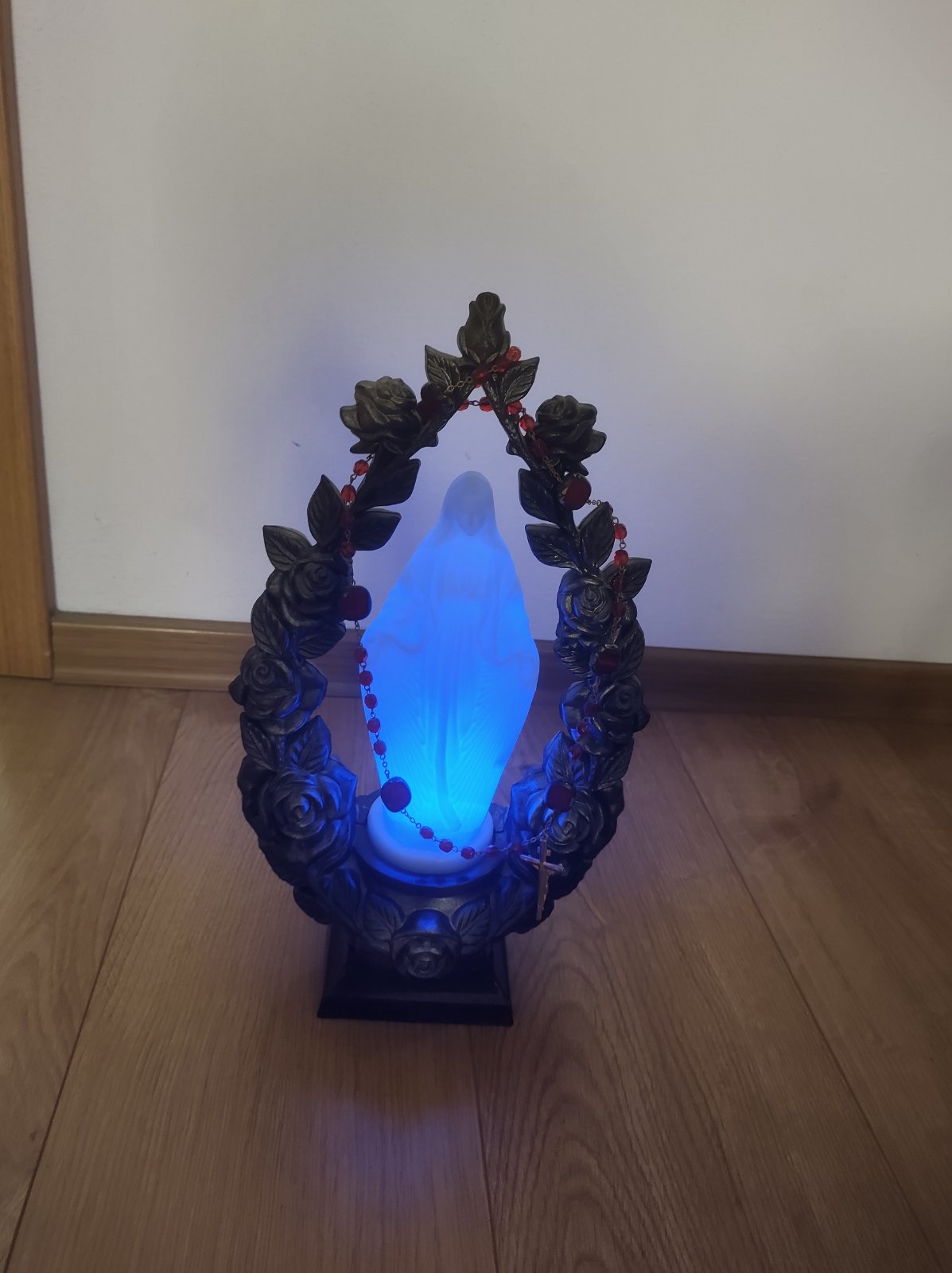 Kahanec Panna Mária svietiaca na baterky s ružencom, pekne svieti na modro.