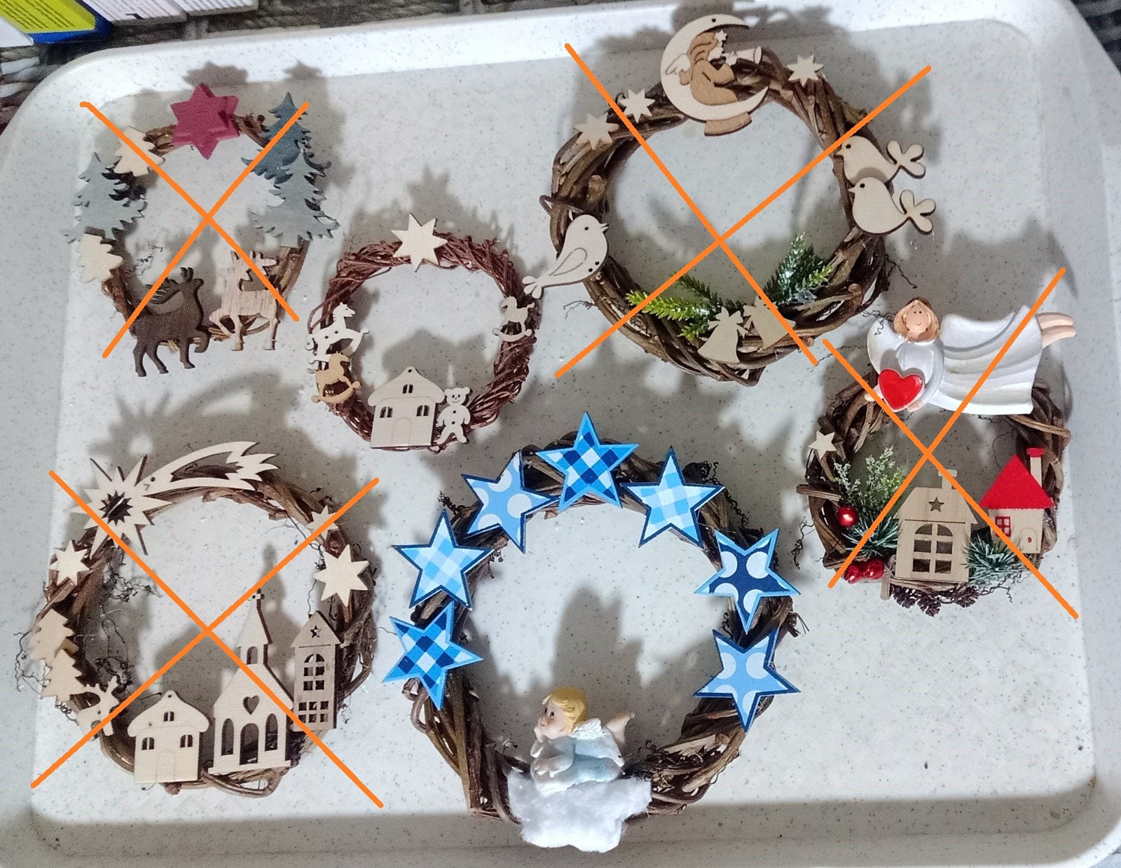 malé venčeky /priložené pravitko na poslednej foto ukazuje približnú veľkosť/ ručne stočené zo šľahúňov divého viniča a ozdobené prevažne malými drevenými výsekmi, niekde keramickým anjelíkom