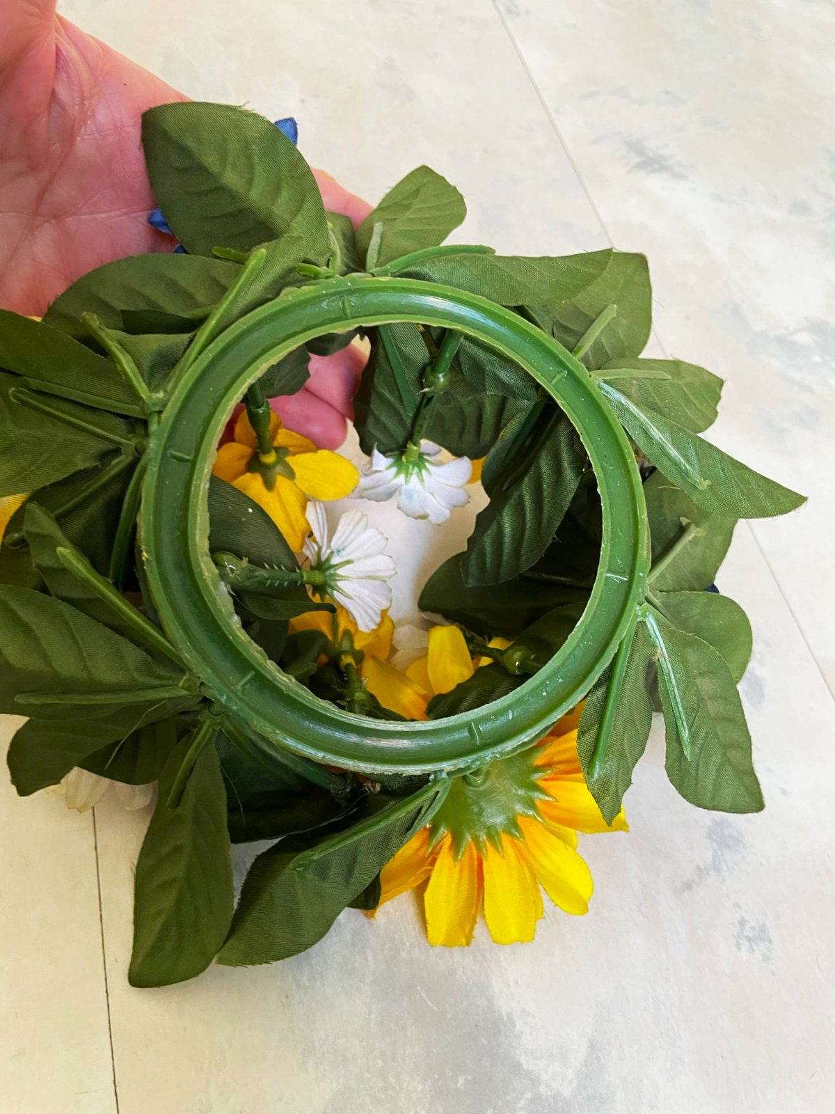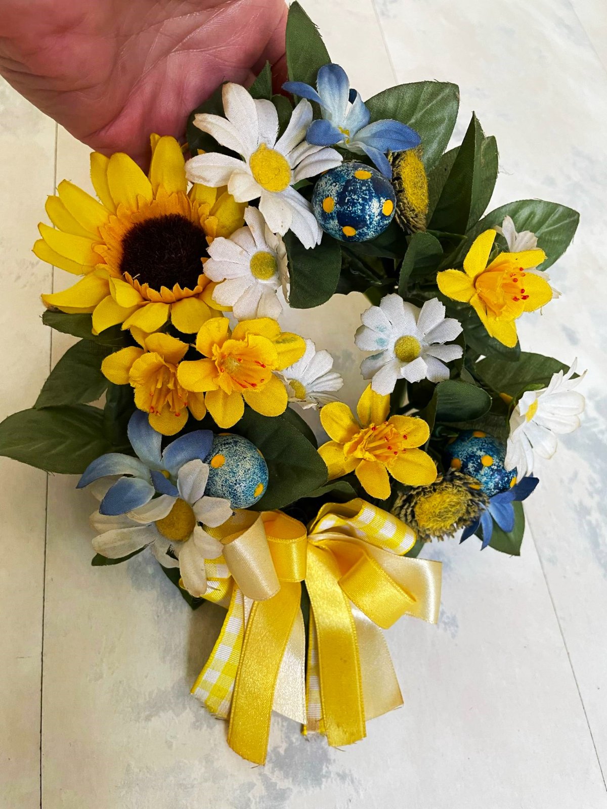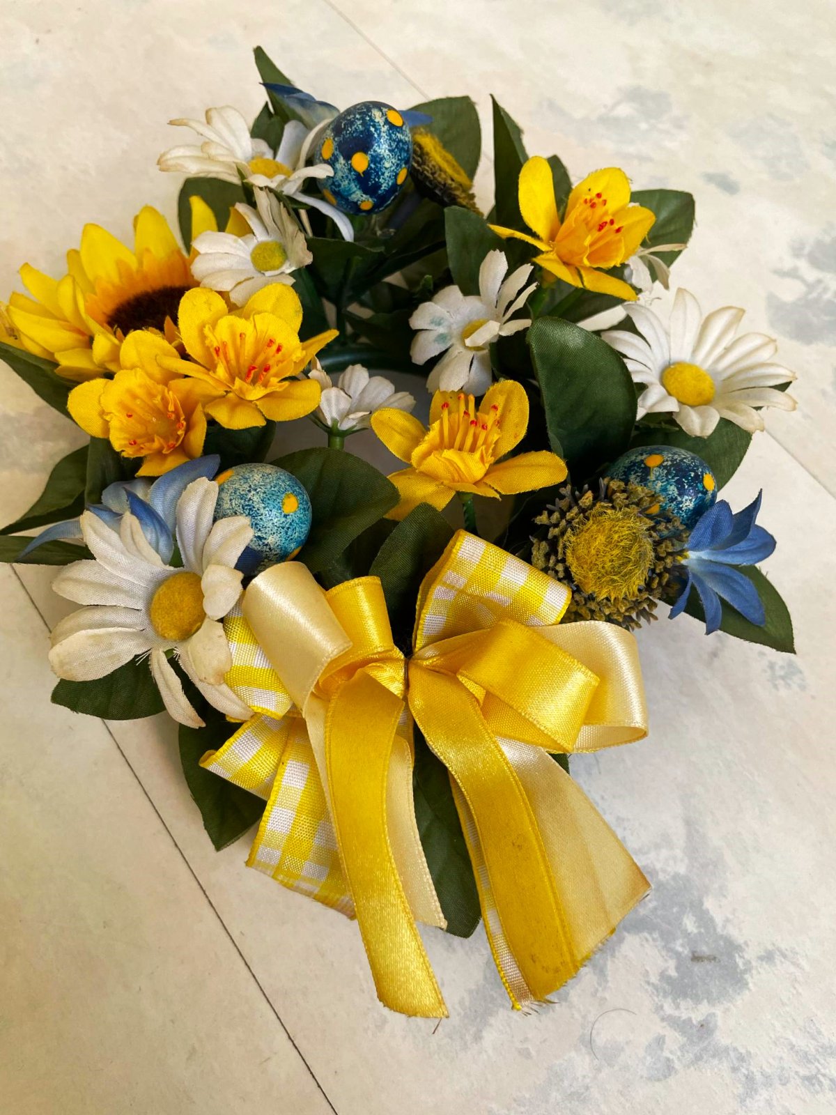 pestrý jarný venček s malými kraslicami,vonk.priemer cca 17 cm ,vnútorný priemer = 10 cm,pekne pôsobí aj so sviečkou vo vnútri