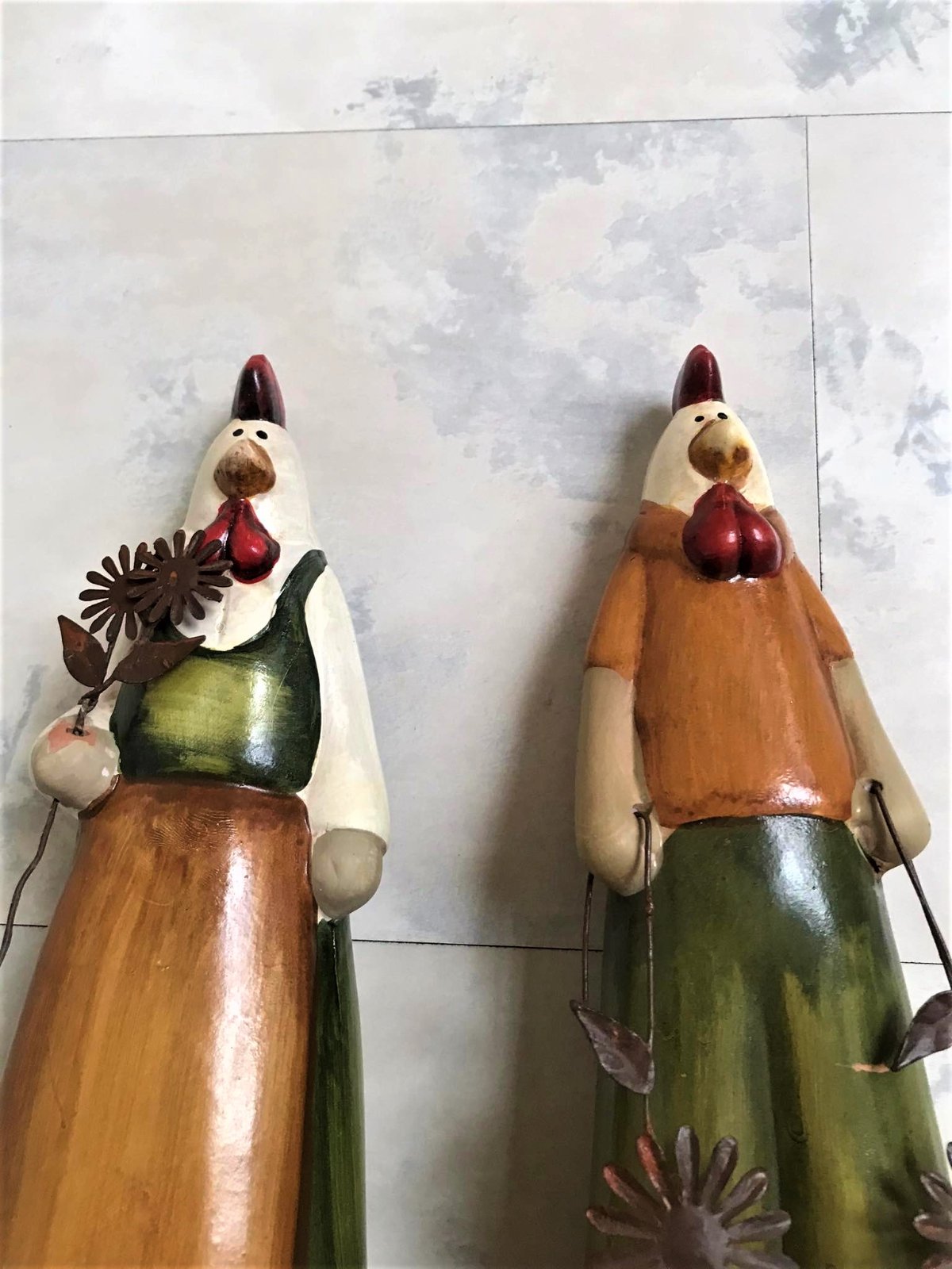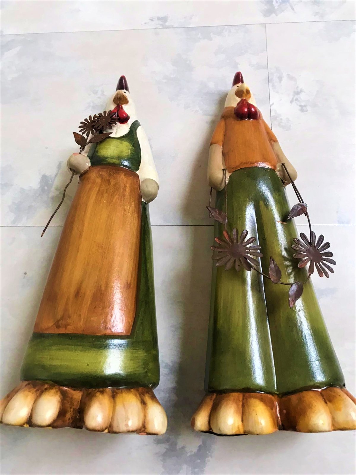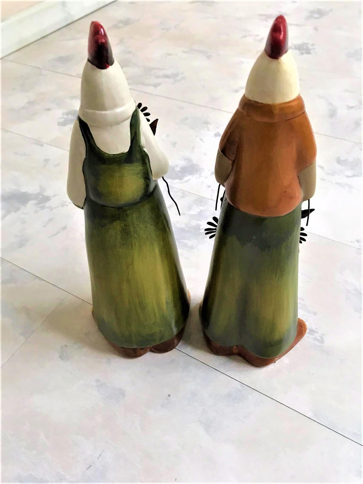 krásne keramické figúrky, super dekorácia do kuchyne,vhodné aj na dekoráciu na Veľkú noc...na ruke 1 figúrky je trošku odlepená glazúra,ale nie je to bežne vidieť,nakoľko je tam zastrčený kvet z medeného drôtu,ale detailne som to vyfotila.....