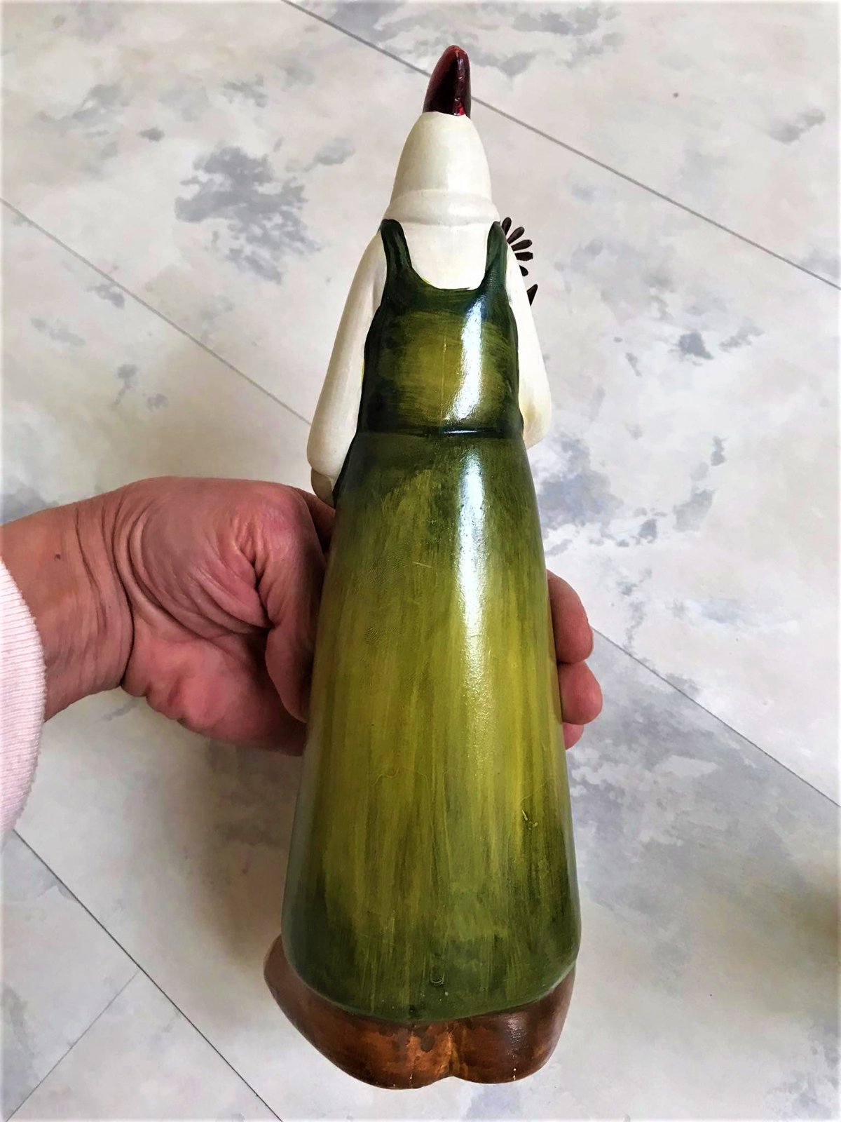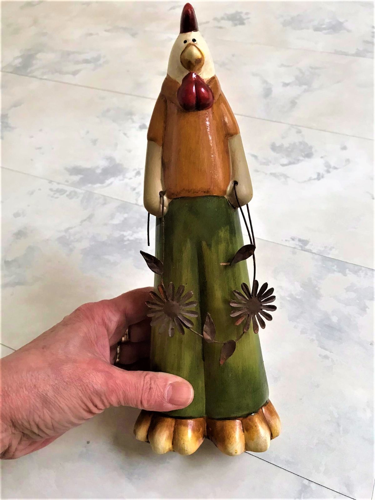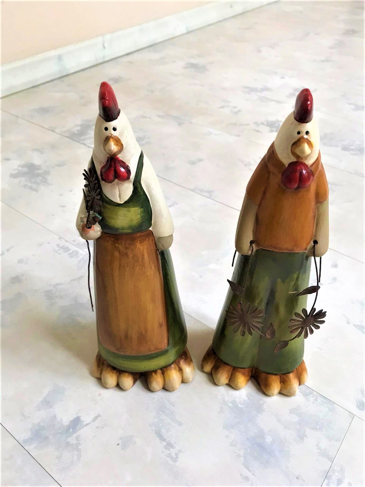 krásne keramické figúrky, super dekorácia do kuchyne,vhodné aj na dekoráciu na Veľkú noc...na ruke 1 figúrky je trošku odlepená glazúra,ale nie je to bežne vidieť,nakoľko je tam zastrčený kvet z medeného drôtu,ale detailne som to vyfotila.....