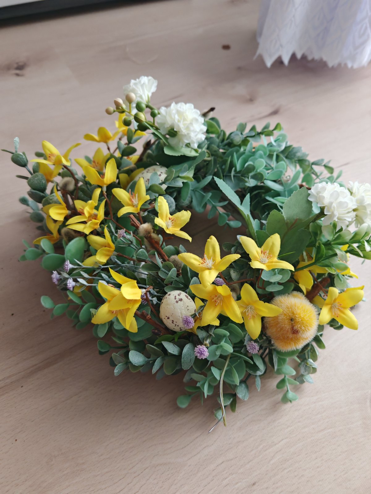 Predám mnou vyrobený venček na dvere, biele kvety sa dajú vyberať aj vsunúť,nemusia tam byť.. je umelý, vydrží na každú ďalšiu jar či už zavesiť na dvere,alebo ako dekorácia do vnútra na stôl.