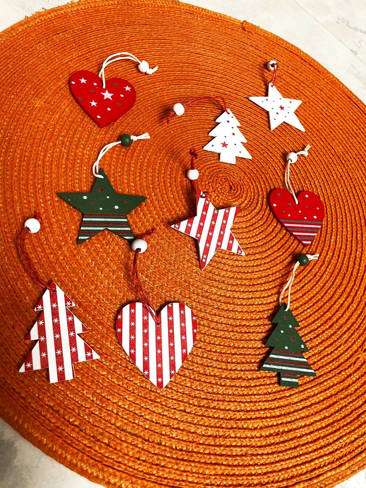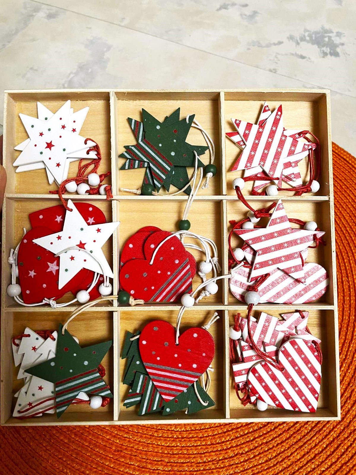 krásne tenučké ľahké drevené ( z tenkej preglejky ) vianočné ozdoby ukončené drevenou korálkou,v drevenej kazetka,z každého druhu po 4 ks, 6x6 cm,použité na 1 Vianoce,v prípade záujmu nám 2 sady - nafotím