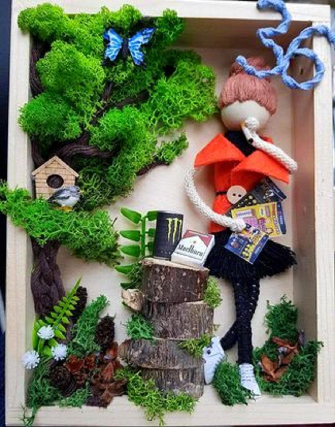 Na výrobu používam rôzne materiály, napríklad drevo, makramé šnúry, priadzu, sušené kvety, modelujem z polymérovej hmoty. Stromček je vyrobený zo živého stabilizovaného machu. Mach nevyžaduje žiadnu špeciálnu údržbu, polievanie, strihanie ani osvetlenie. Nehodí sa na priame slnko, naopak, hodí sa aj do tmavších miestností. Nie je vhodné ich umiestňovať do veľmi suchého prostredia alebo do blízkosti radiátora. Aby si zachovali jemnú štruktúru a svieži vzhľad, vyžadujú vlhkosť vzduchu okolo 40 až 60 %. Pri dlhšom pôsobení suchého vzduchu môže mach mierne stvrdnúť, no ich výhodou je, že pri opätovnom zvýšení vlhkosti sa mach vráti k svojim pôvodným vlastnostiam.