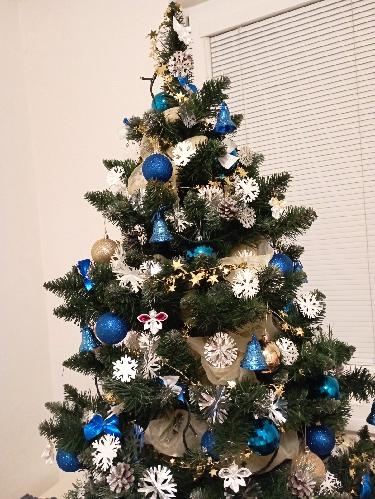 Krásny, hustý, kde tu šiška na konáriku, akoby zasnežené časti miestami.. S podstavcom (je na obrázku) meria cca 155cm. Kým ho postavím/odzdobím, opadne z neho trochu (klasika), inak bez chybičky, nádherný.