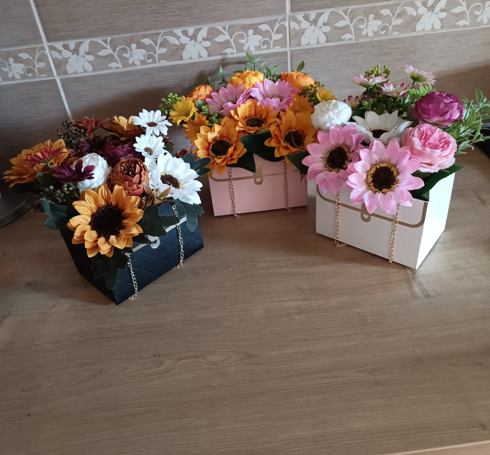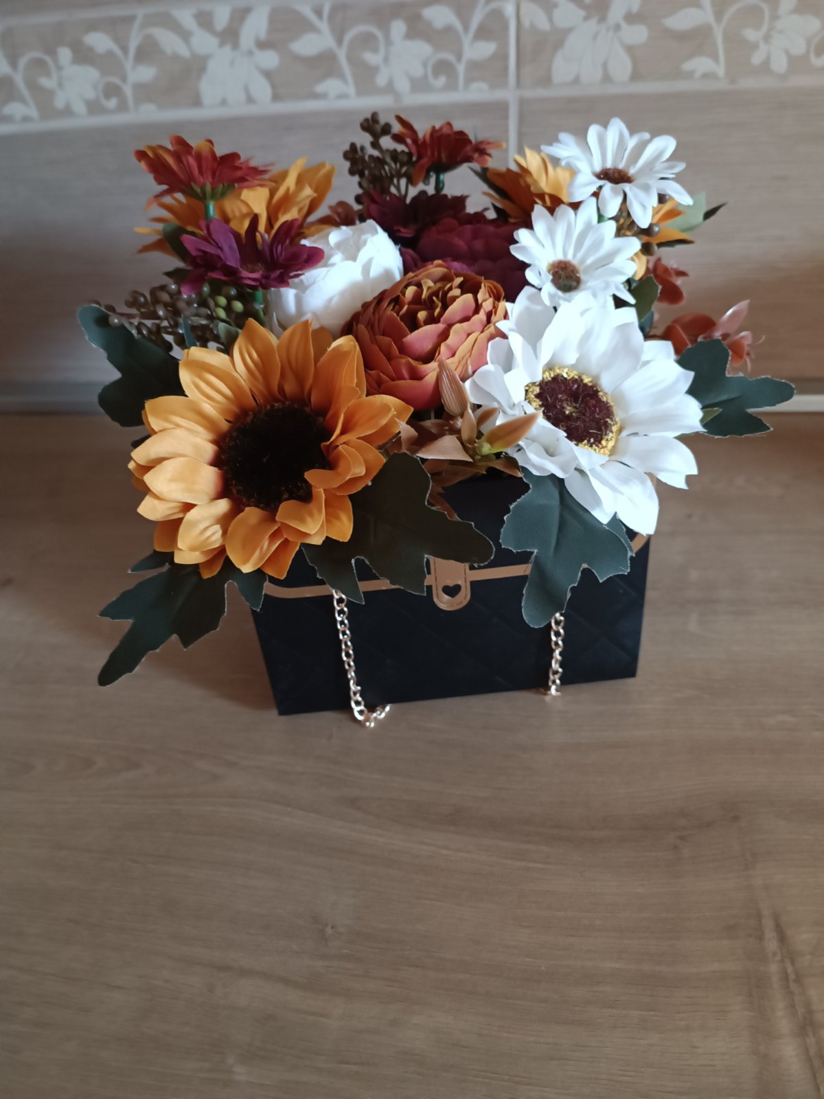 Aranžmán kvetov v kabelke, dekorácia