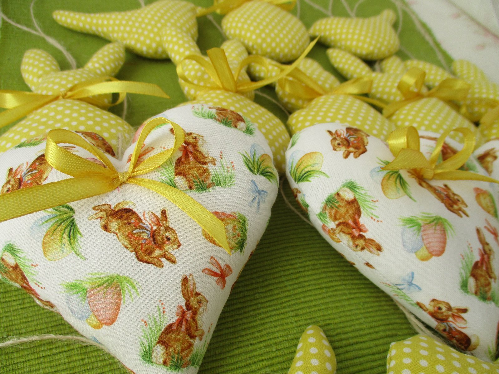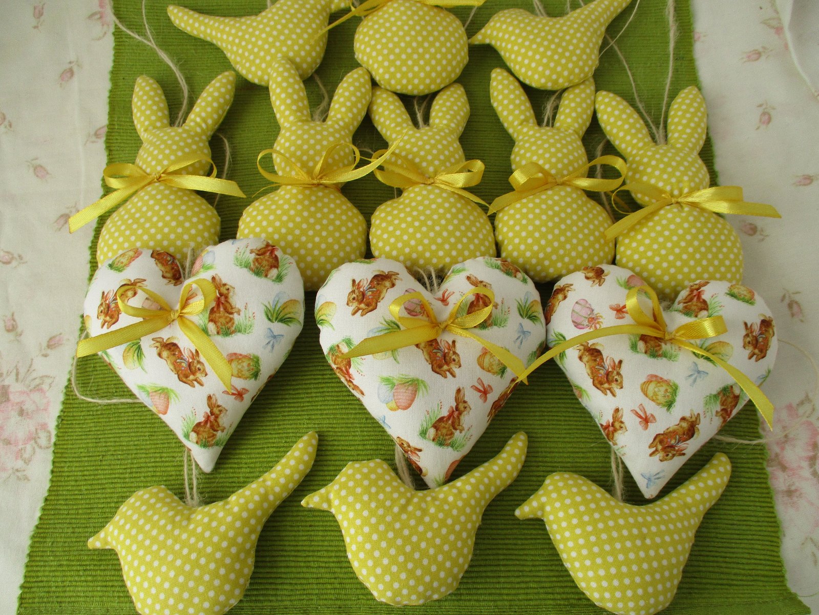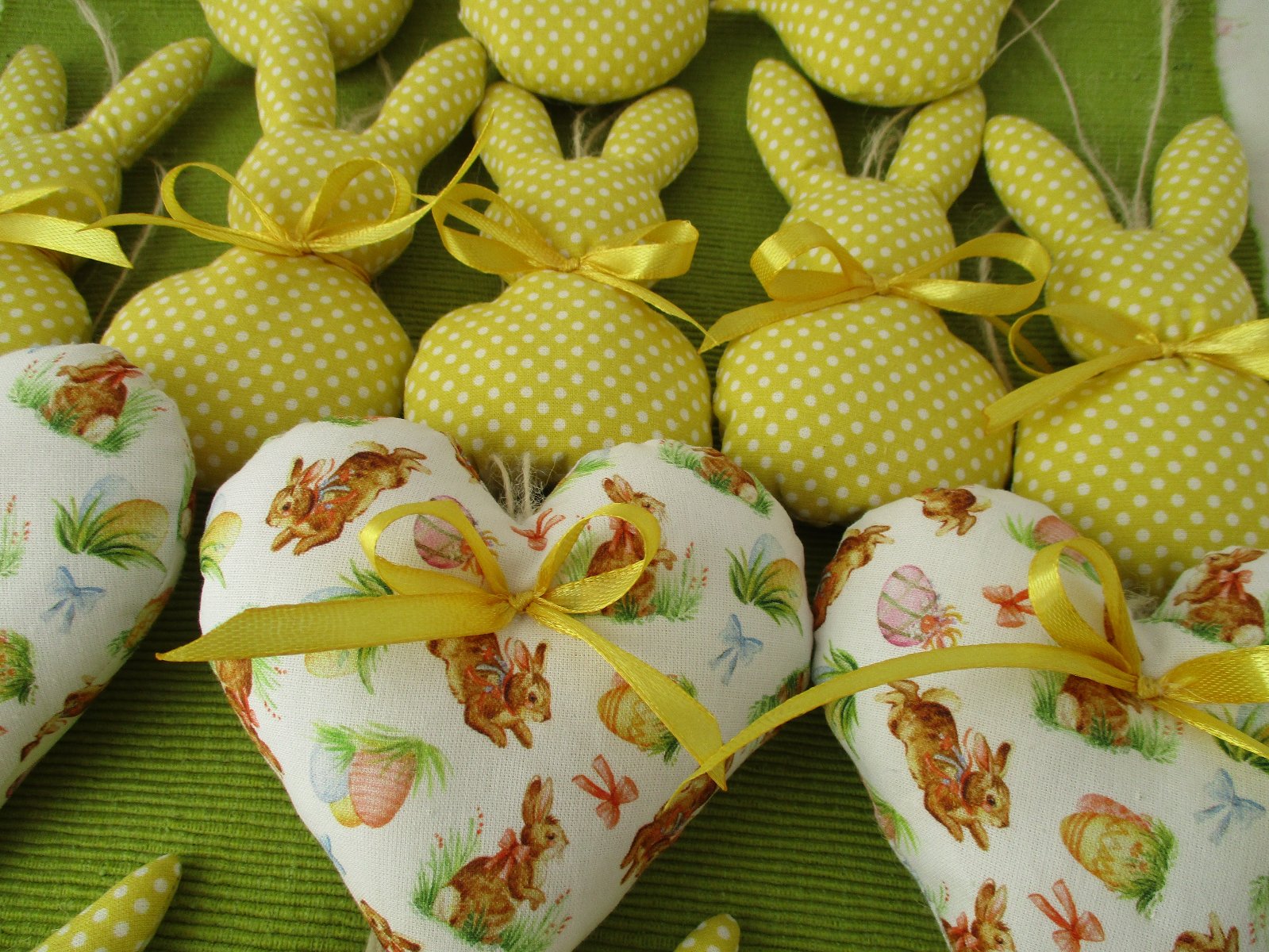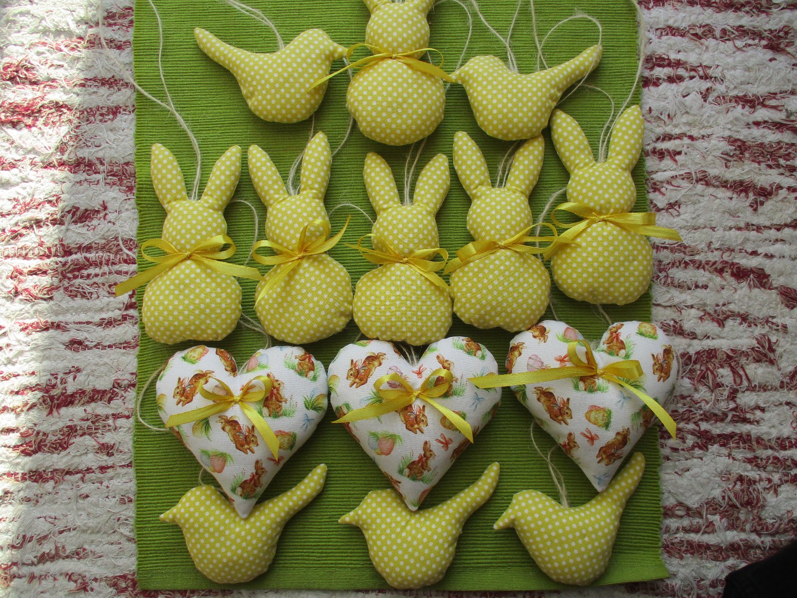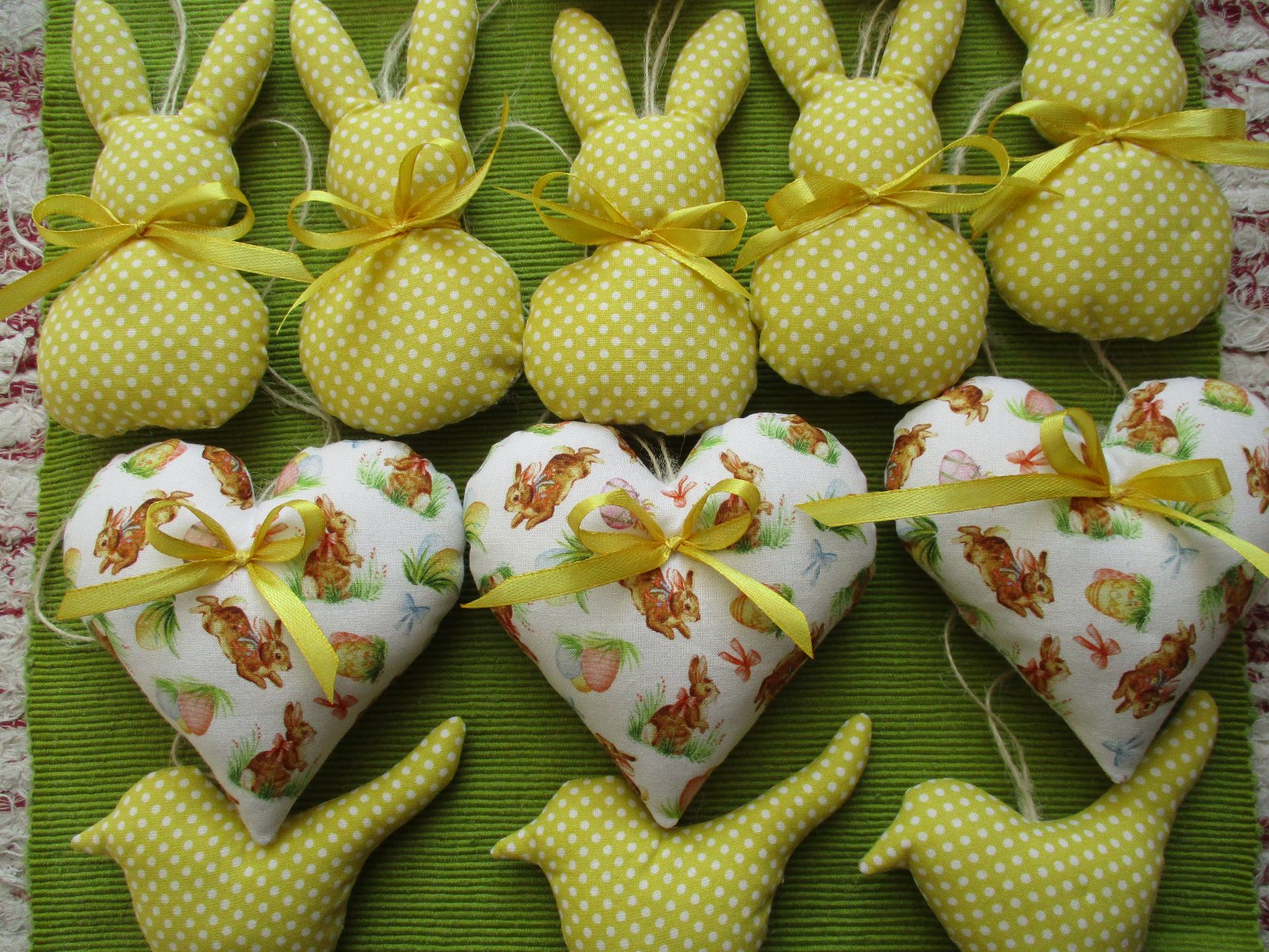 Veľkonočná nádielka ušitá z bavlnených látok pozostávajúca zo zajačikov a vtáčikov v žltom prevedení s bielymi bodkami a zo srdiečok s veľkonočným motívom, prizdobených žltými stužkami a s konopným motúzikom na zavesenie. Veľkosť: výška 12cm, 11cm, 6cm; cena za jeden kus je 1,- €+poštovné