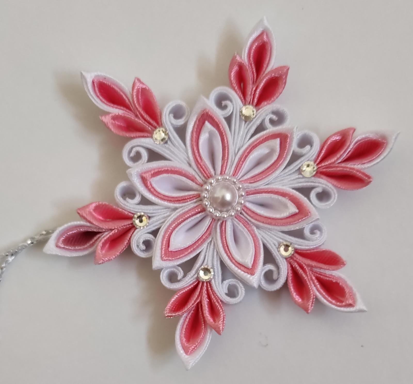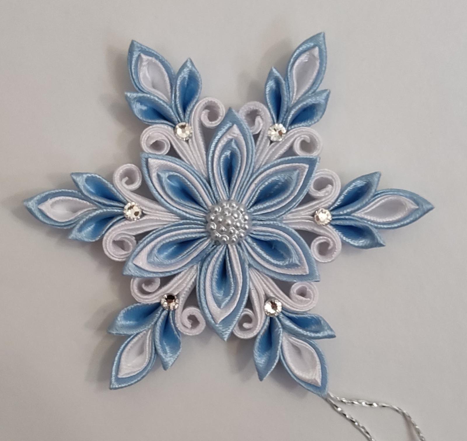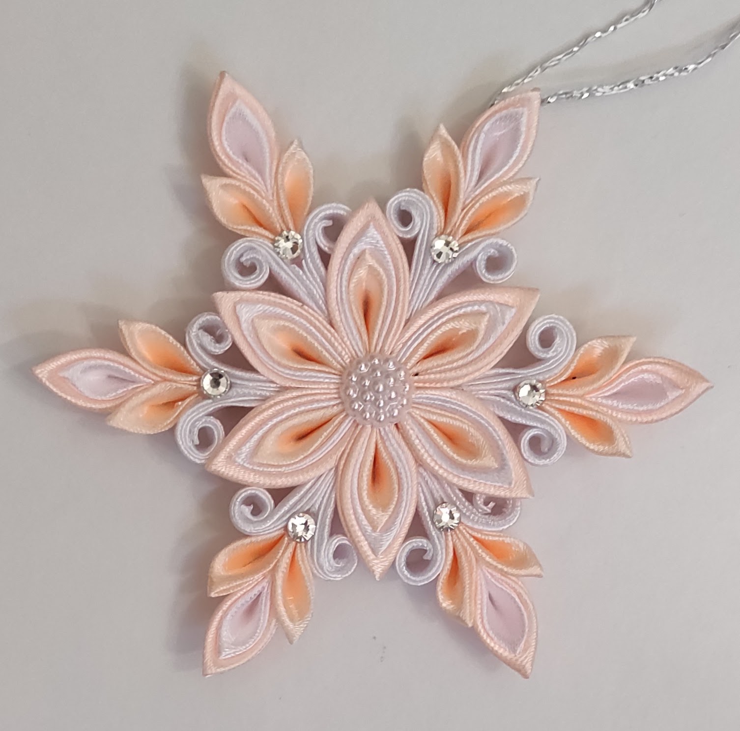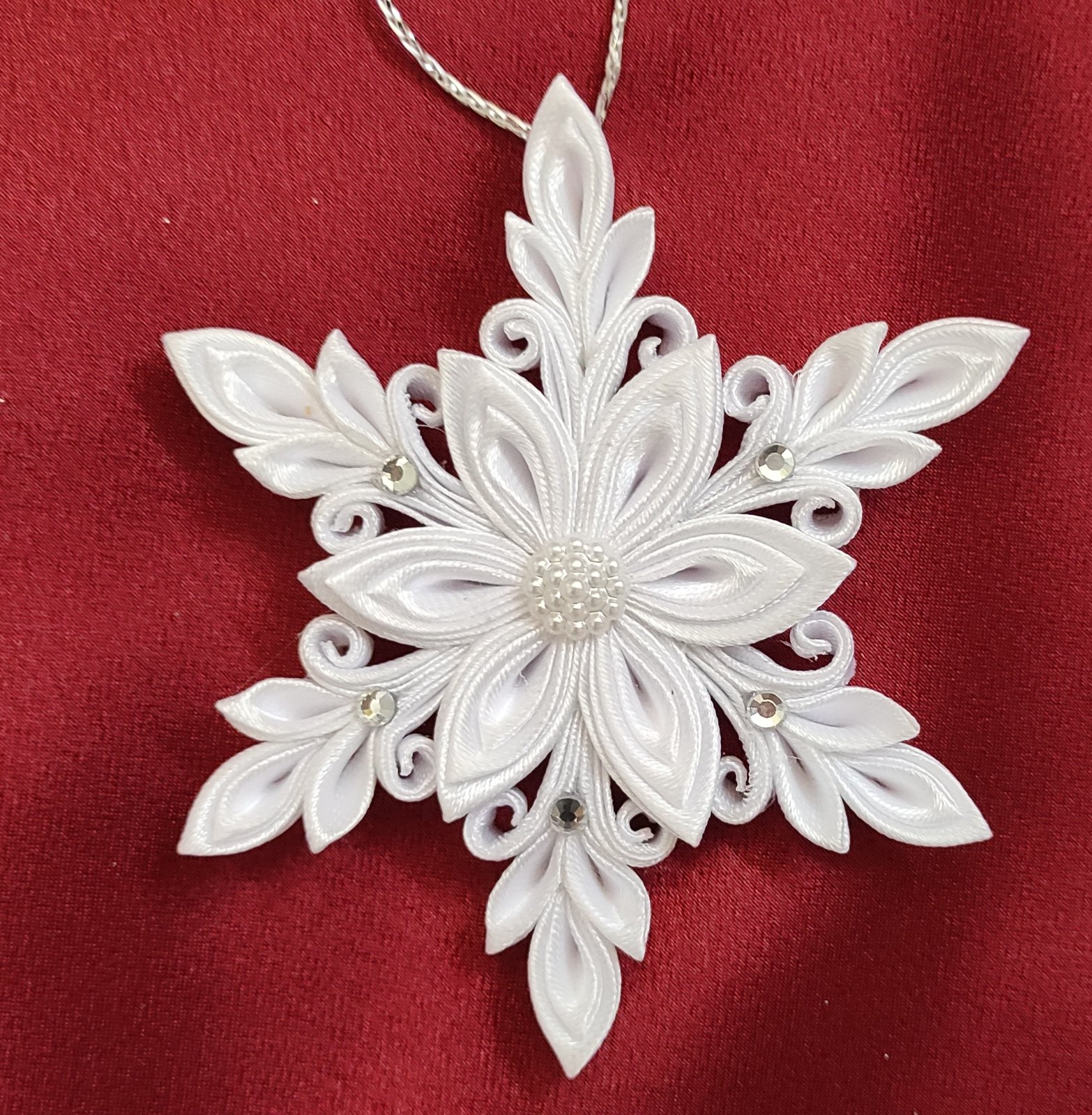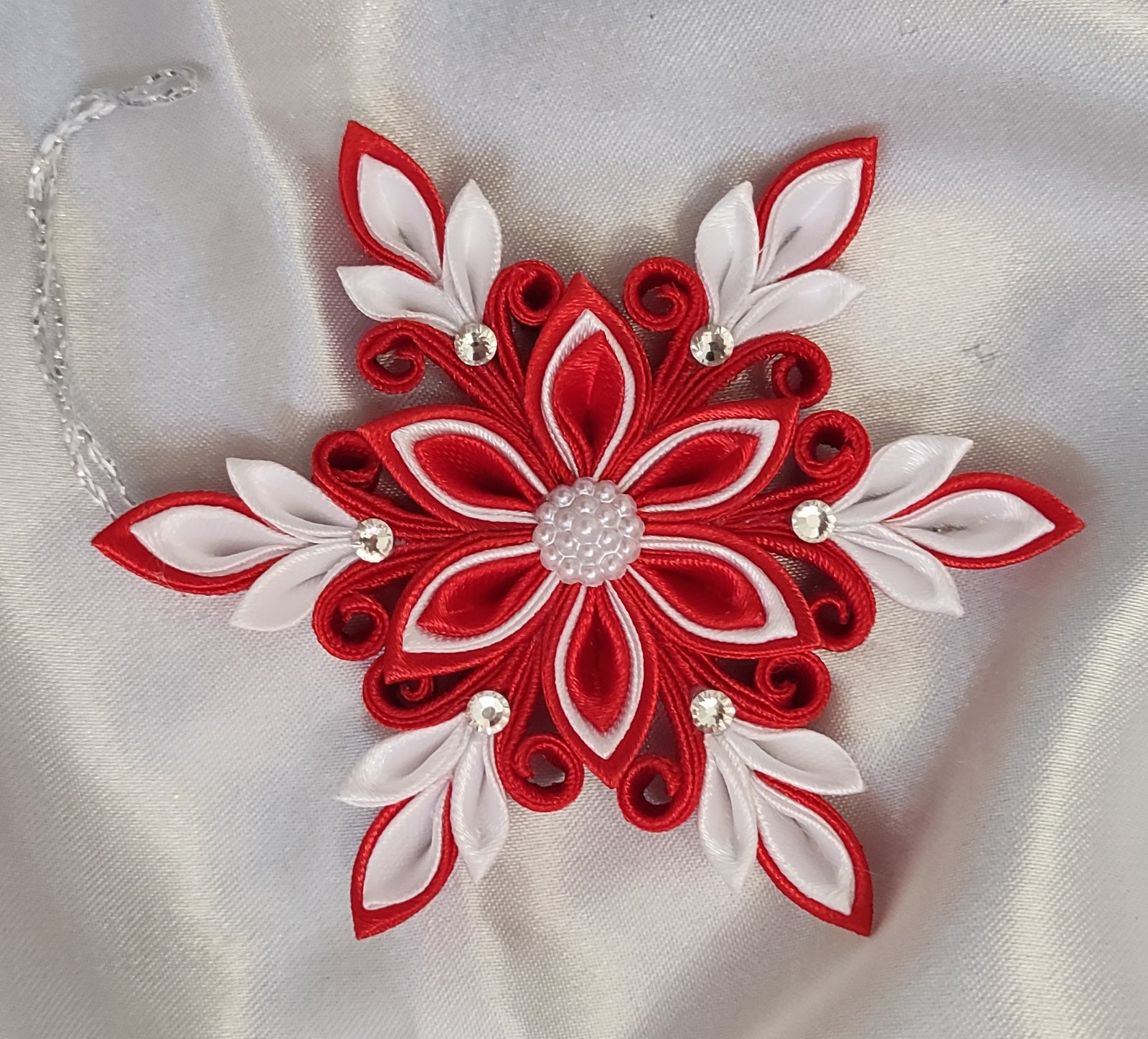 Saténová vianočná vločka v dvojfarebnej kombinácii dozdobená štrasovými kamienkami sa nádherne zaligoce v žiare vianočných svetielok, dodávajúc stromčeku nádych elegancie.