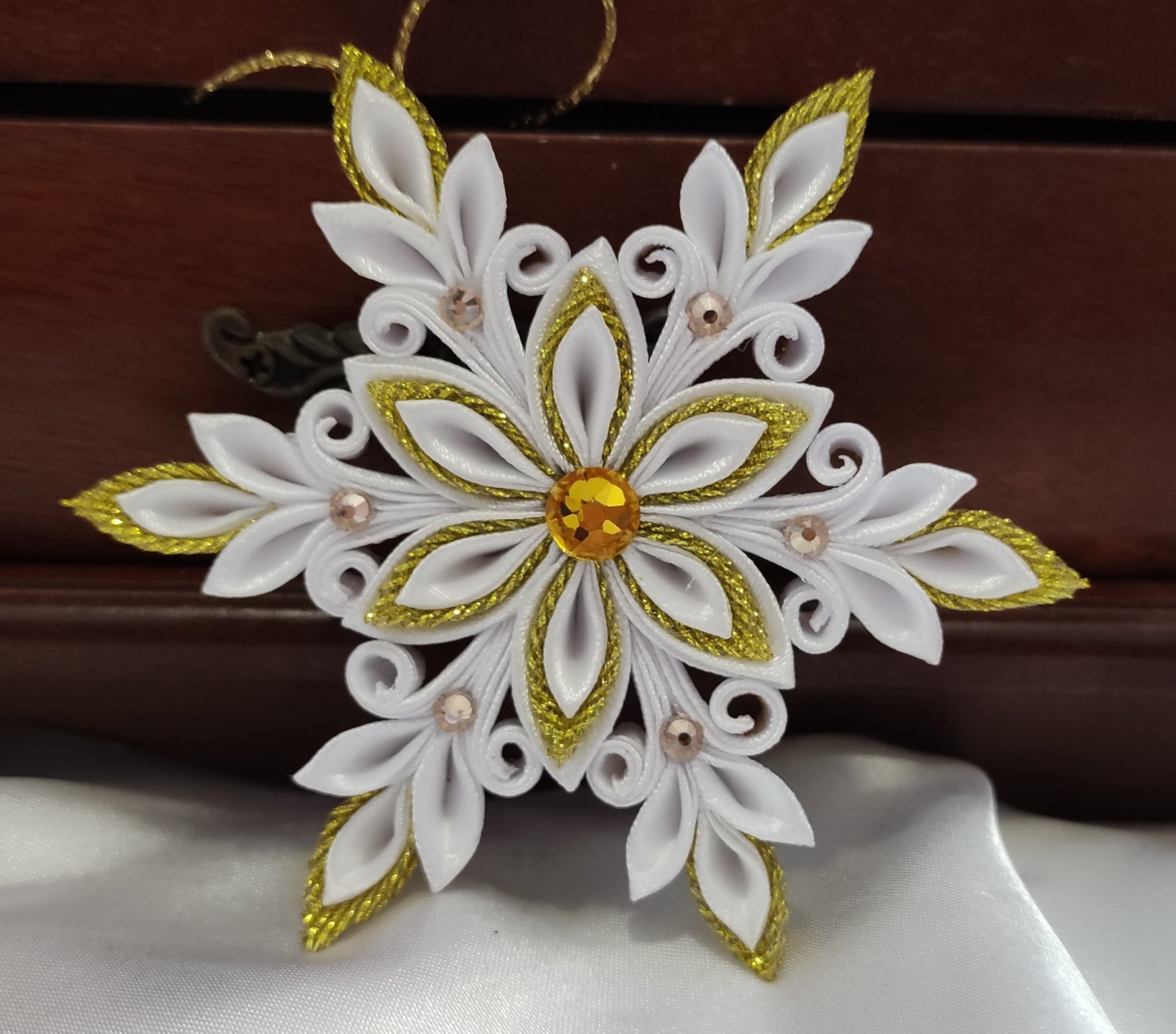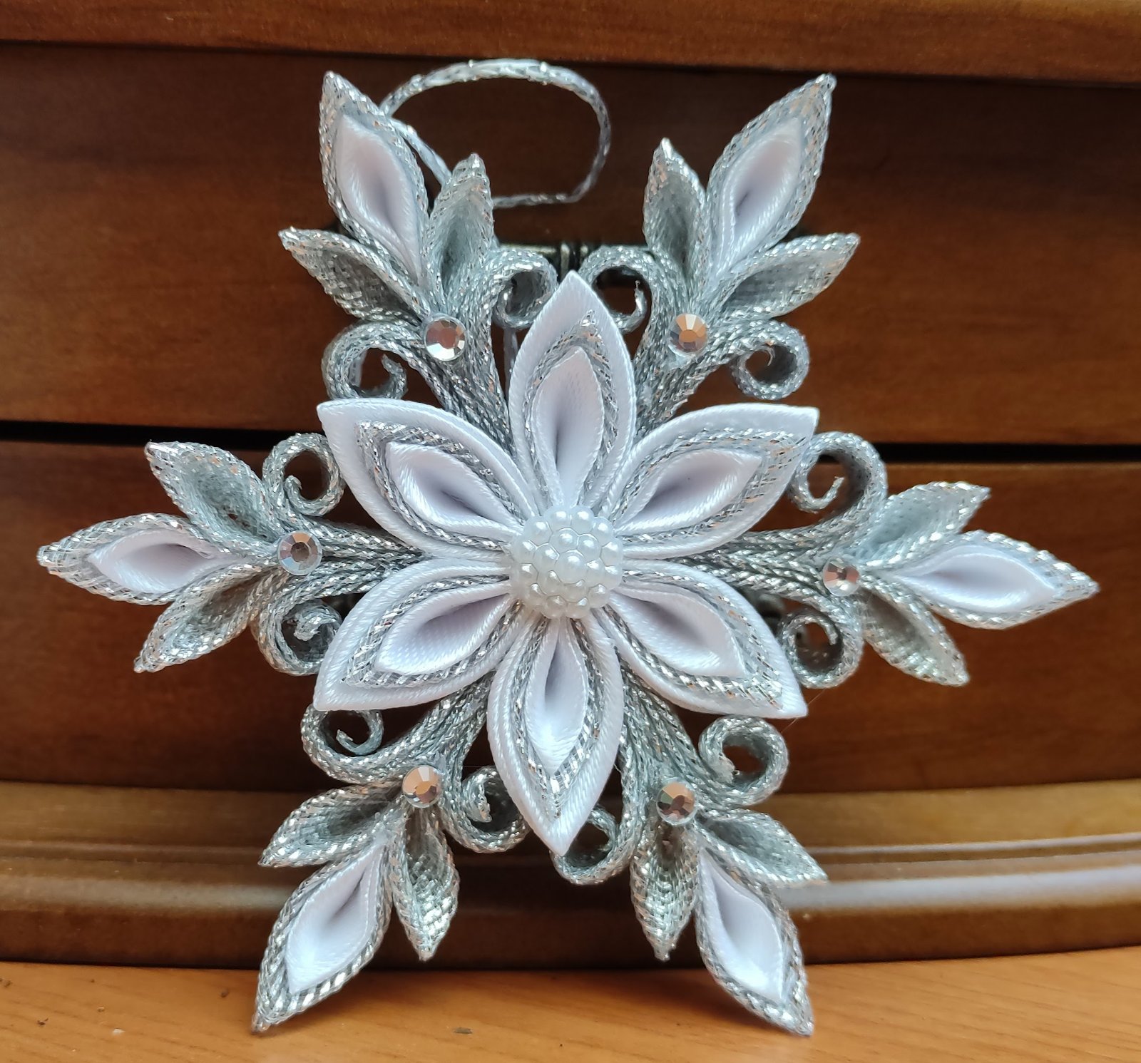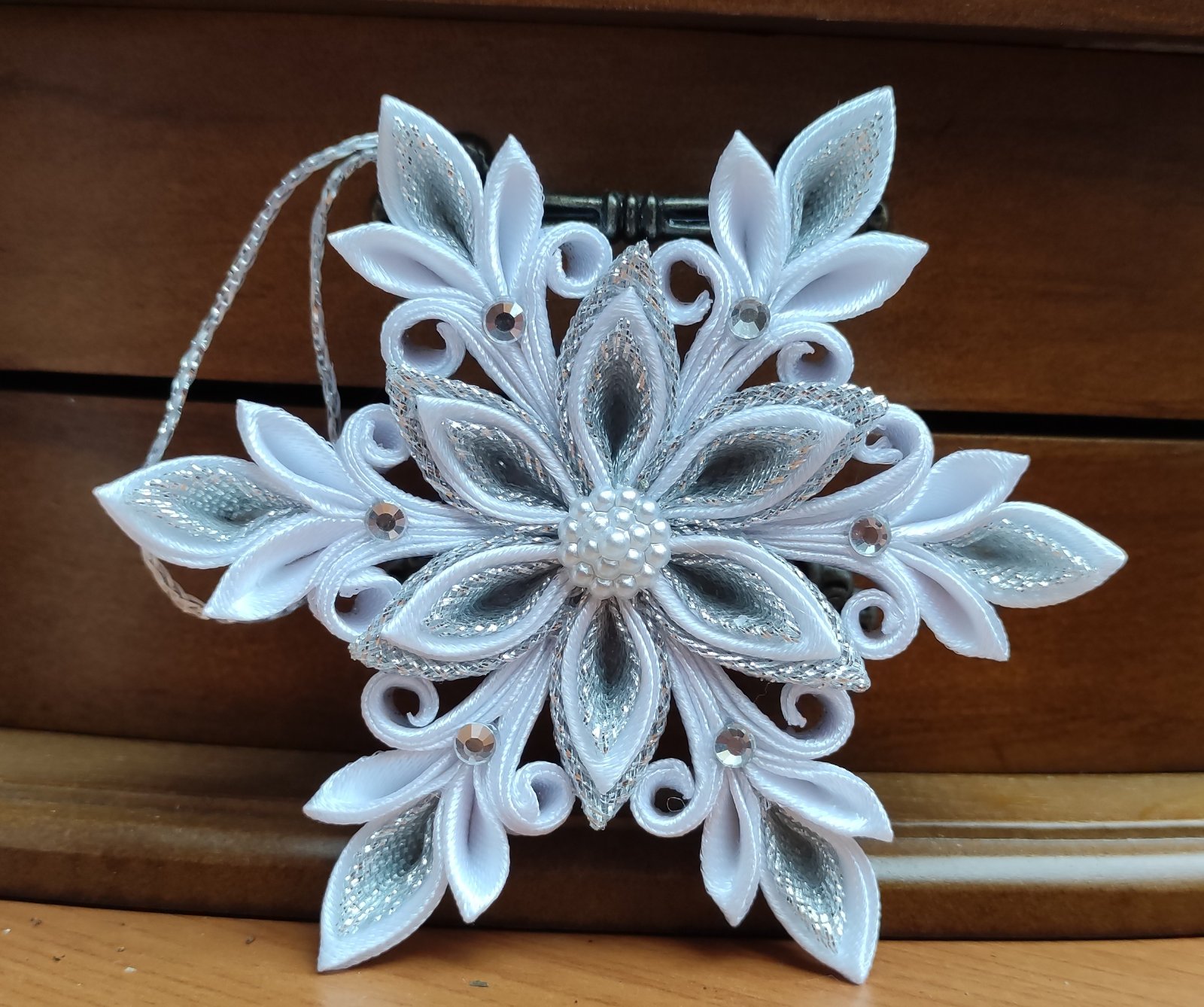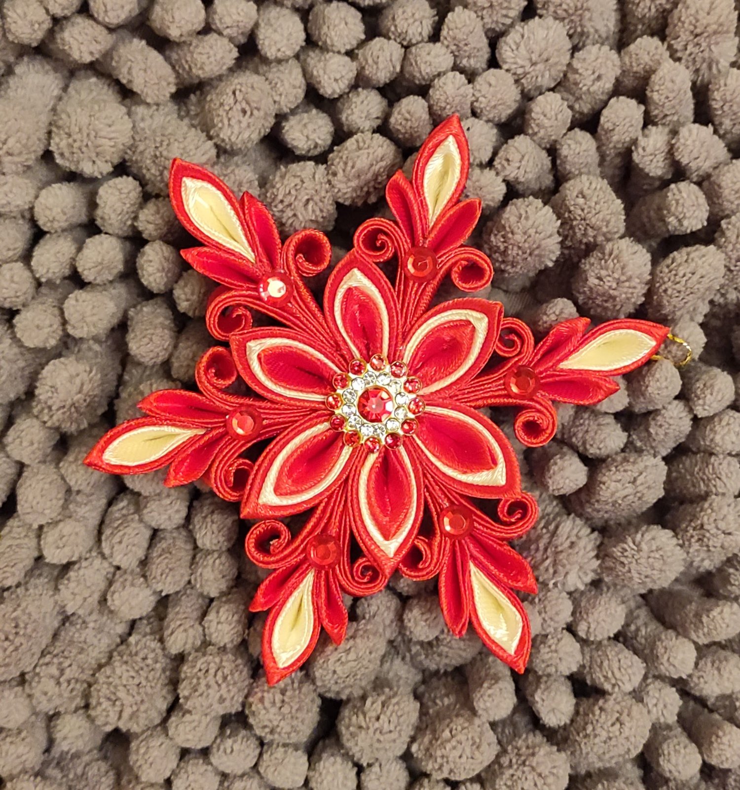 Saténová vianočná vločka v dvojfarebnej kombinácii dozdobená štrasovými kamienkami sa nádherne zaligoce v žiare vianočných svetielok, dodávajúc stromčeku nádych elegancie.