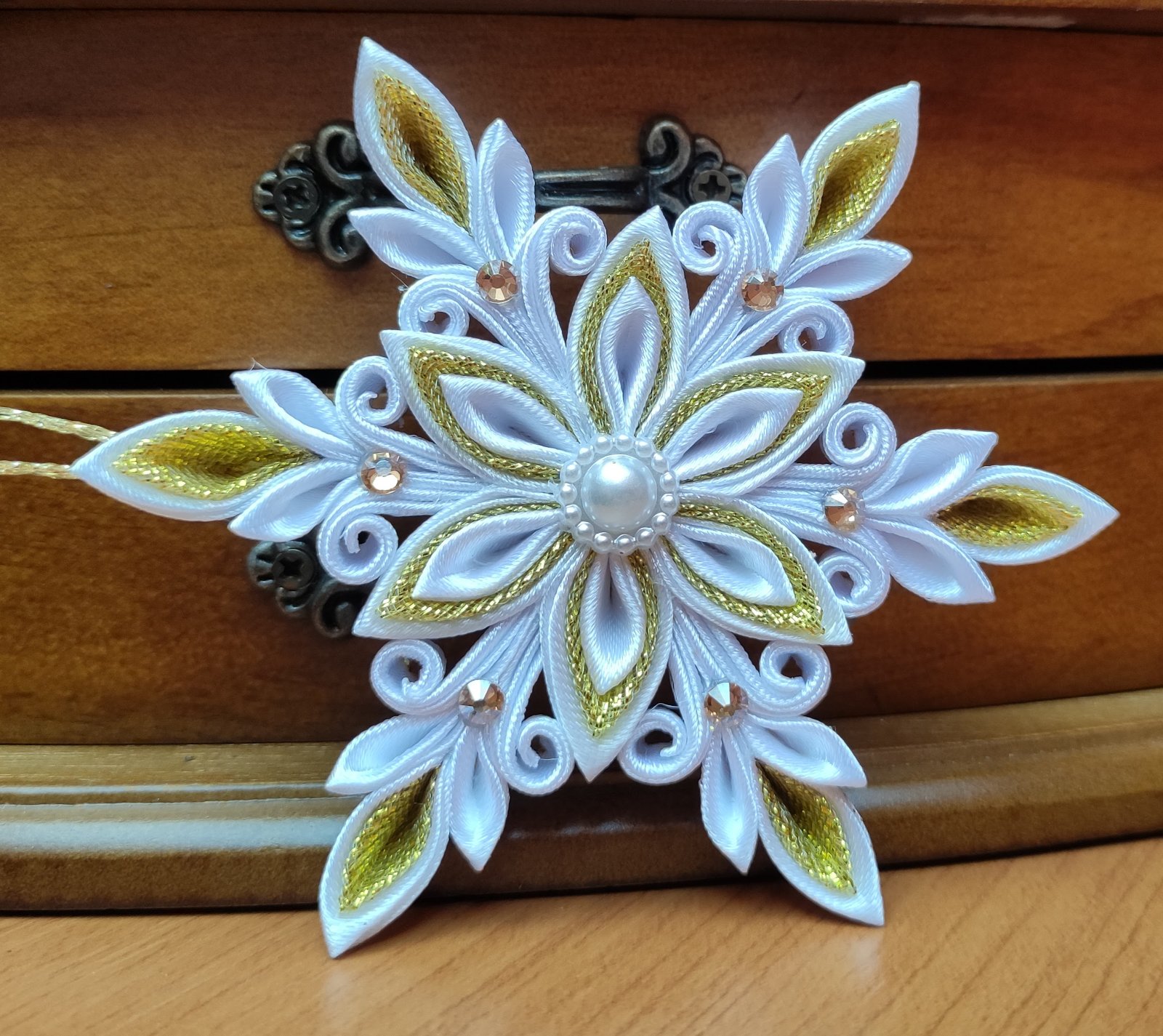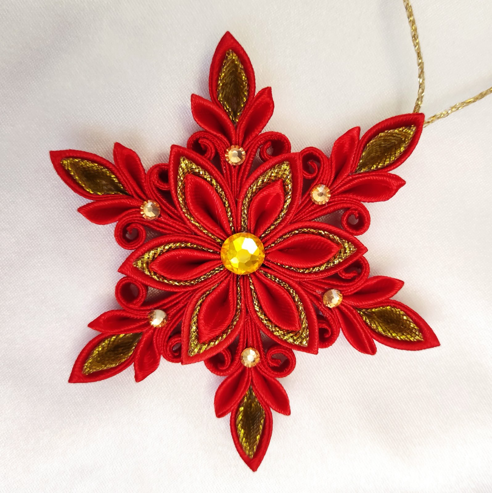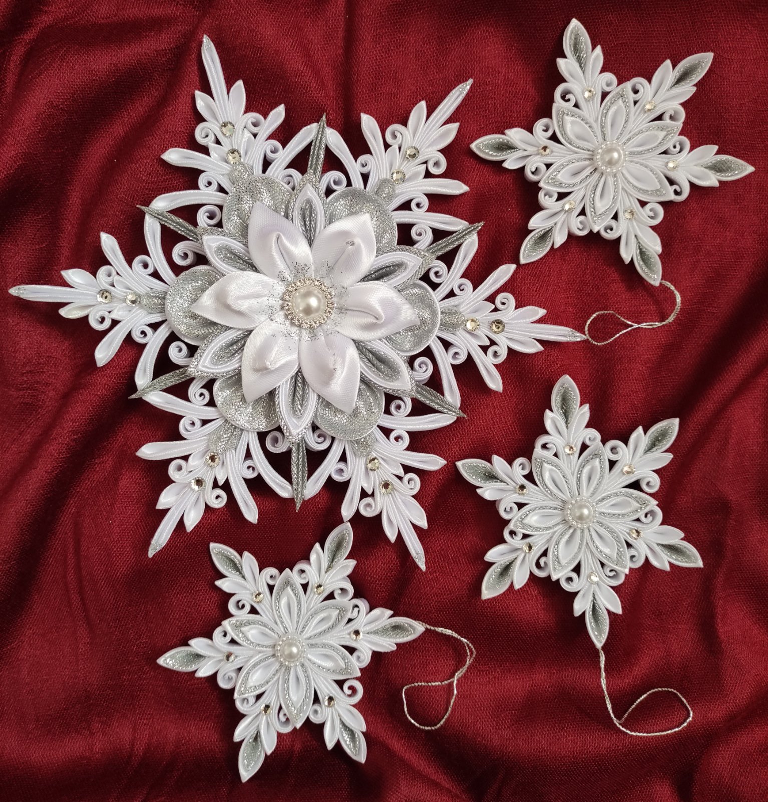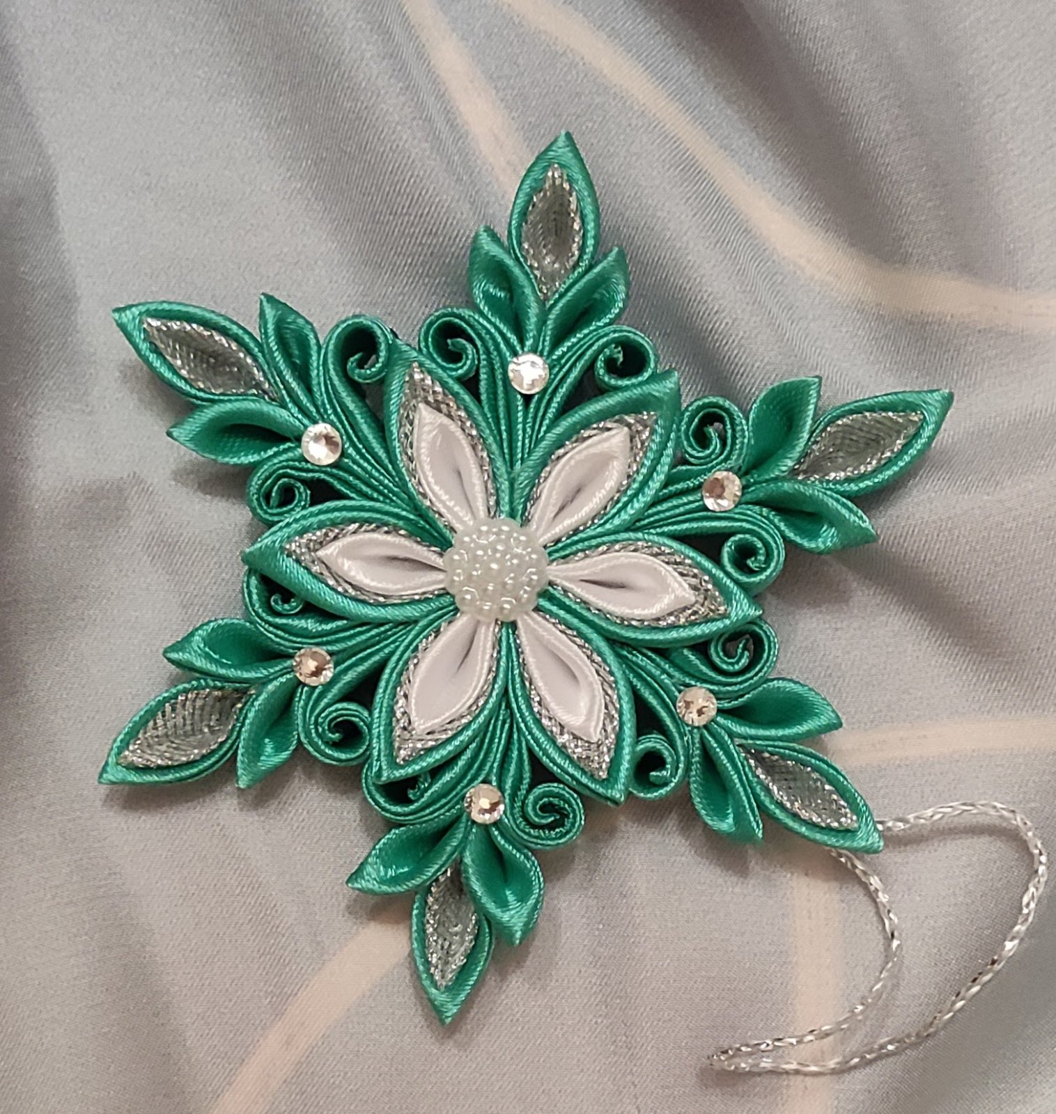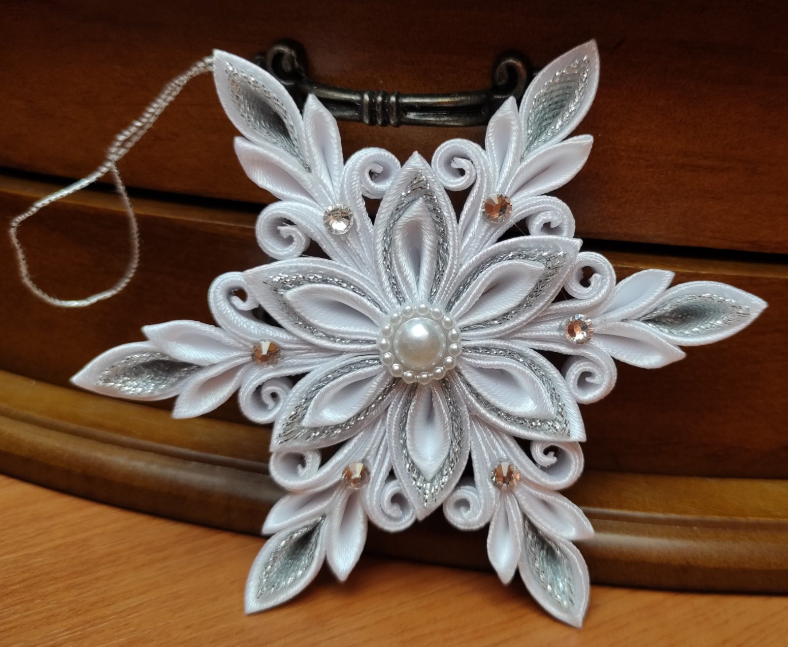 Saténová vianočná vločka v dvojfarebnej kombinácii dozdobená štrasovými kamienkami sa nádherne zaligoce v žiare vianočných svetielok, dodávajúc stromčeku nádych elegancie.