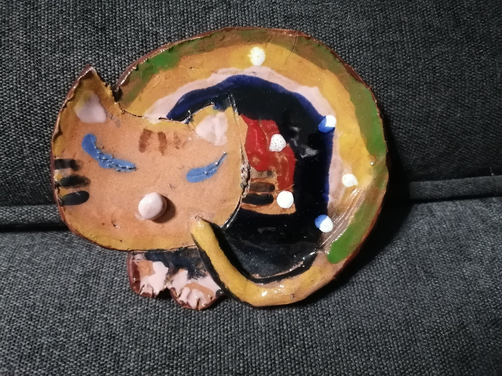 Predám tanierik z pálenej glazovanej hliny - spiace mačiatko, slúži na odkladanie šperkov, alebo mlsoty. Hand made. Cena je 10 € plus poštovné alebo osobný odber v BA.