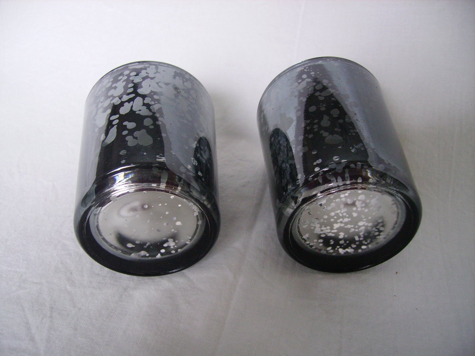 - dva menšie sklenené čierno (tmavošedo)-strieborné, minimálne používané, na čajovú sviečku, cez prázdne prskané priestory na skle voľne preniká svetlo, vytvára to pekný efekt; výška 7 cm a priemer 5,5 cm; cena 2 €