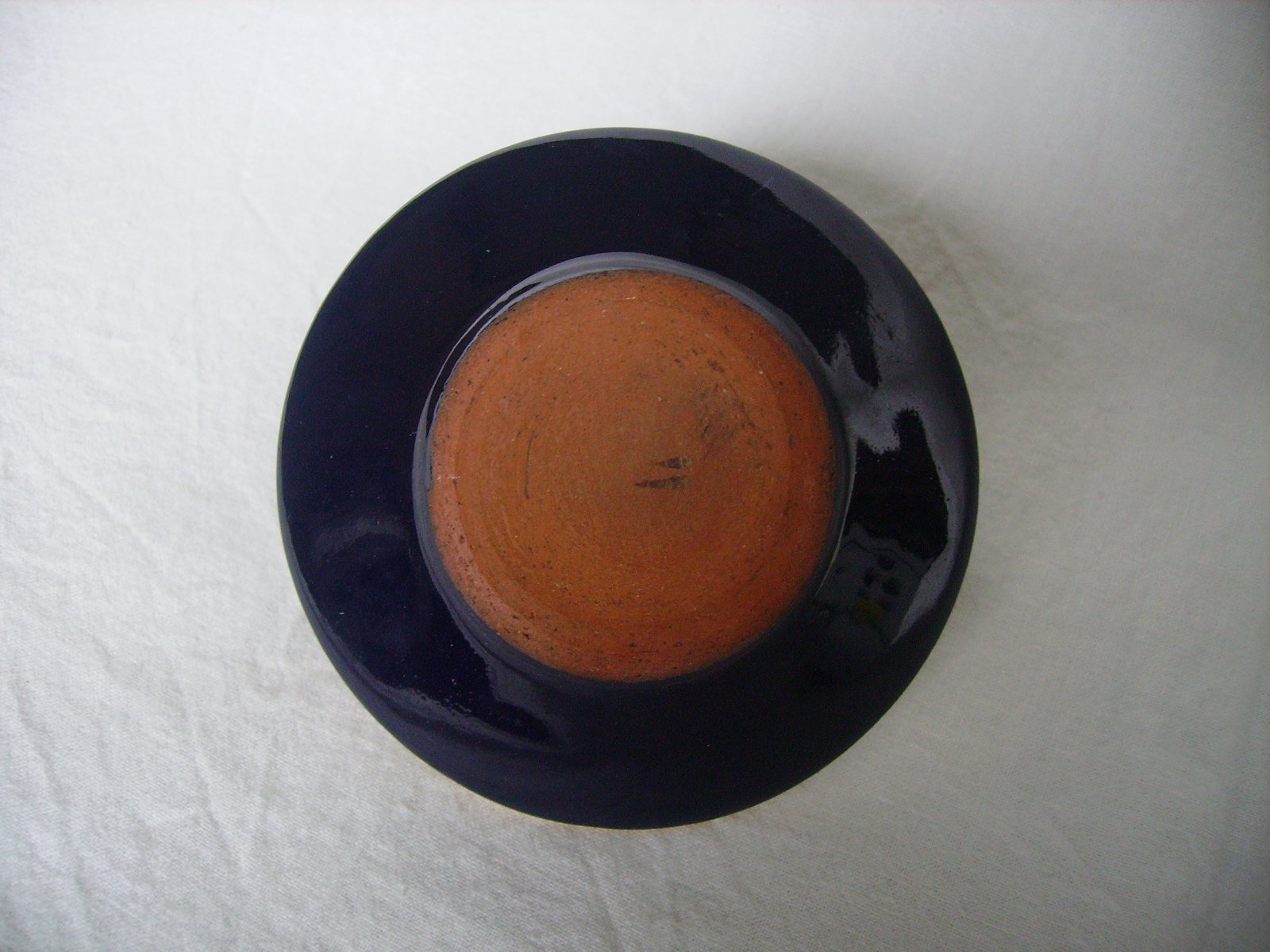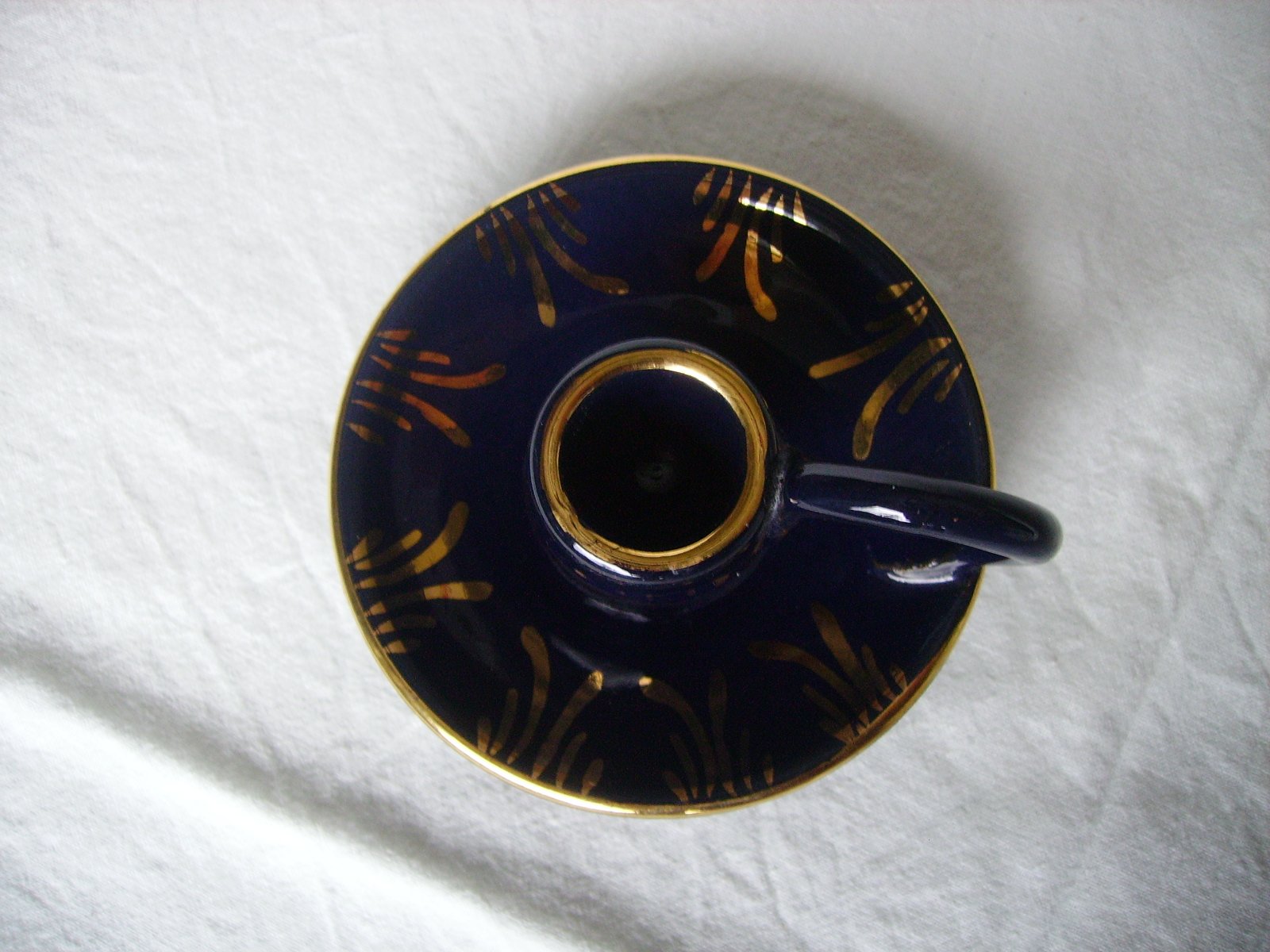 - keramický tmavomodrý glazovaný so zlatým zdobením, krásna práca, viem že k nemu existuje aj sada ostatných stolovacích alebo úžitkových predmetov, tak možno niekomu chýba do zbierky, nepoužívaný, na vysokú sviečku; výška 4,5 cm a priemer 8,5 cm; cena 3 €