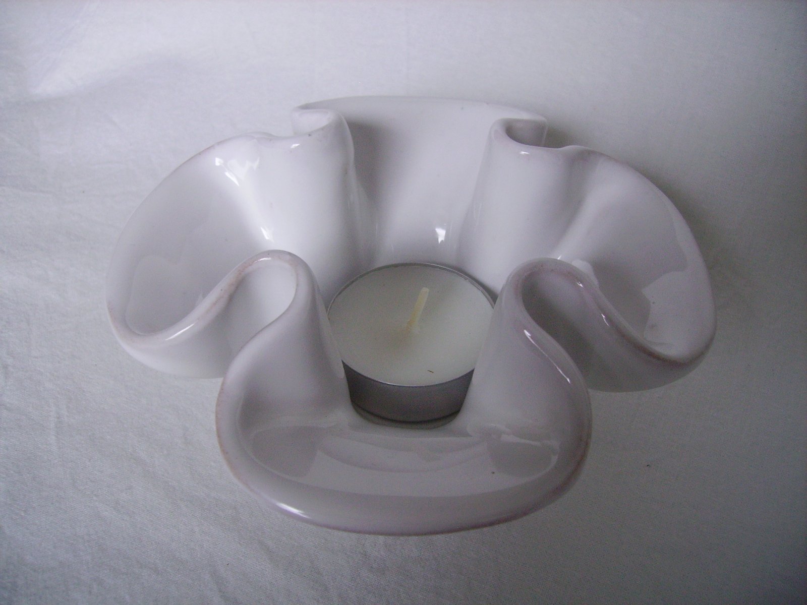- keramický biely glazovaný, nepoužívaný, na čajovú sviečku, zaujímavý zvlnený štvorlístkový tvar; výška 5,5 cm a priemer 12,5 cm; cena 3 €