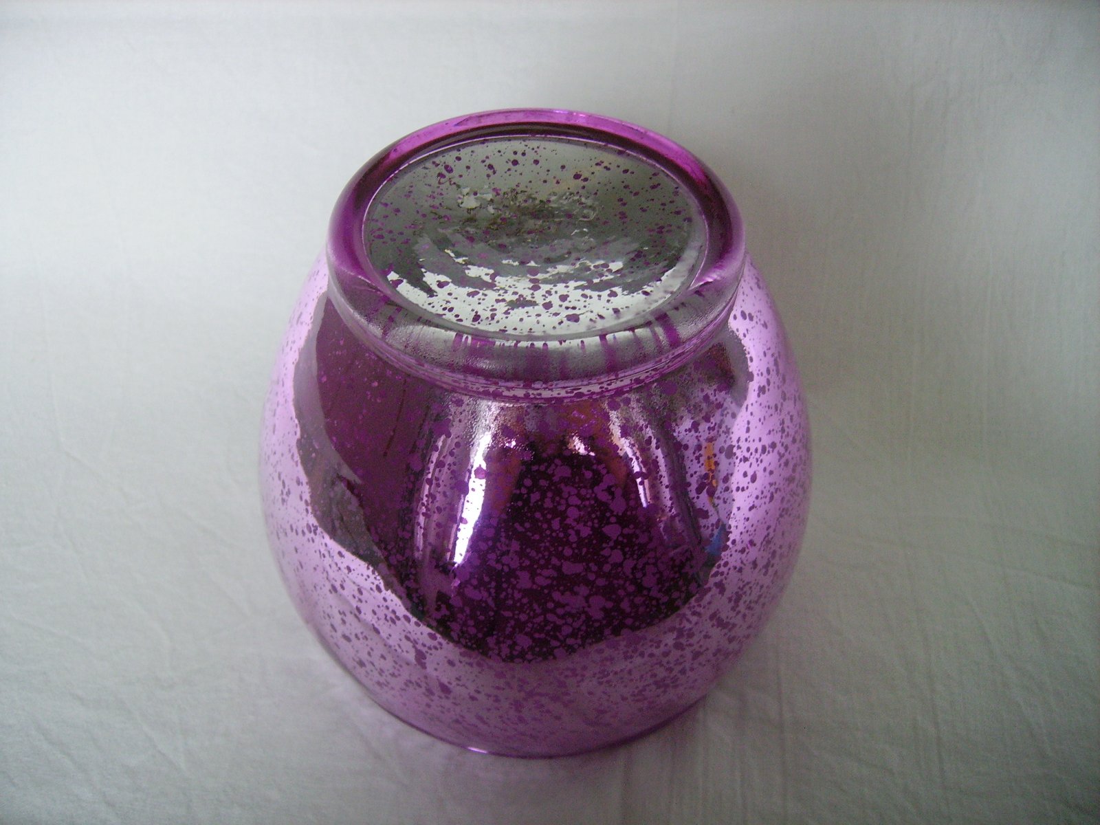 - väčší sklenený fialovo-strieborný, minimálne používaný, dá sa vložiť väčšia samostatná svieca a cez prázdne prskané priestory na skle voľne preniká svetlo, vytvára to pekný efekt; výška 11,5 cm a priemer 13,5 cm; cena 5 €