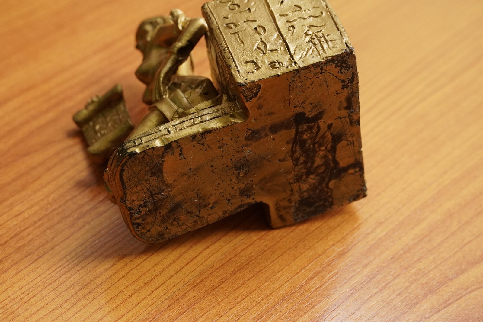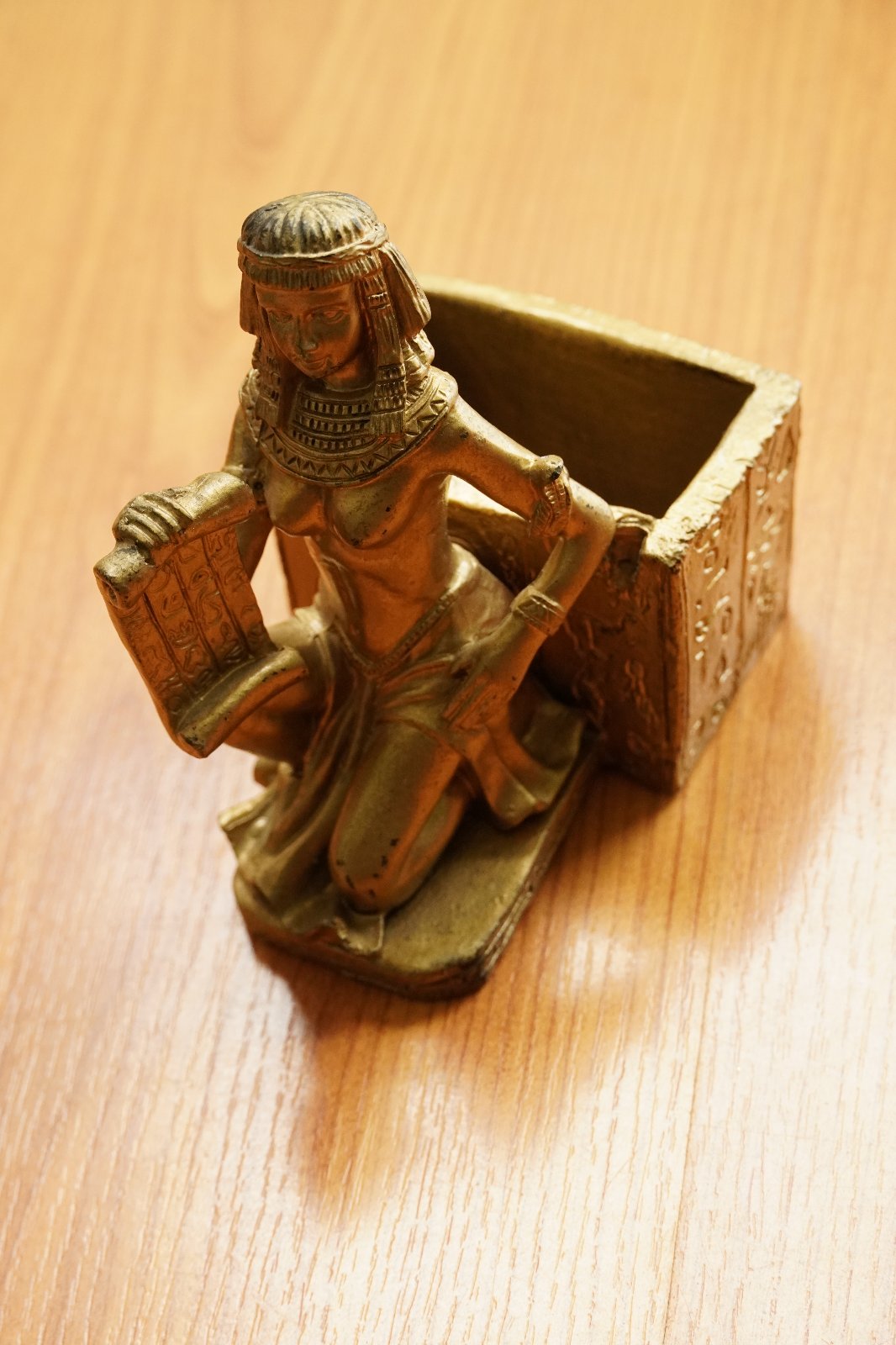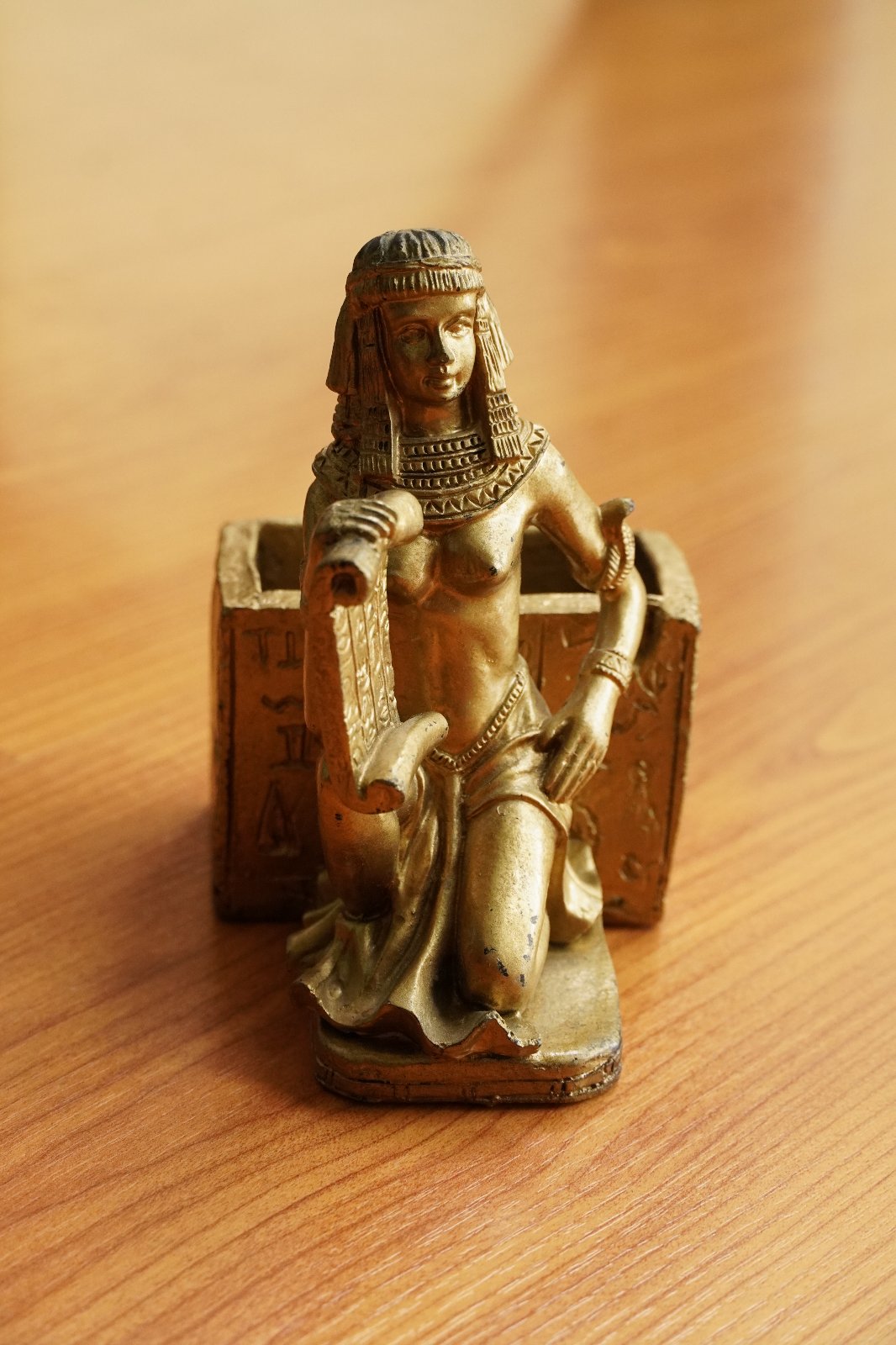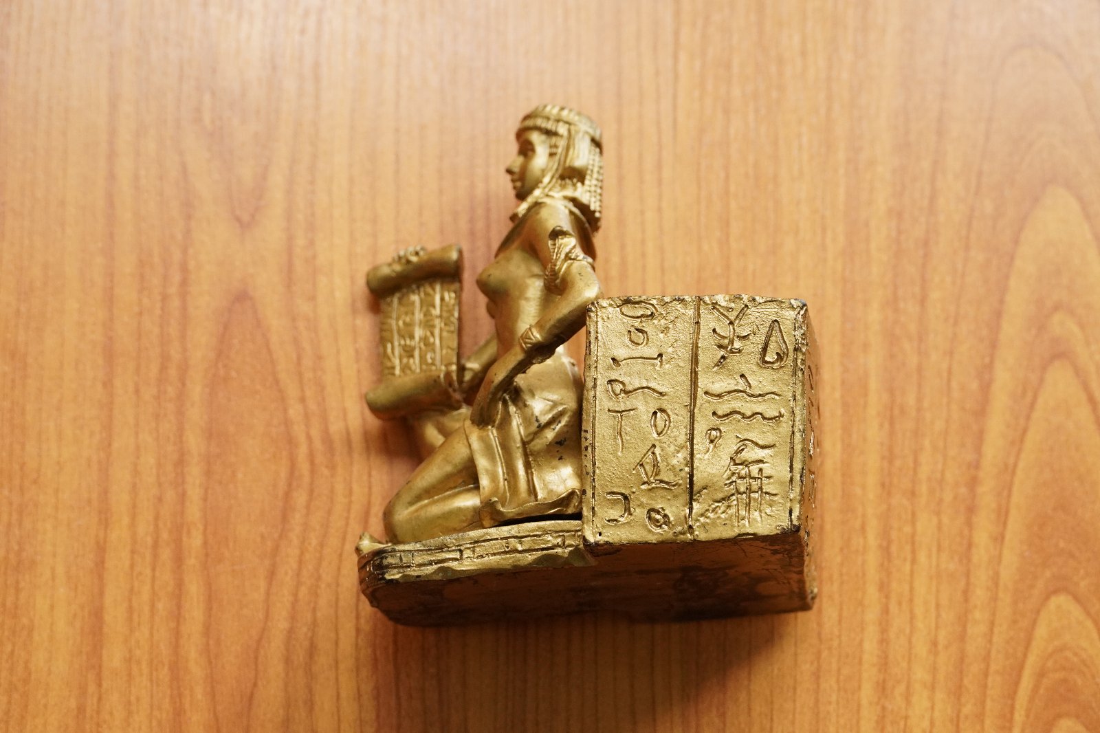 Egyptská soška a stojan s egyptskými symbolmi v zlatej farbe.