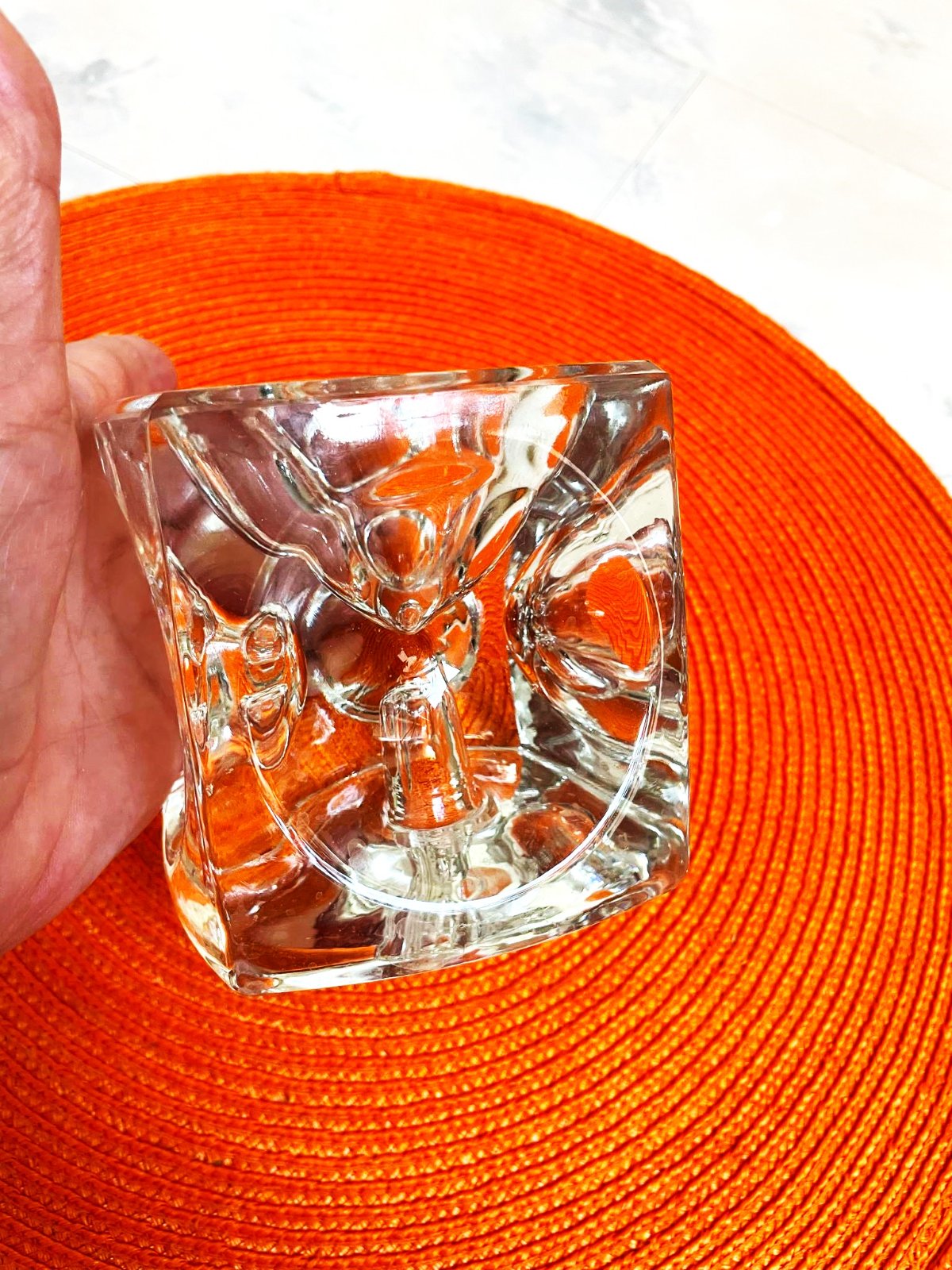 krásny mohutný svietnik BOHEMIA, z hrubého nerozbitného kvalitného skla,9 x 9 cm, na každej strane po bokoch je akoby vyhĺbená pologuľa - do nej sa vloží sviečka - je jedno aká, aj napr. čajová, na spodku otvor na úzku vysokú štíhlu sviečku,pozri k tomu aj :