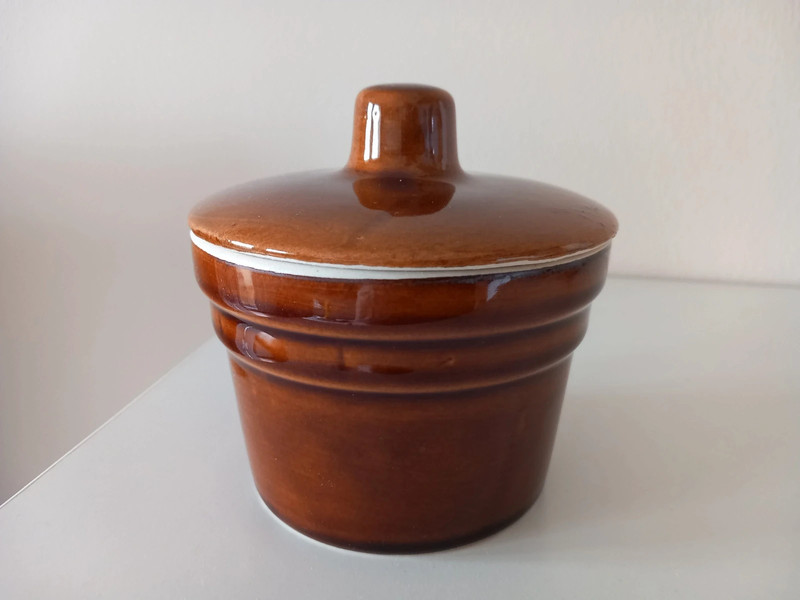 Stará ťažšia keramická/kameninová dóza z domácnosti po zosnulej mamine, s hrubou lesklou glazovanou vrstvou. Bola založená v skrini, je vo veľmi peknom stave, známky používania nejaví. Celková výška aj s vekom 11,5 cm, výška dózy bez veka 8 cm, celková šírka dózy 11,5 cm, priemer otvoru dózy 10 cm. Tmavohnedá farba.