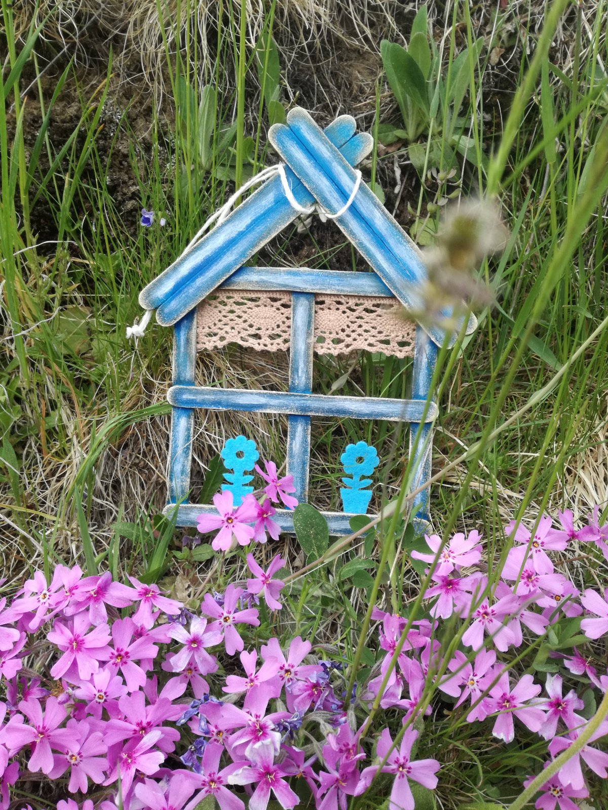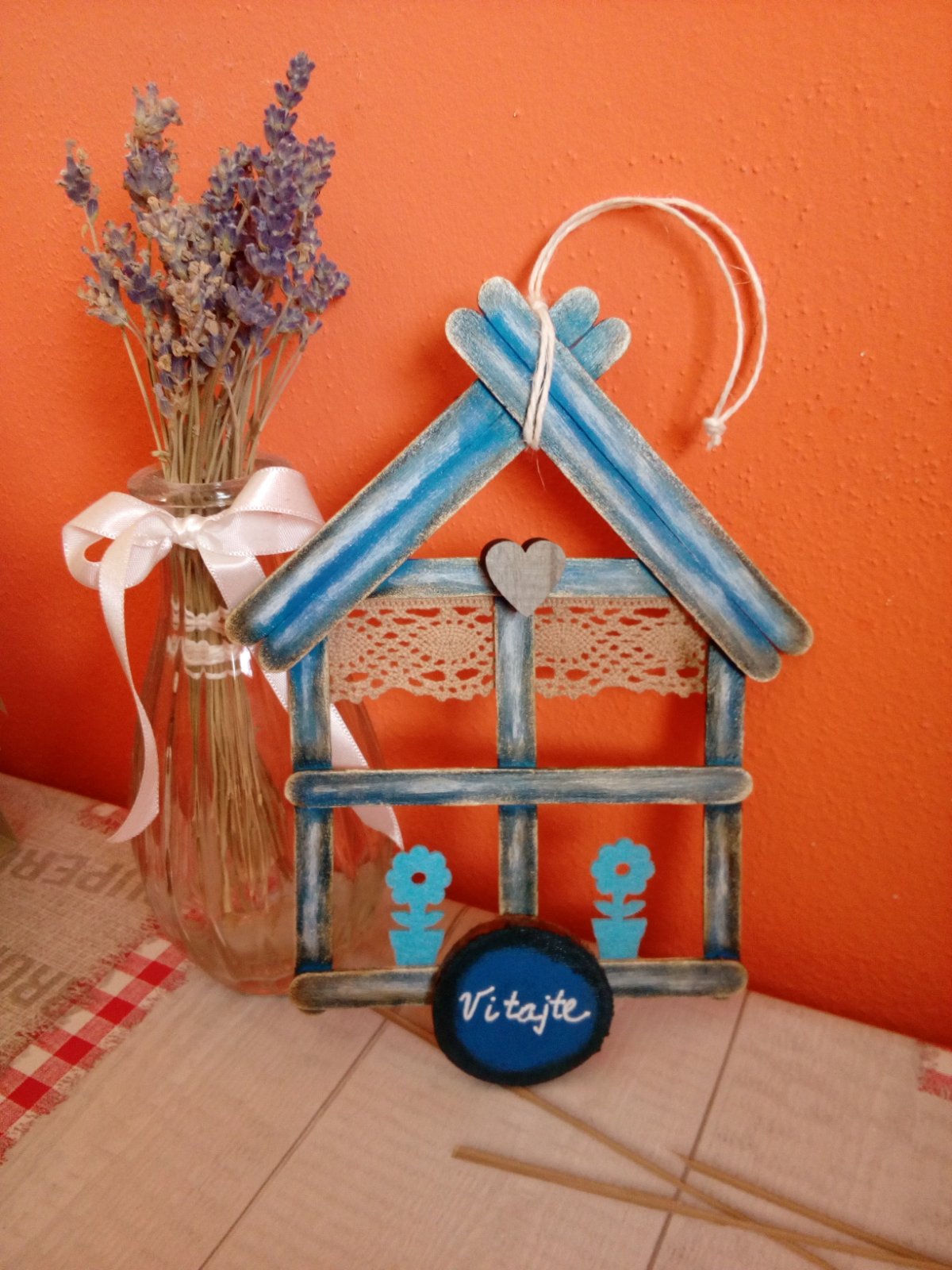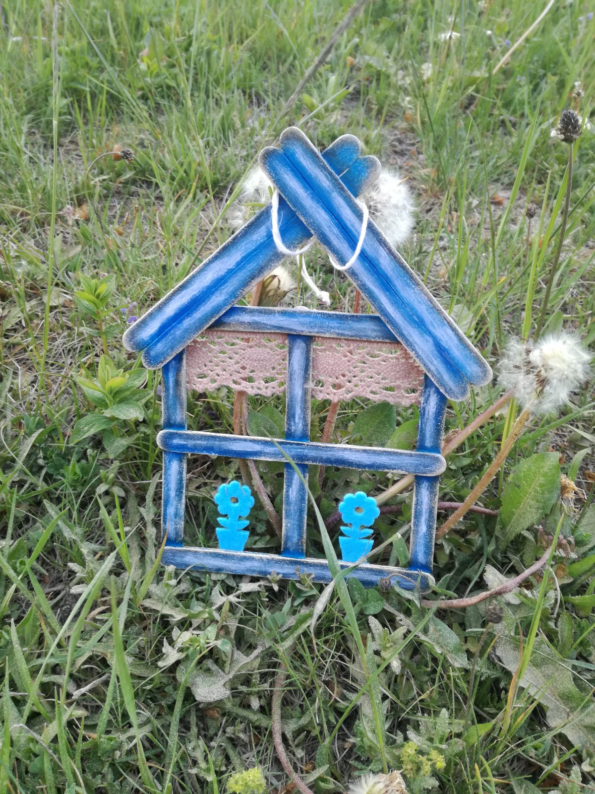 Domček vyrobený z drevených paličiek maľovaný akrylovými farbami a patinou doplnene čipkou..na zavesenie