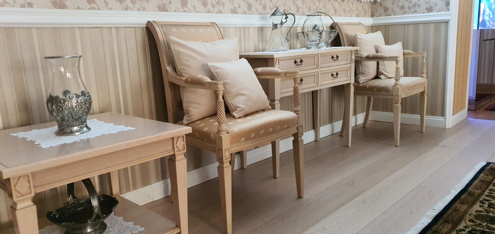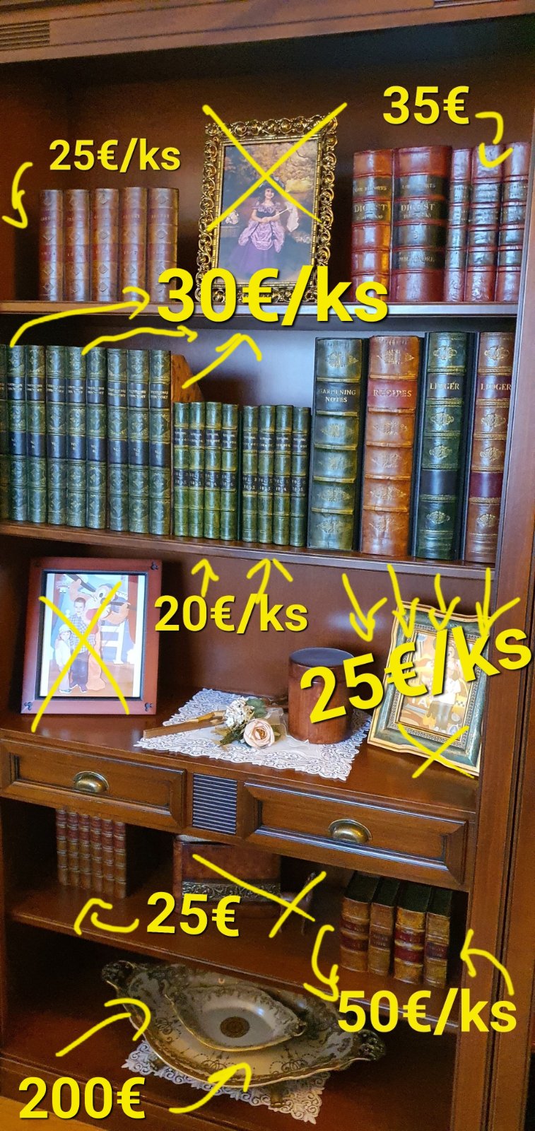 Rozne doplnky, sosky, smetne kose, zakladace (imitacie knih)-predane vsetko, zvysok co je na foto su ako hodiny, misy, svietnik, lampa alabastrova, cajove aj kavove supravyKarlovarsky porcelan, kt.stale stoja vyse 300€, supravu ponukame po 100€.. ceny pripadne rozmery, viac foto preposleme aj do sukr.spravy, kludne osobne priamo vŽiline, na predaj aj nabytok, zistali este dva perske koberce i porcelan.. Ceny su od 15€.. .v okoli Žiliny vieme doviezt osobne, pripadne posleme aj postou..
