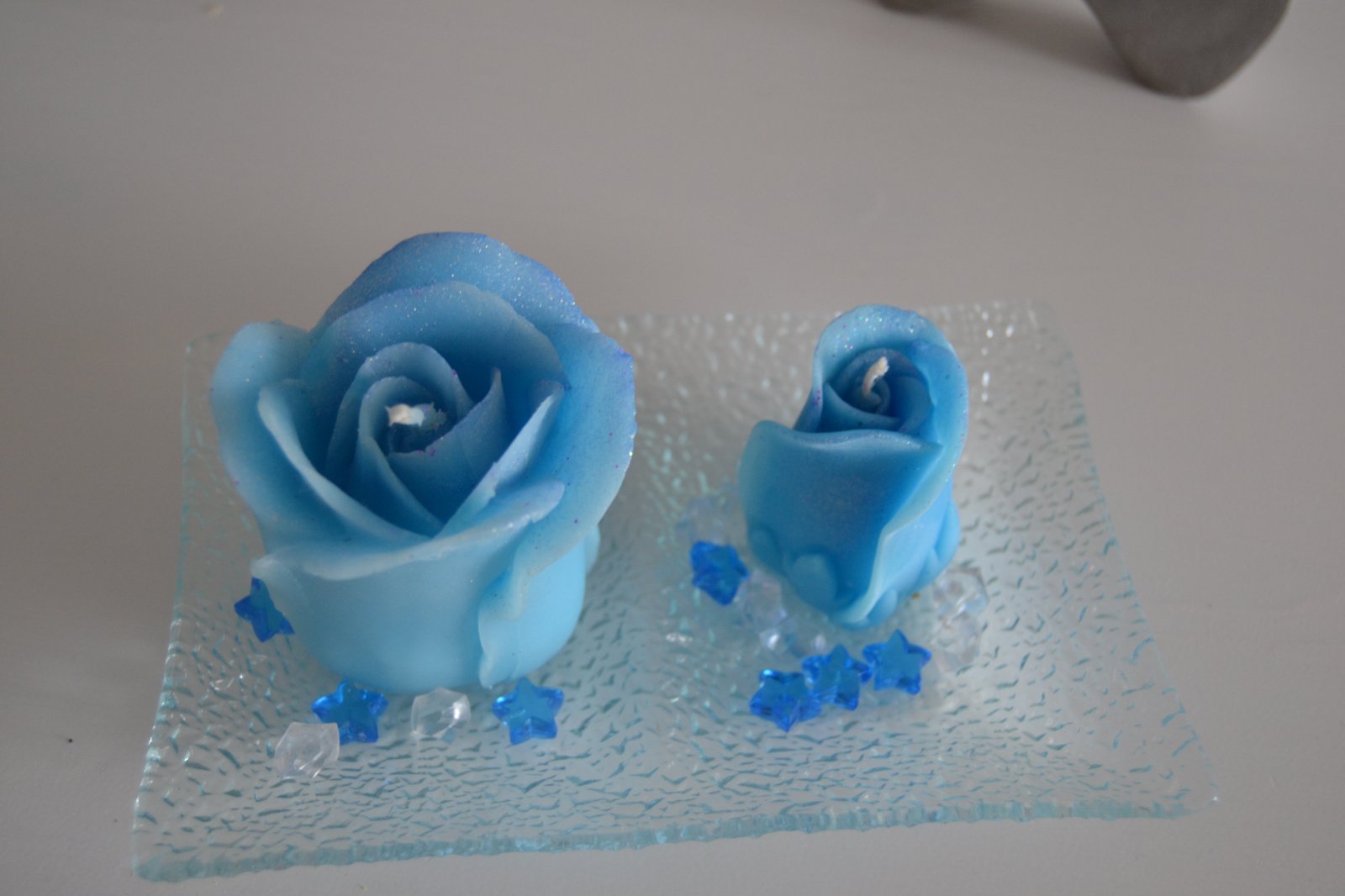 Modré dekorácie: sviečky z parafínu, ručne odlievané a dopracované s prídavkom vanilkovej esencie, so striebornými trblietkami. Farba modrá, rozmer 120x50mm, hmotnosť 200g. Ružička má rozmer 70x40mm, hmotnosť 140g. Oživené modrými kamienkami. Podnos biely kovový a sklenený. Balené v celofáne.