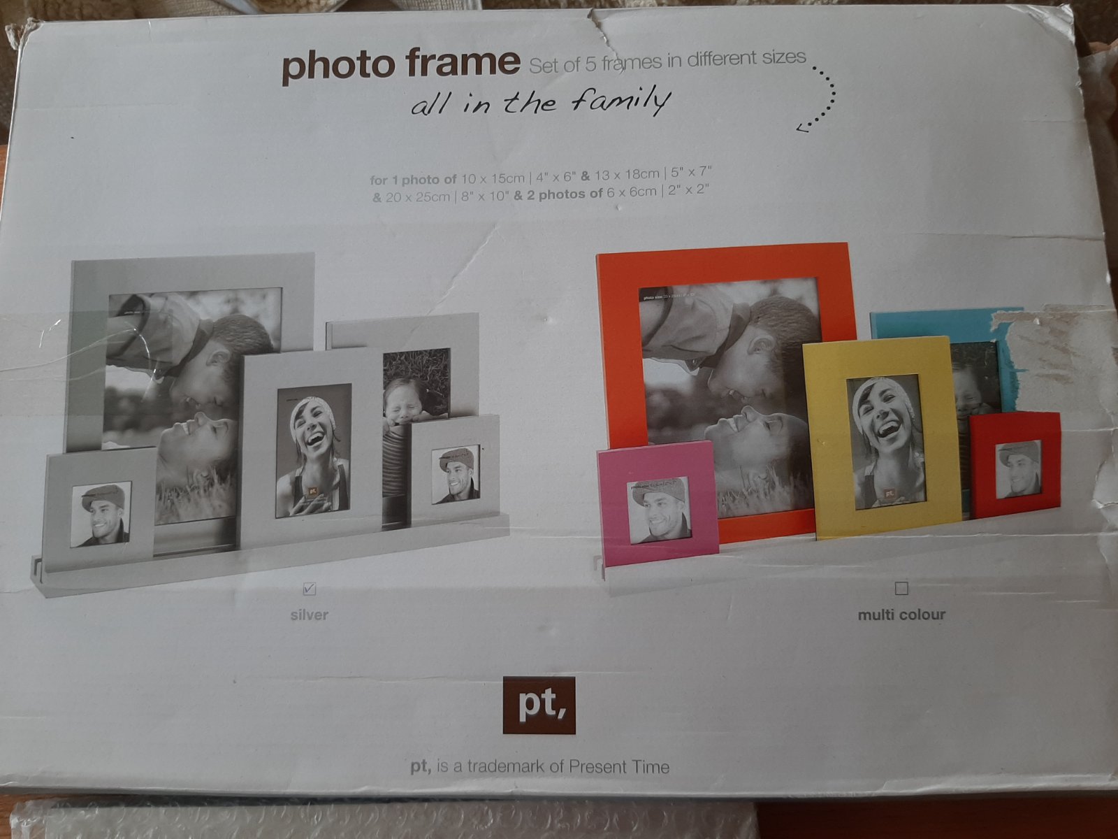 Predám nepoužívaný súbor rámikov na fotografie v striebornej farbe. Je tam 5 rámikov, ktoré sa môžu vložiť do podstavca. V originálnom balení, rámiky neboli vybalené, len krabica je trochu pokrčená.