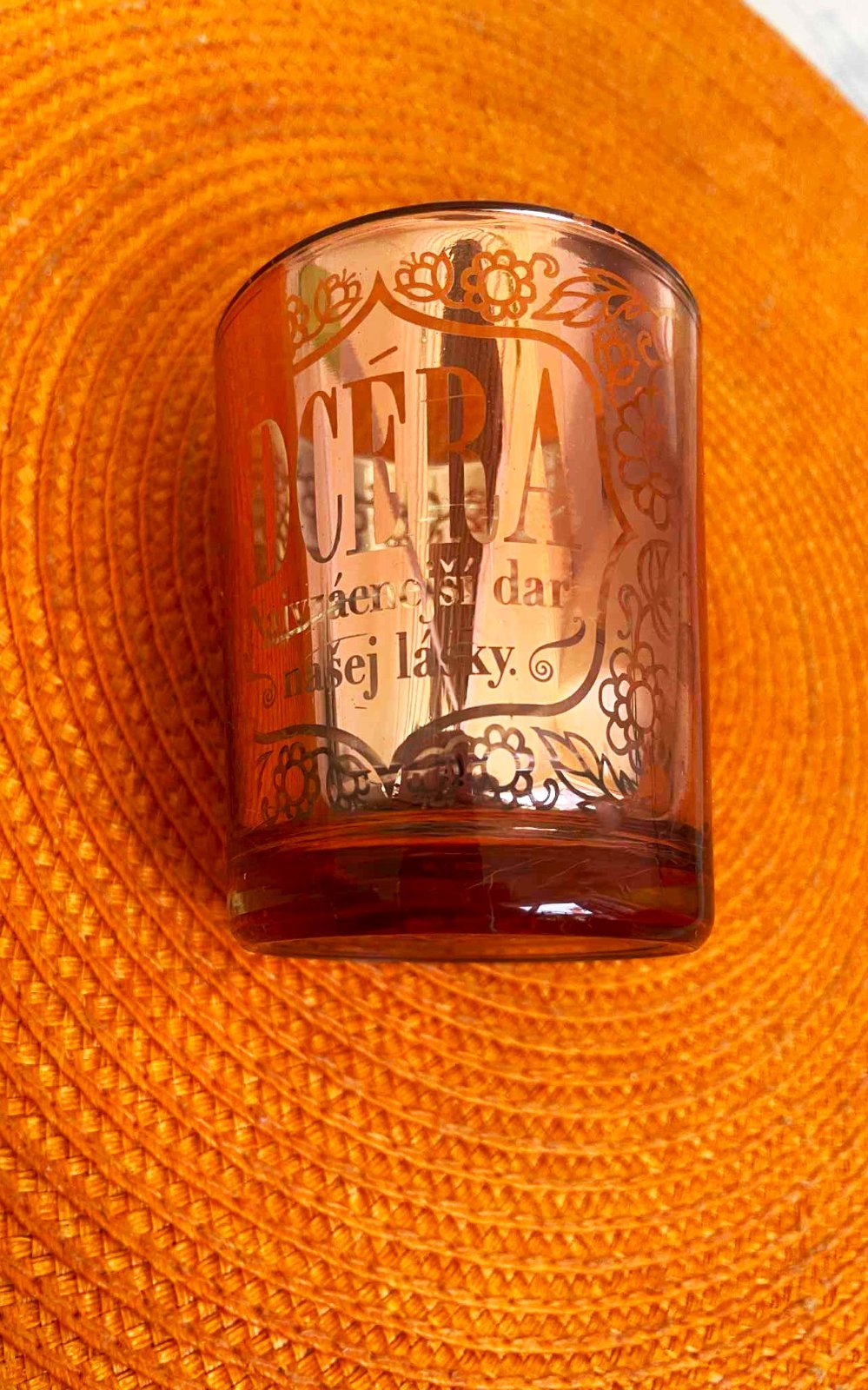 krásny darčekový predmet pre dcéry s nápisom : Dcéra - najvzácnejší dar našej lásky,min. používaný - ako nový, vhodné aj na čajovú sviečku,ale nielen, výška = 7 cm, priemer = 6 cm