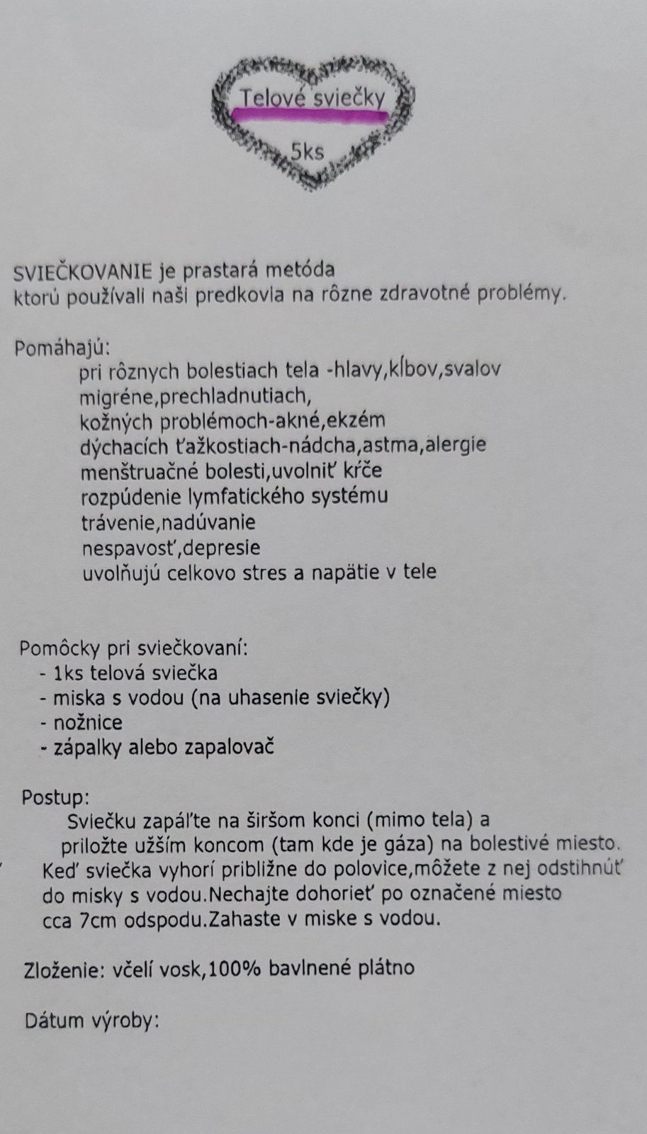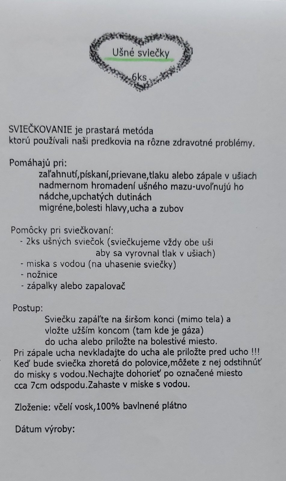 Sviečkovanie je prastará metóda ktorú využívali už dávno naši predkovia.Sviečky sa používali väčšinou pri prievane,zápale ucha alebo zubov. Vtedy stočili noviny do tvaru lievika a zapálili. Teraz sa dá sviečka vyrobiť z plátna a včelieho vosku. Je bezpečnejšia,drží lepšie tvar pri horení a vosk má naviac liečivé účinky. Popis na čo všetko pomáhajú sviečky aj s postupom ako ich použiť nájdete v priložených fotkách. Cena je za 1ks