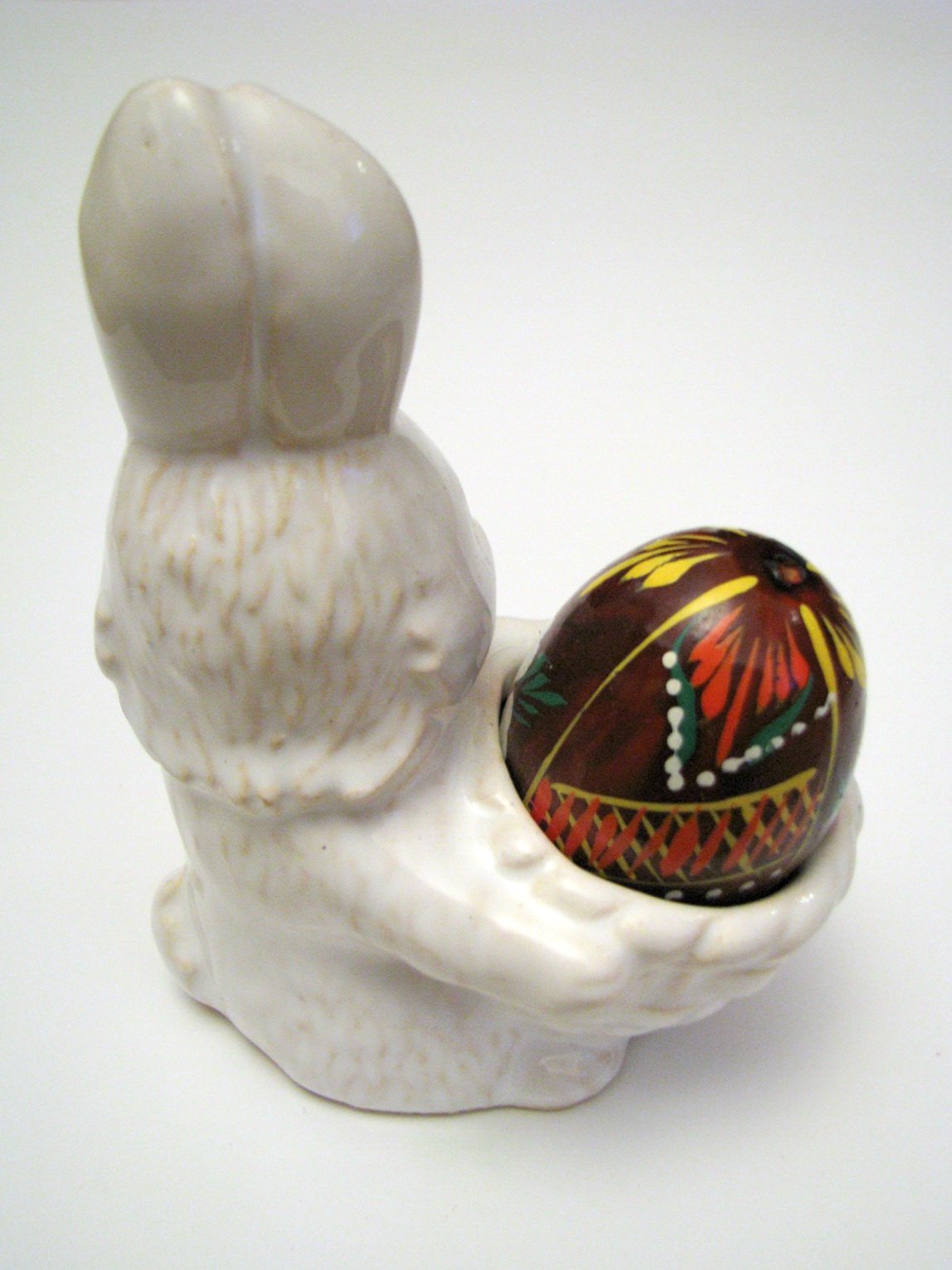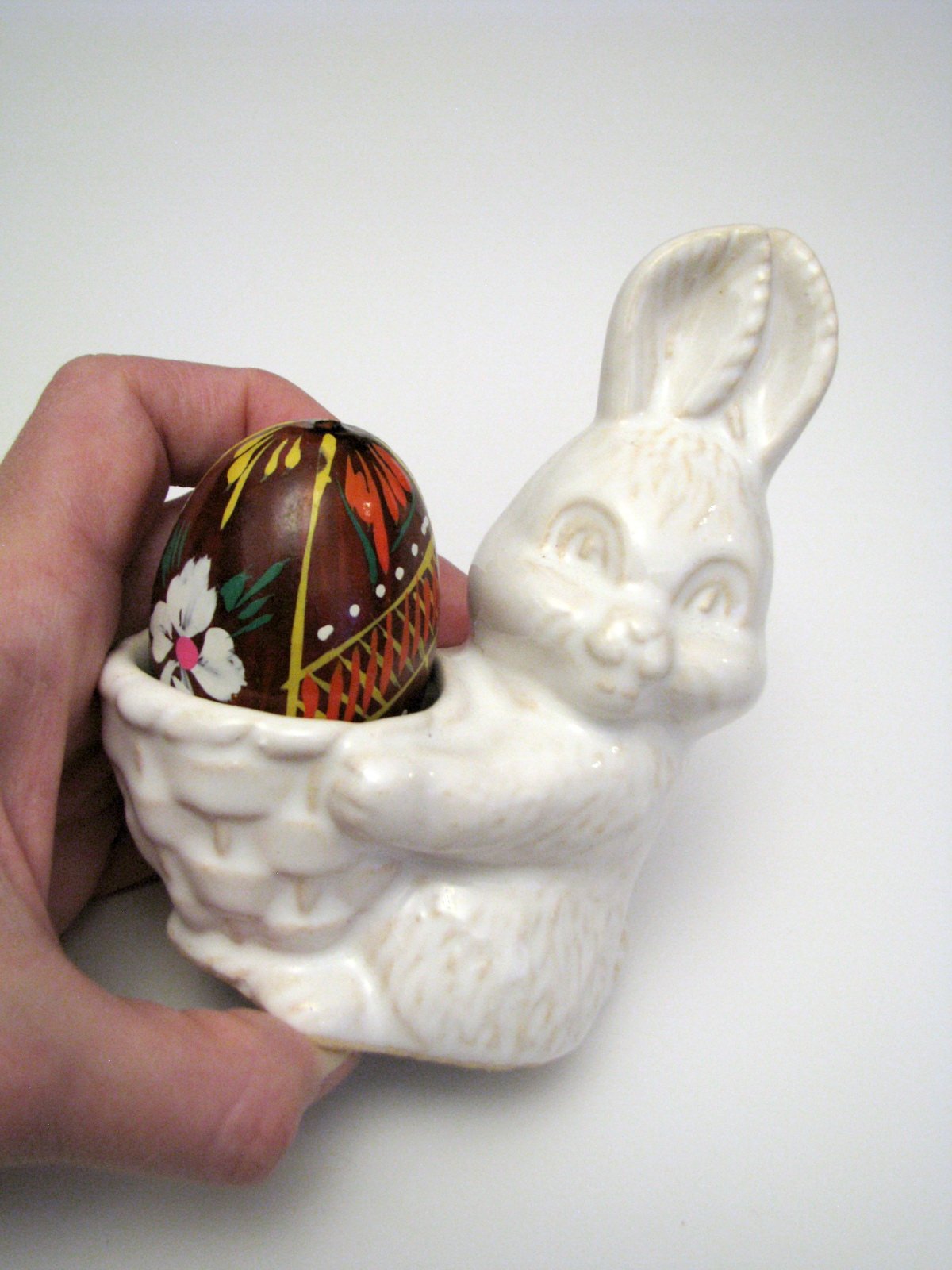 Dekoračná soška - biely vintage keramický veľkonočný zajko s maľovaným dreveným vajíčkom v košíku. Výborne zachovalý, bez poškodení. V prípade záujmu odmeriam.