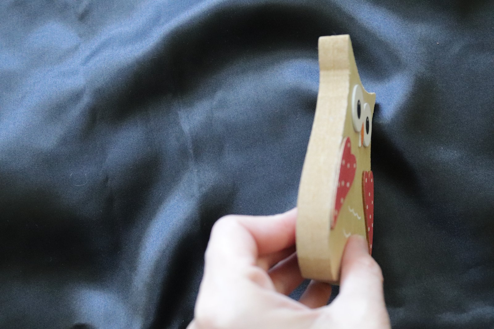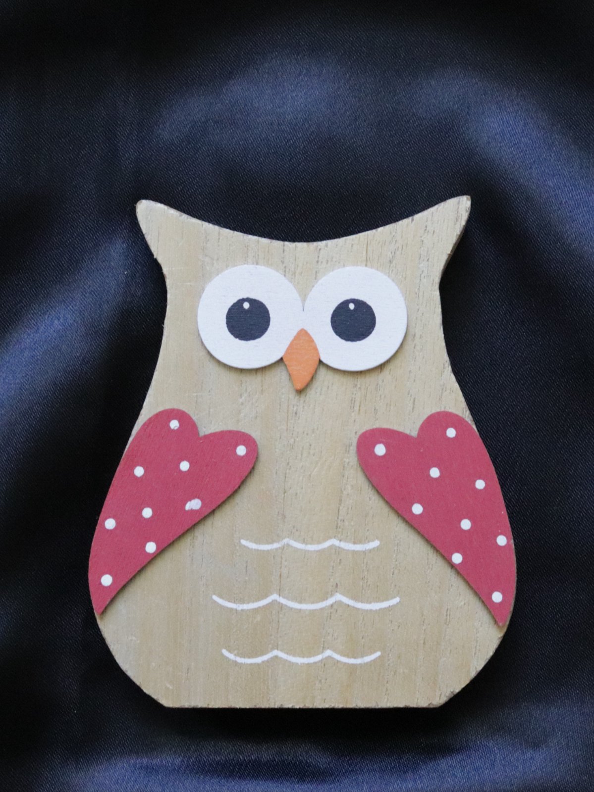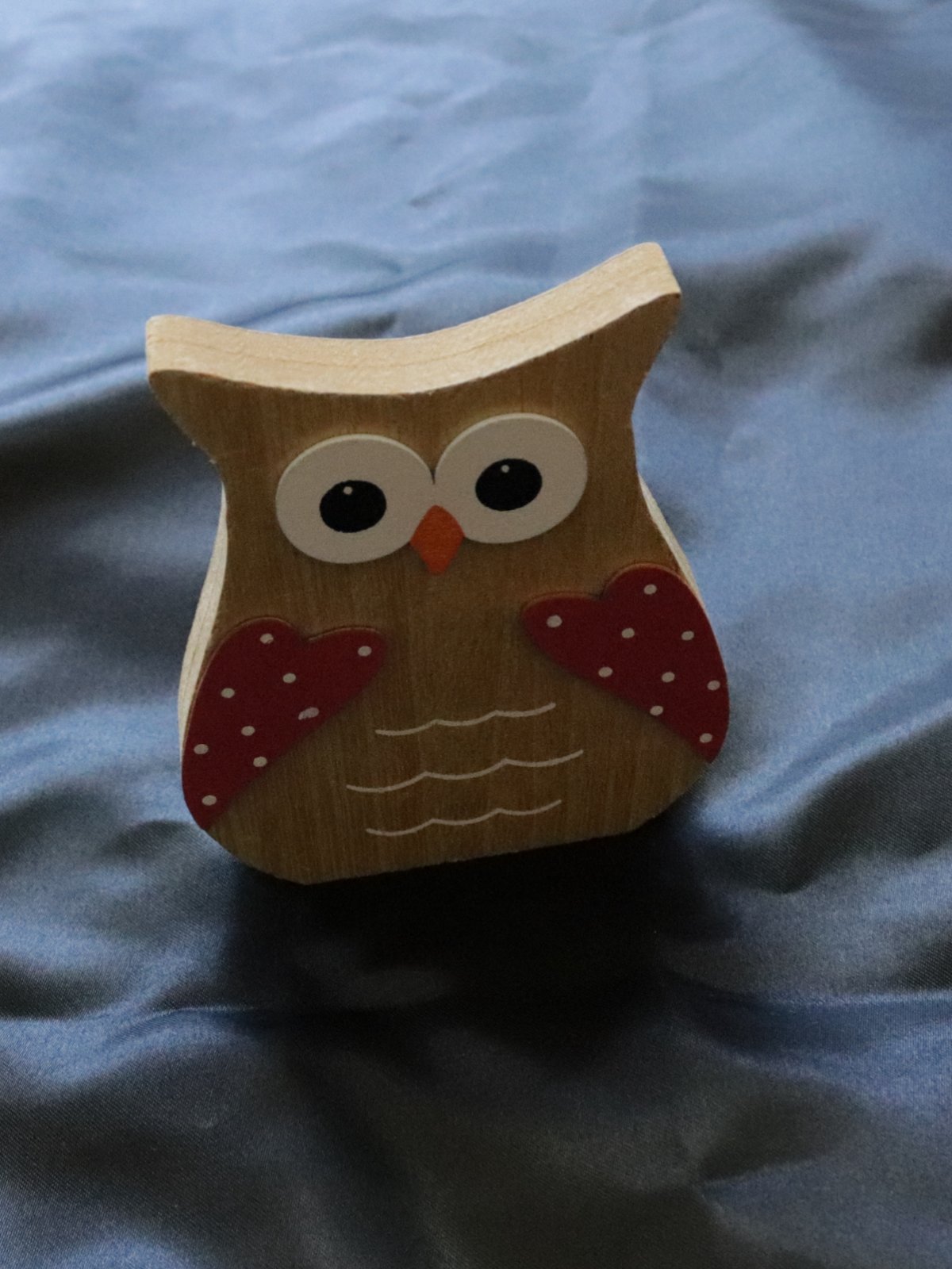 Drevená sova, sama stojí, ozdoba do domácnosti. Výška 11 cm