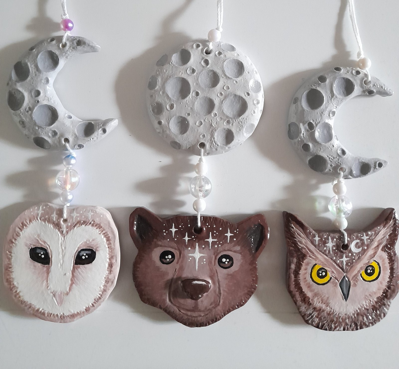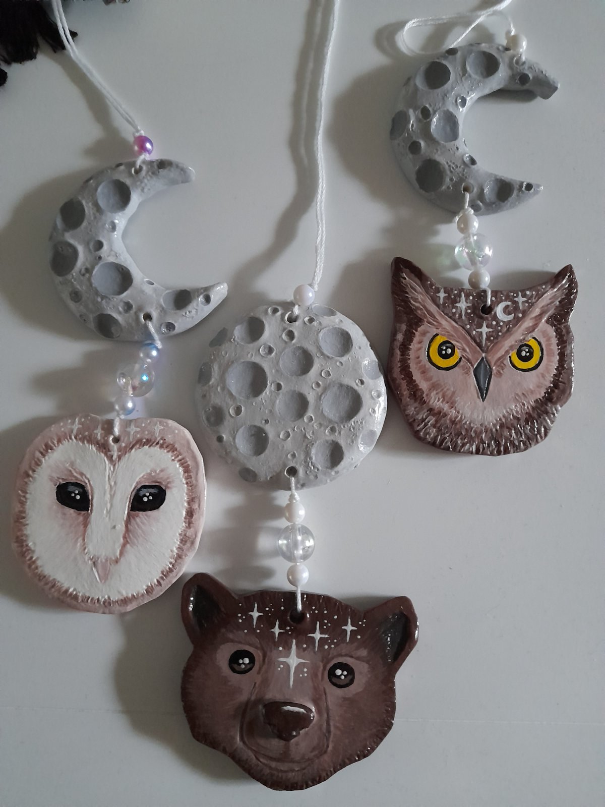 Handmade zavesna dekoracia s mesiacom. Sova vyr skalny, sova plamienka alebo medved. Vyrobene z hliny tvrdnucej na vzduchu. Malovane akrylom. Osetrene lakom.