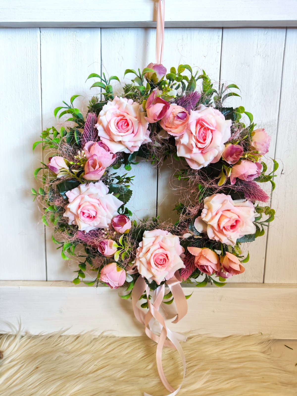 Slamený základ obalený stuhou, krásne ružové ruže, doplnené ranunculusom a ružovými šiškami.